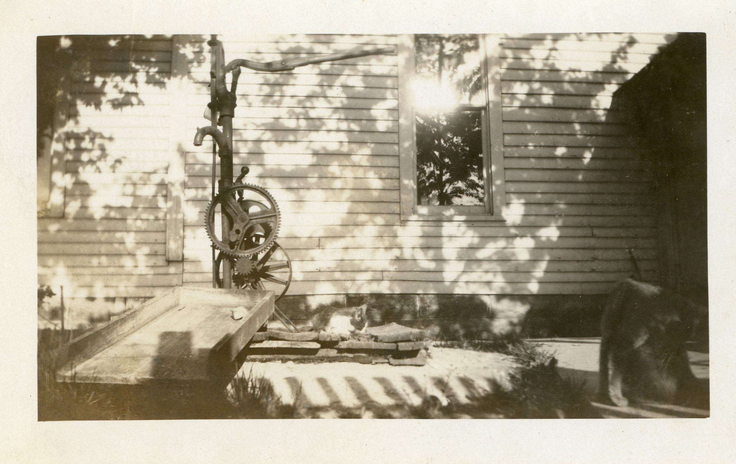 A black-and-white snapshot of a water pump with gears at the side of a house.Photograph Details