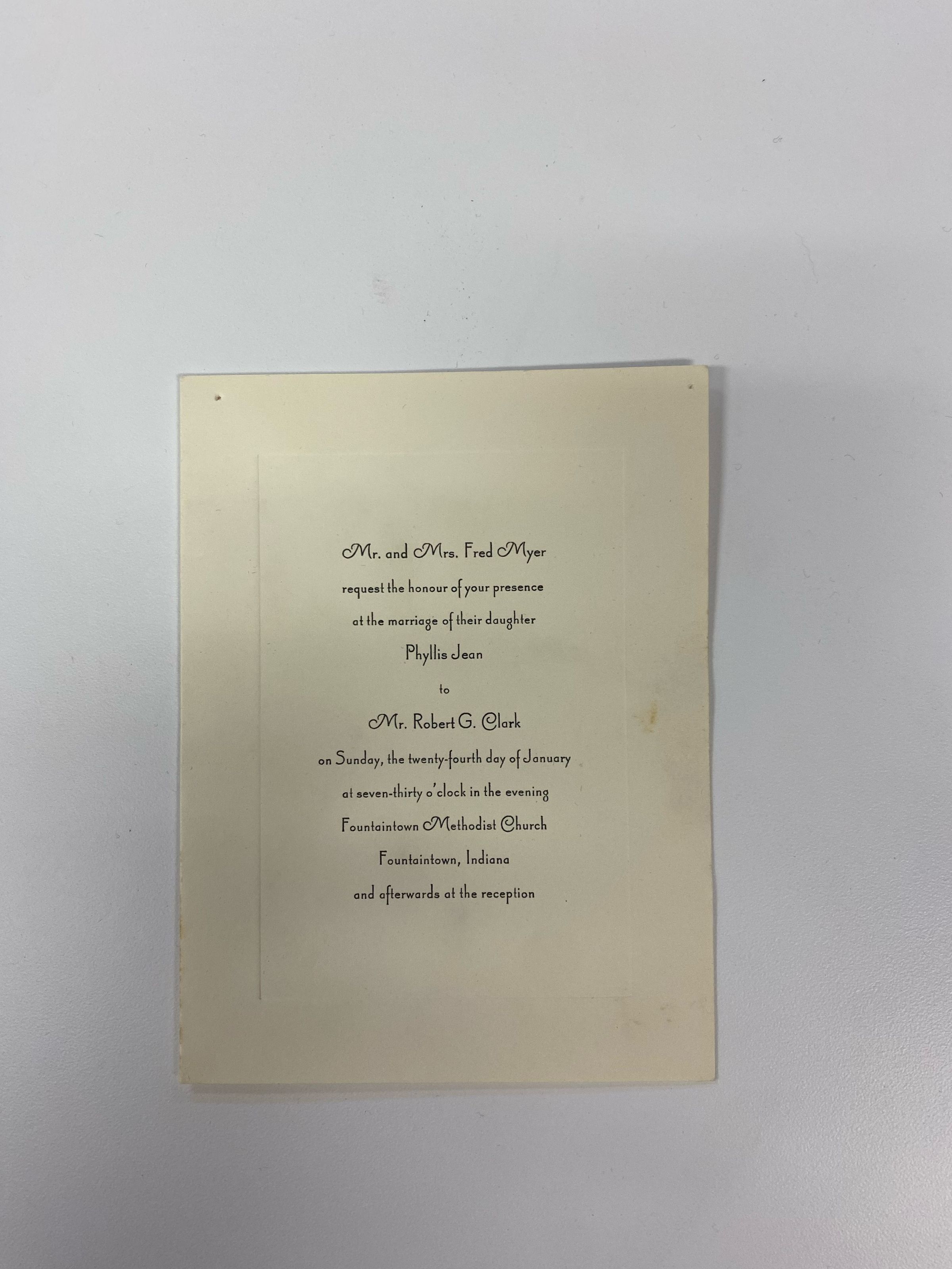 A wedding invitation for the Jan. 24, 1954 wedding of Phyllis Jean Myer and Robert Gene Clark at the Fountaintown Methodist Church.
