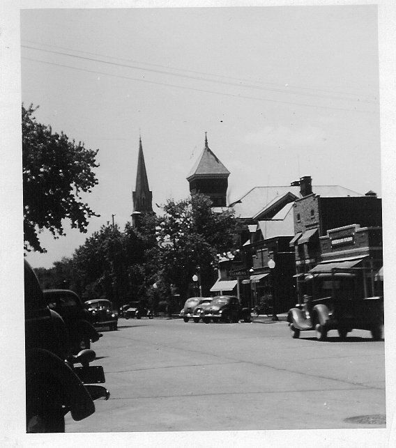 Black and white glossy photographic print in portrait format. In pencil on back: "View from front of /First Baptist Church" which is on the south side of W. Broadway, Shelbyville, IN. Image is of the view looking west. Autos, street lights, store fronts. Far right is Orebaugh Studio. Left of it is Plymate Cleaners. Left of Plymate is Cossairt Florist. The towers of the high school building and the First Presbyterian Church are visible above the tree line.Collection