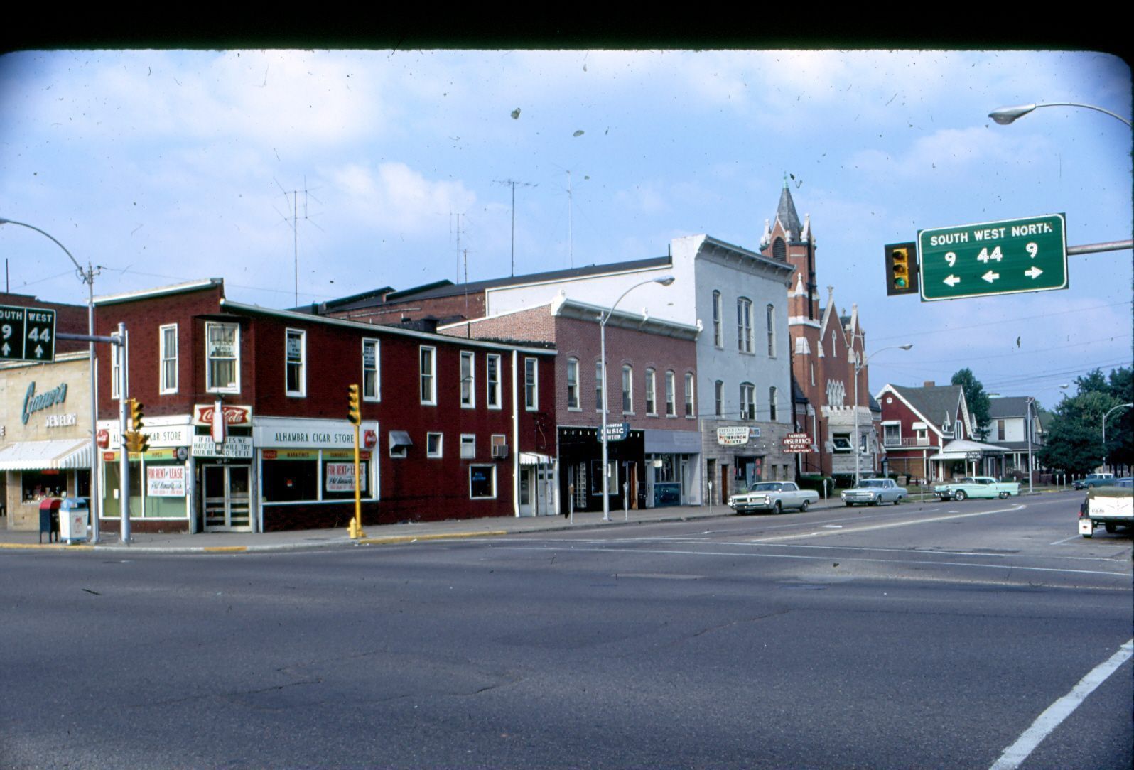 Image is of West Broadway Street showing Connor's Jewelry and the First Baptist Church.Collection