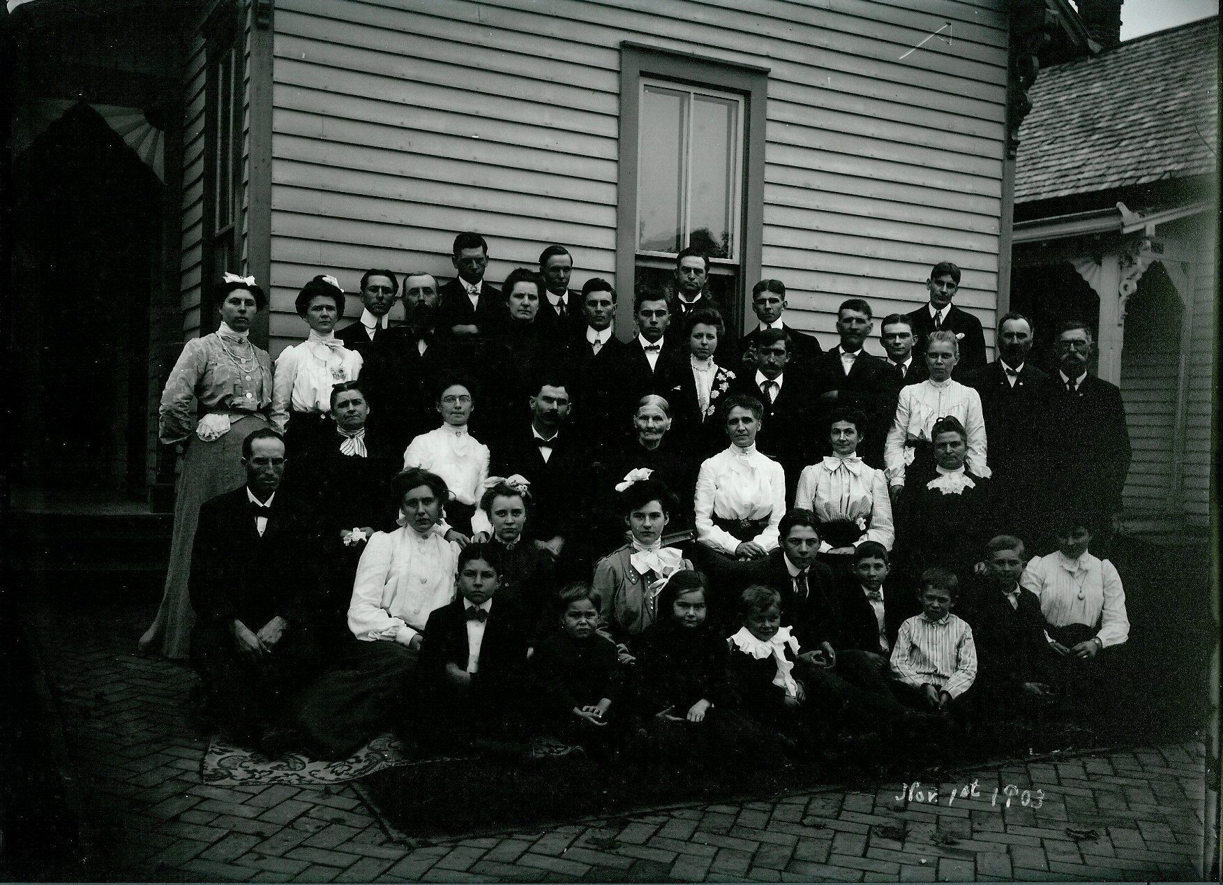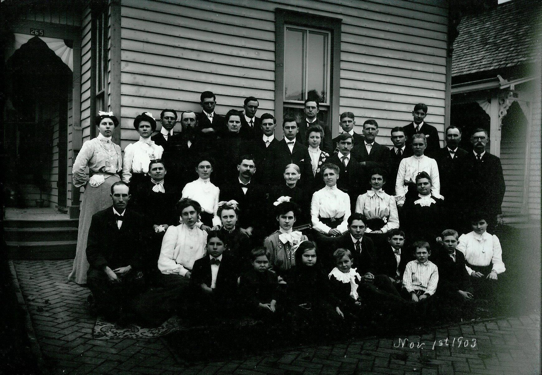 Black and white glass-plate negative of 39 people photographed outside a frame house. House number on porch reads "265". Brick sidewalk in front of group and leading to house. One row of people is sitting on a rug on the ground. Neighboring house visible on right side and is numbered "269". Photographer has written "Nov. 1, 1903" onto the image of the brick walk. There are two negs, A & B, of same pose. Prints made 2/2004.Collection