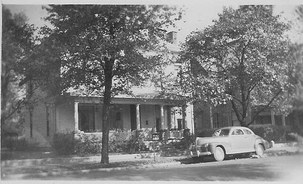Donation, 07/26/2005. Black and white glossy photographic snapshot print in landscape format. Image is of a two-story house with a porch. Auto is parked at the curb. Trees between curb and sidewalk. On back in black ink: "Oct./1941/Snapshot by/Jess.E.Meloy" In pencil: "219 West Franklin St./Shelbyville".Collection