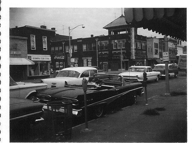 Black & white snapshot; west side of corner of Harrison & Broadway; buildings visible Connor's Jewelry, Alhambra Cigar Store, Kracht's, Diana Shops, Haag Drugs; parking meters & trash barrel on sidewalk; upper right corner has part of window awning visible; dark convertible (possible a Buick or Oldsmobile) parked by walk has woman driver wearing white frame eye glasses; vertical edges scalloped.