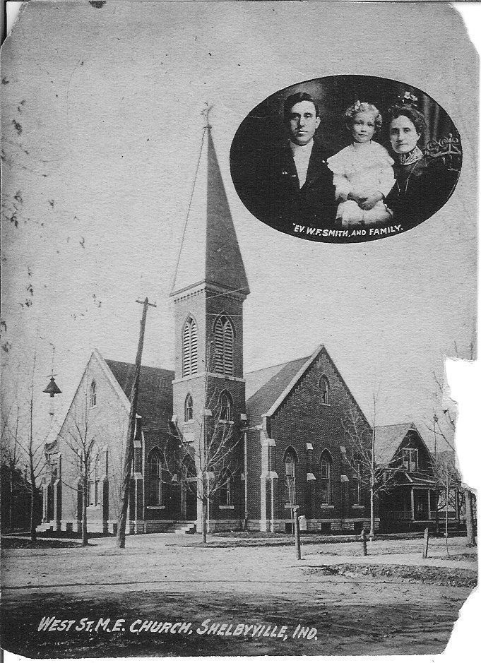 Black and white print in portrait format. Image is of a church with a tall bell tower. Upper right corner, in a landscape format oval, is an image of "Rev. W. F. Smith and Family" showing his wife and daughter. In white print across bottom edge is "West St. M. E. Church, Shelbyville, Ind."Collection