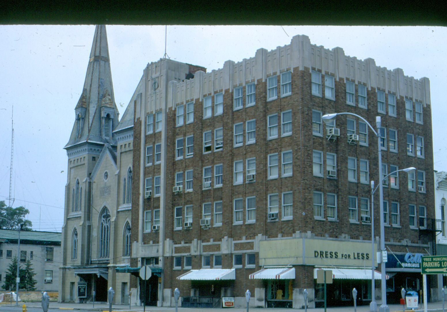 In image on right is the Dress For Less store and on the left is the Methodist Building. In ink on slide frame: "looking W. from P.S. showing North Side."Collection