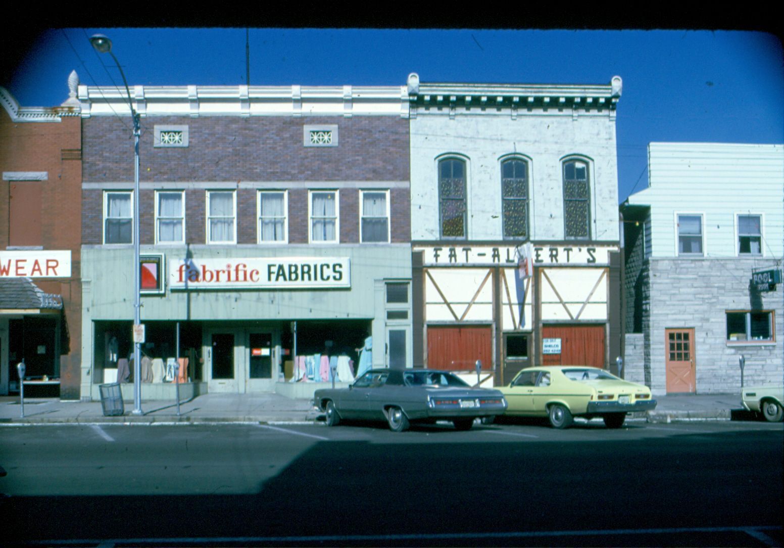 Donation, 07/26/2005. Color photographic slide in landscape format. East Washington Street, North side showing West's Men's Wear, Fabrific Fabrics and Fat Albert's.Collection