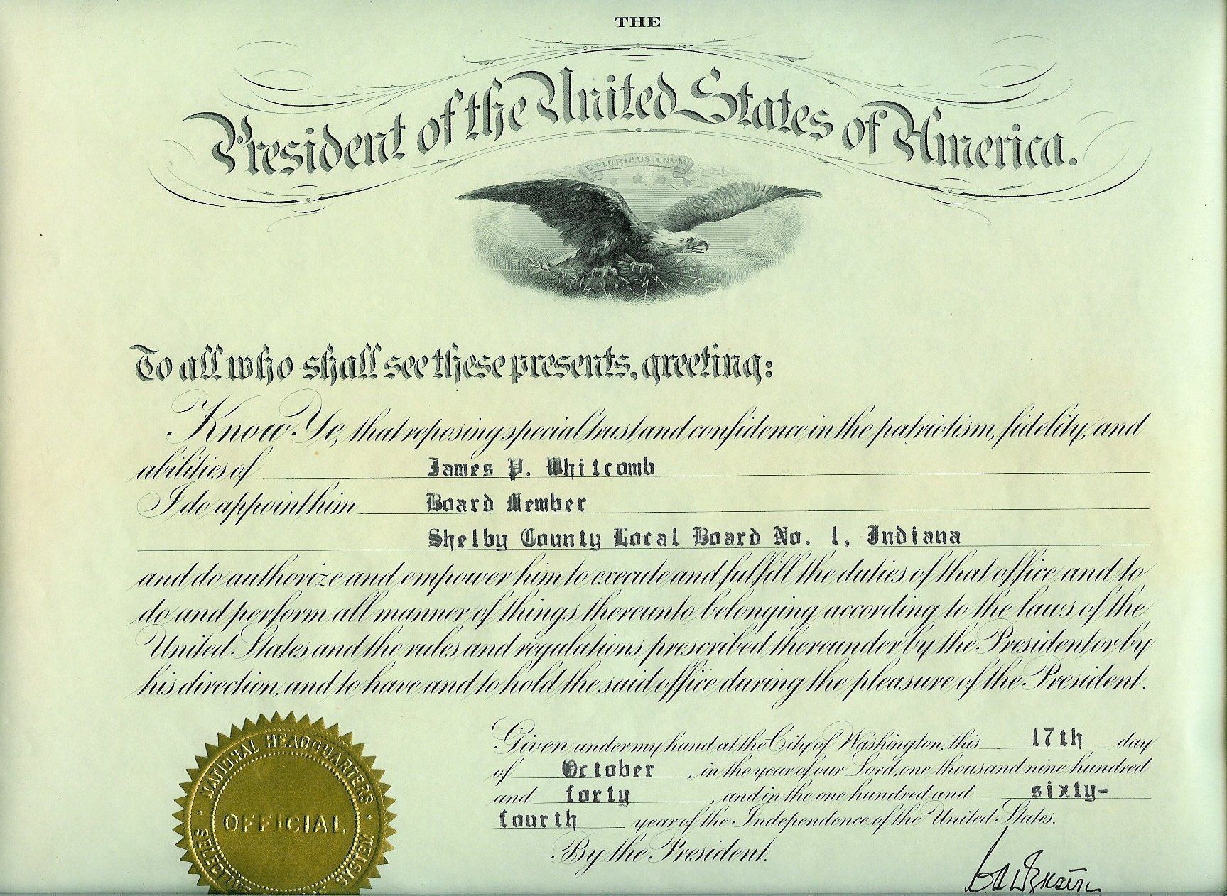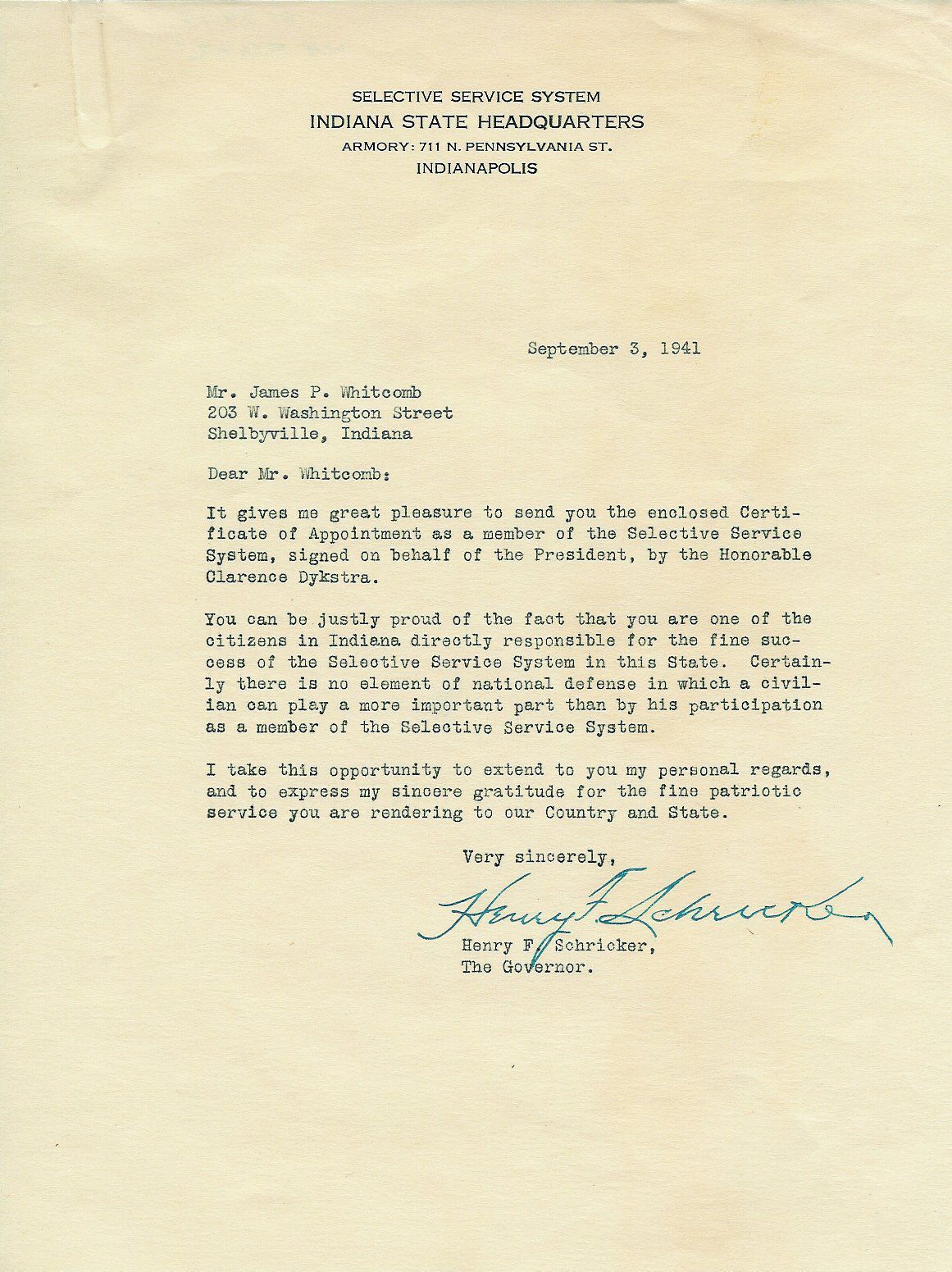 Letter 8 x 10-1/2 from Henry F. Schricker, Goveror to James Whitcomb informing him of appointment to Selective Service System. Certificate from the President of the United Staes signed by the Director of Selective Service..