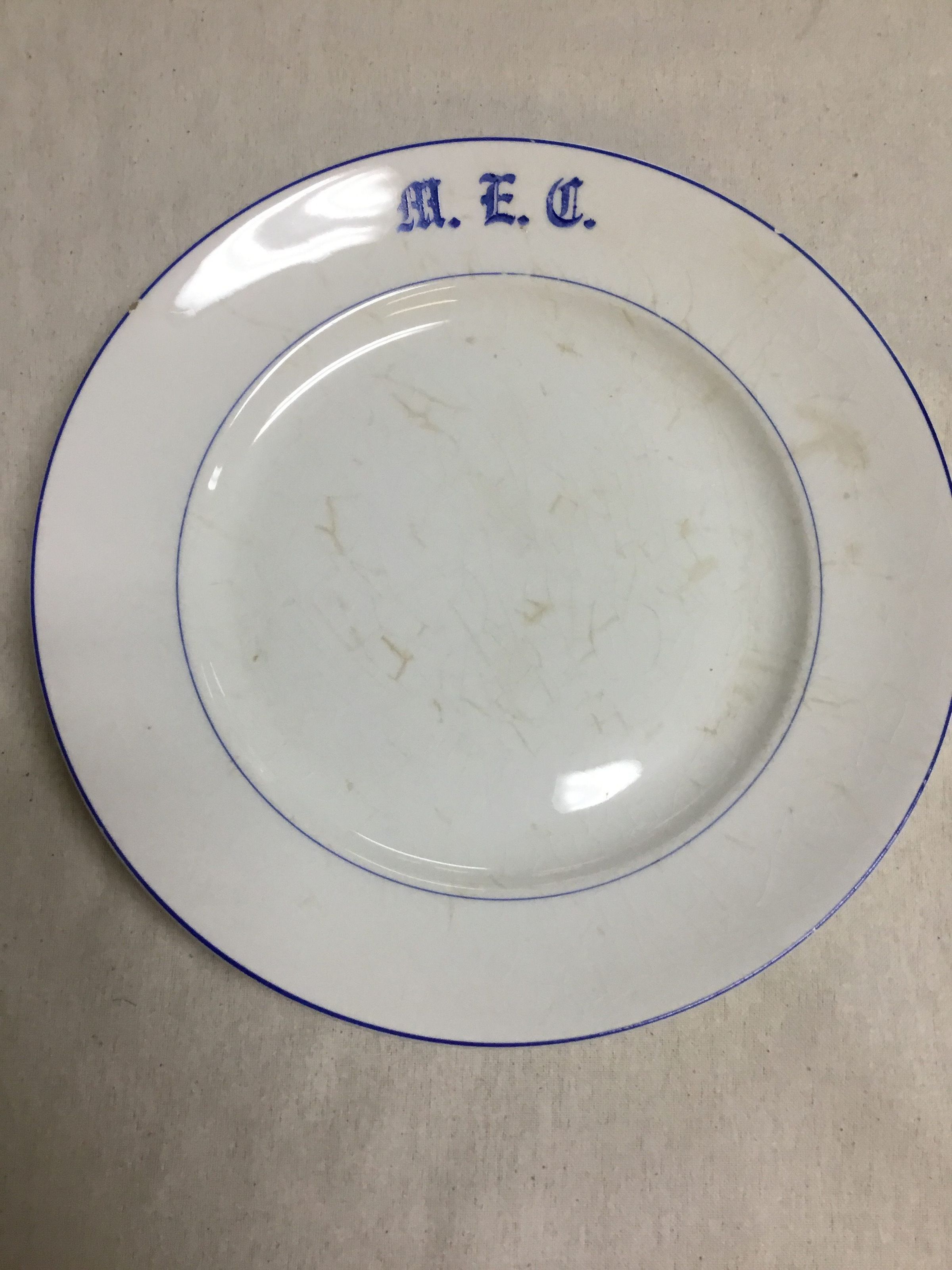 White plate with blue trim on edge and center. “MEC “ in blue near outer rim.Context