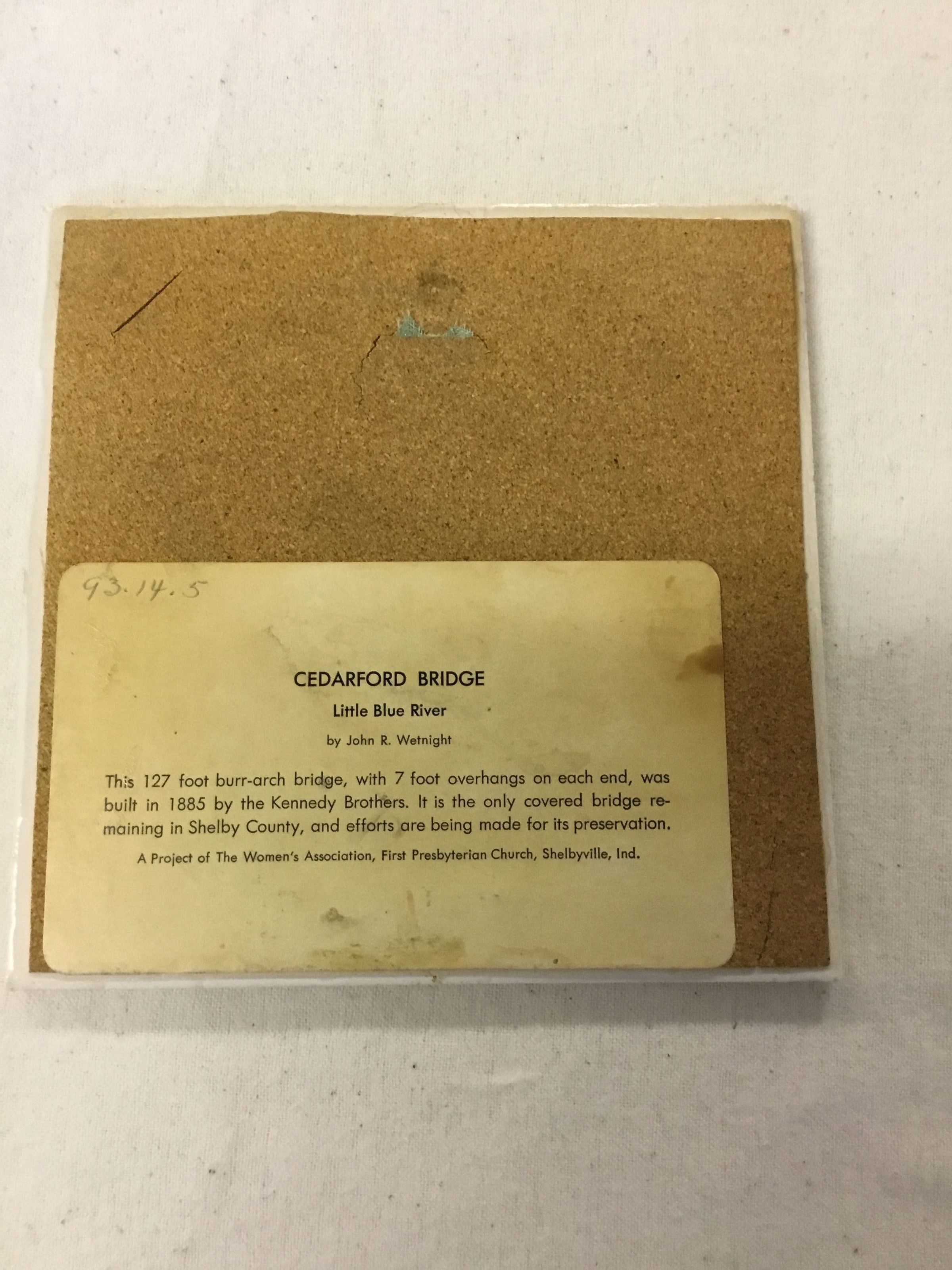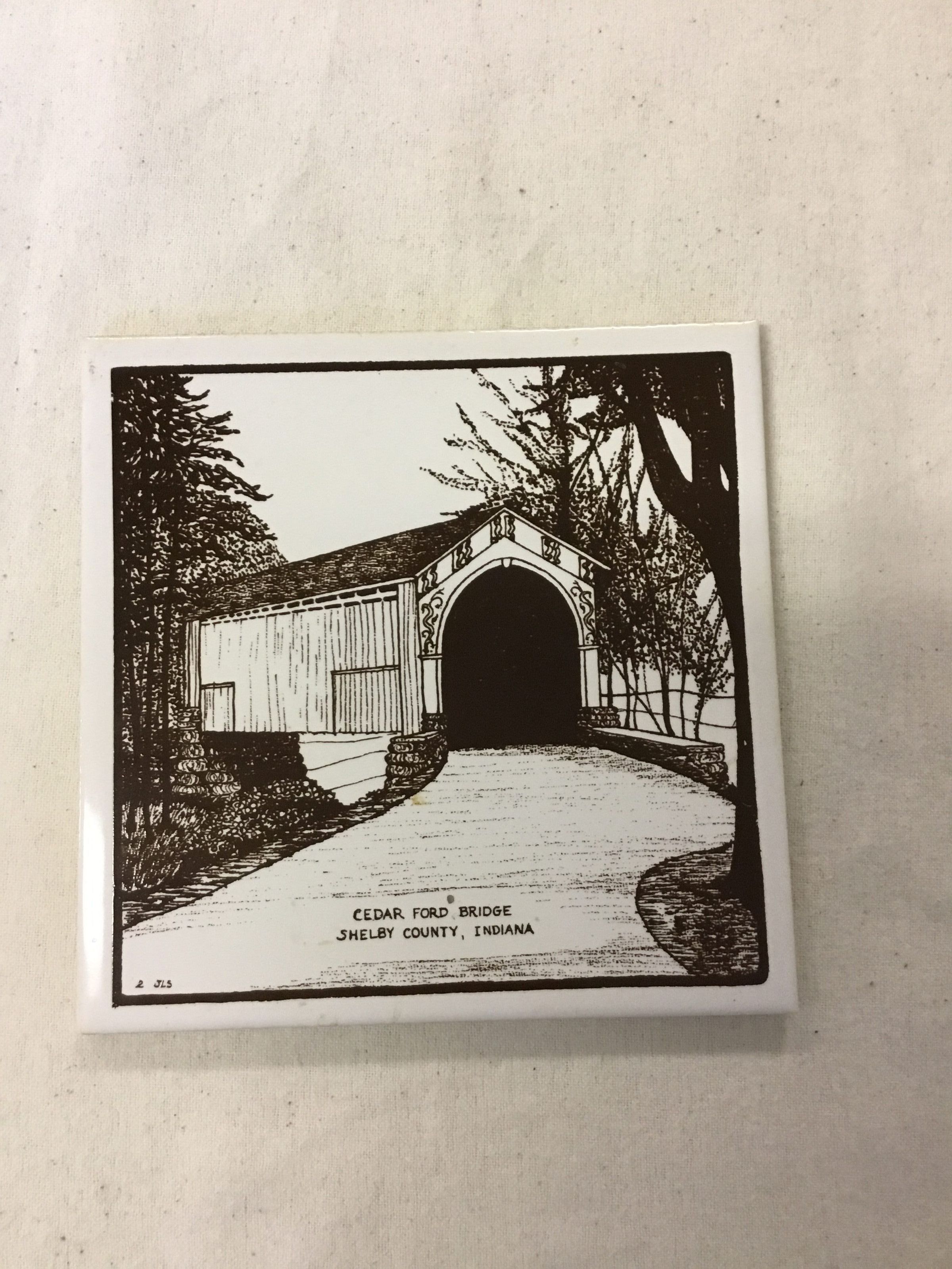 Tile, commemorative, ceramic, white with brown printing. Marked: "Cedar Ford Bridge/Shelby County, Indiana." Signed: "JLS". Scroll work around & across the top of the opening of the bridge, curving road leads to the bridge. Comments on back.Collection