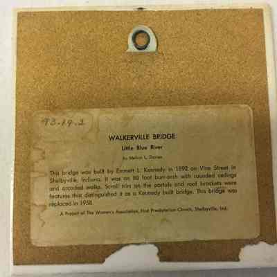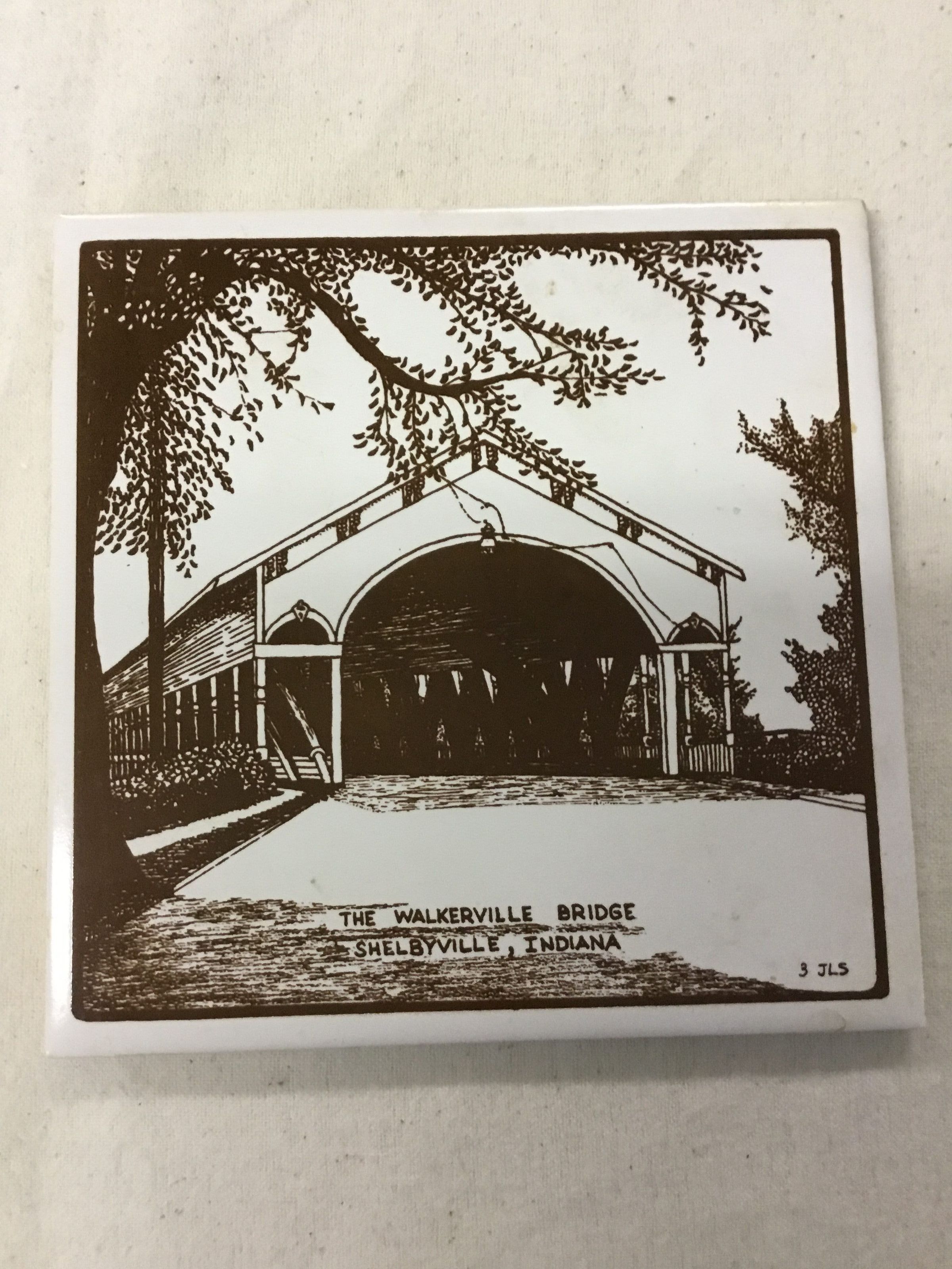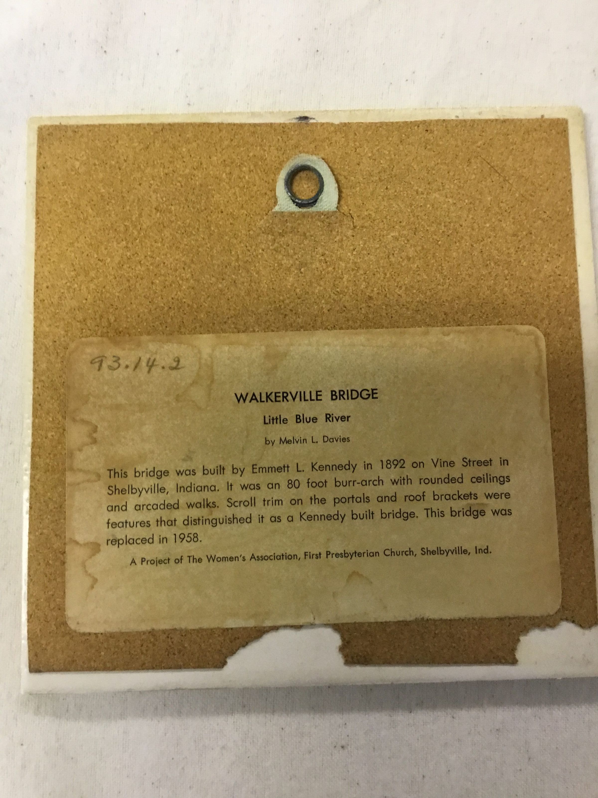 Tile, white with brown printing. Picture of Walkerville Bridge, limbs with leaves hanging over bridge. A walkway on each side. Signed: " JLS". A cork mat and hanger on back. History by Melvin L. Davies.Collection