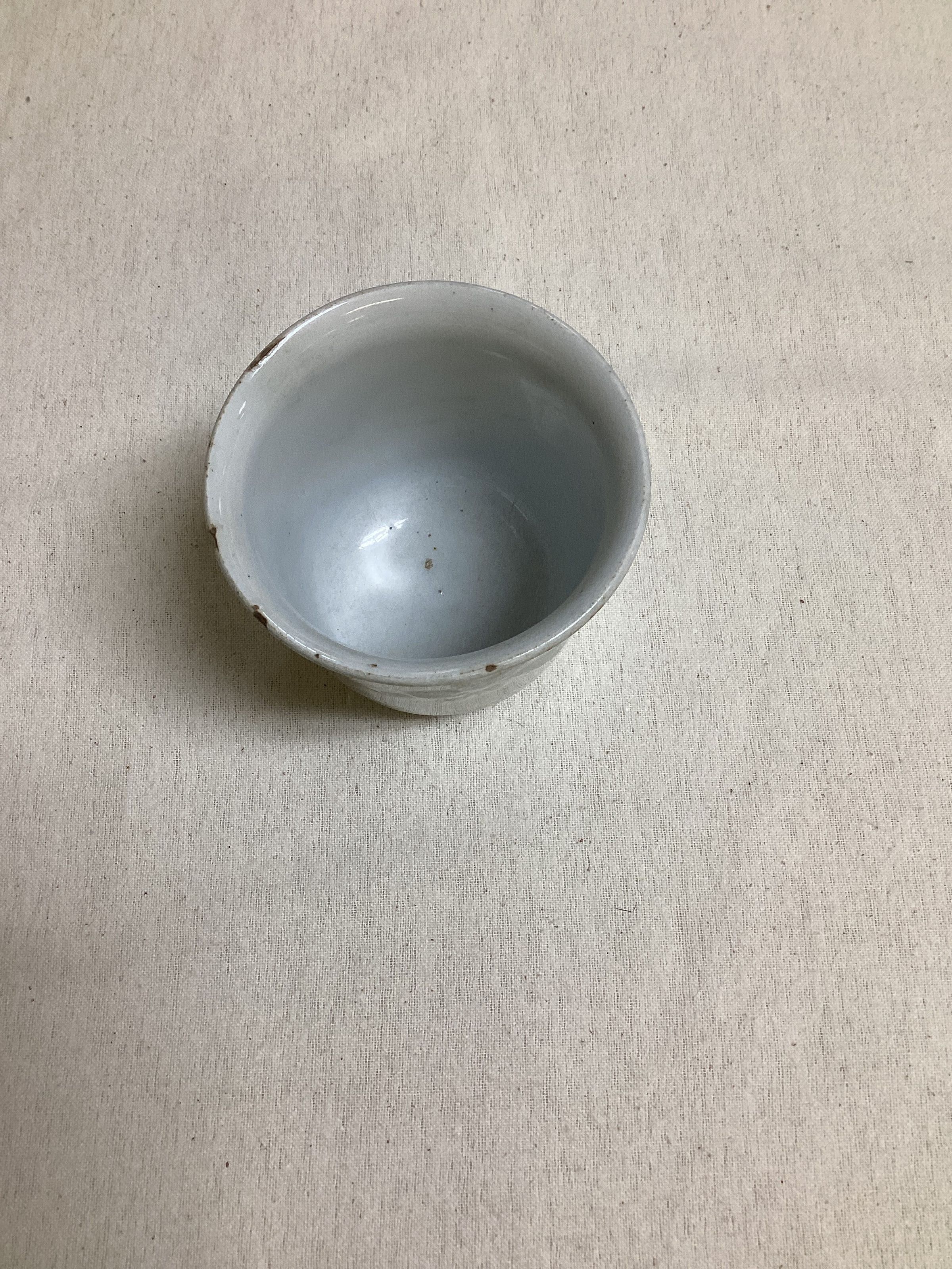 A cylindrical vessel, white in color; a raised rope-like decoration circumscribes the top edge; below that are three raise floral decorations spaced equidistant from one another; cup gradually narrows to 1 3/4" base.Collection