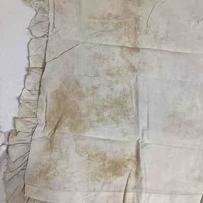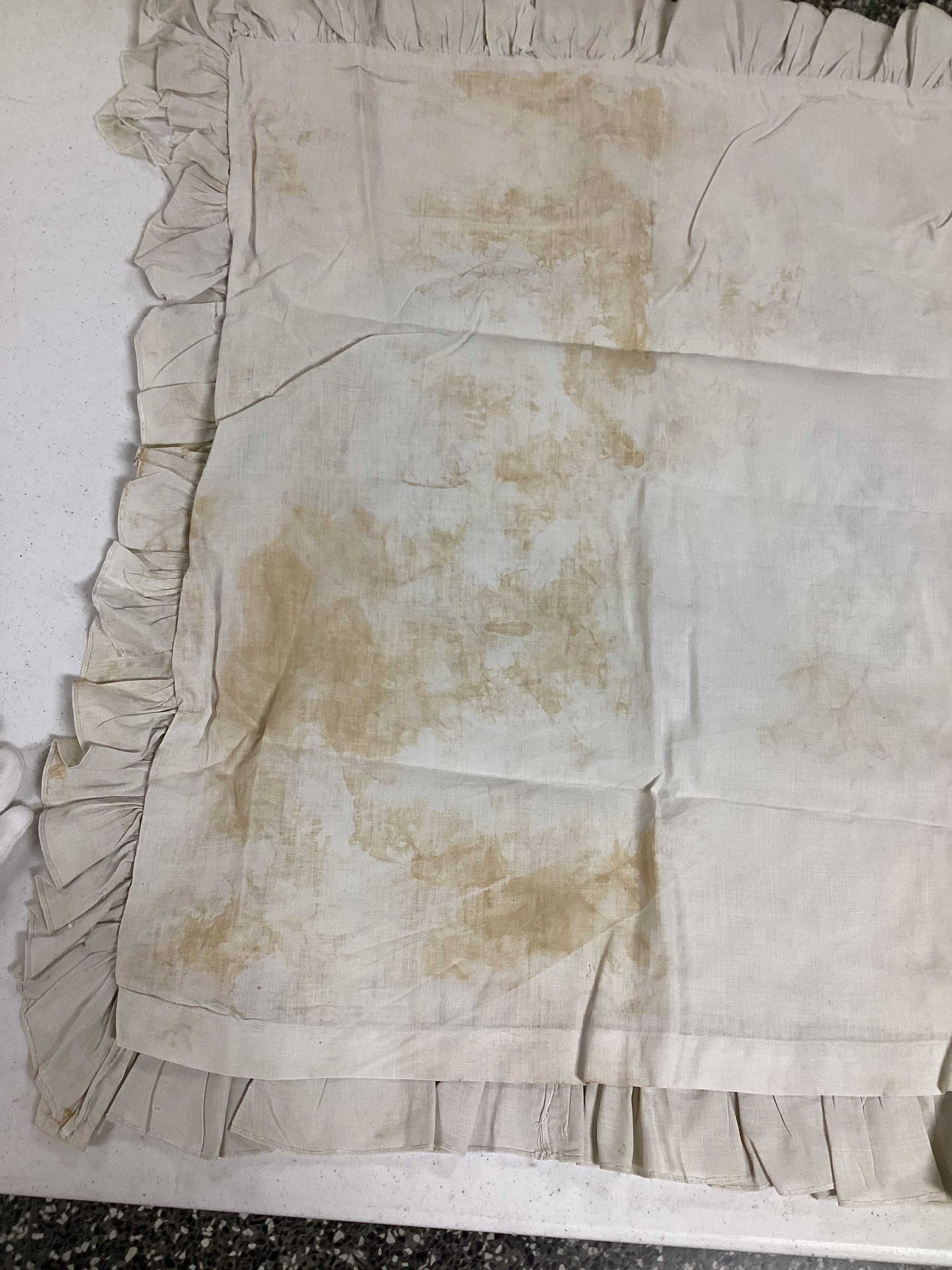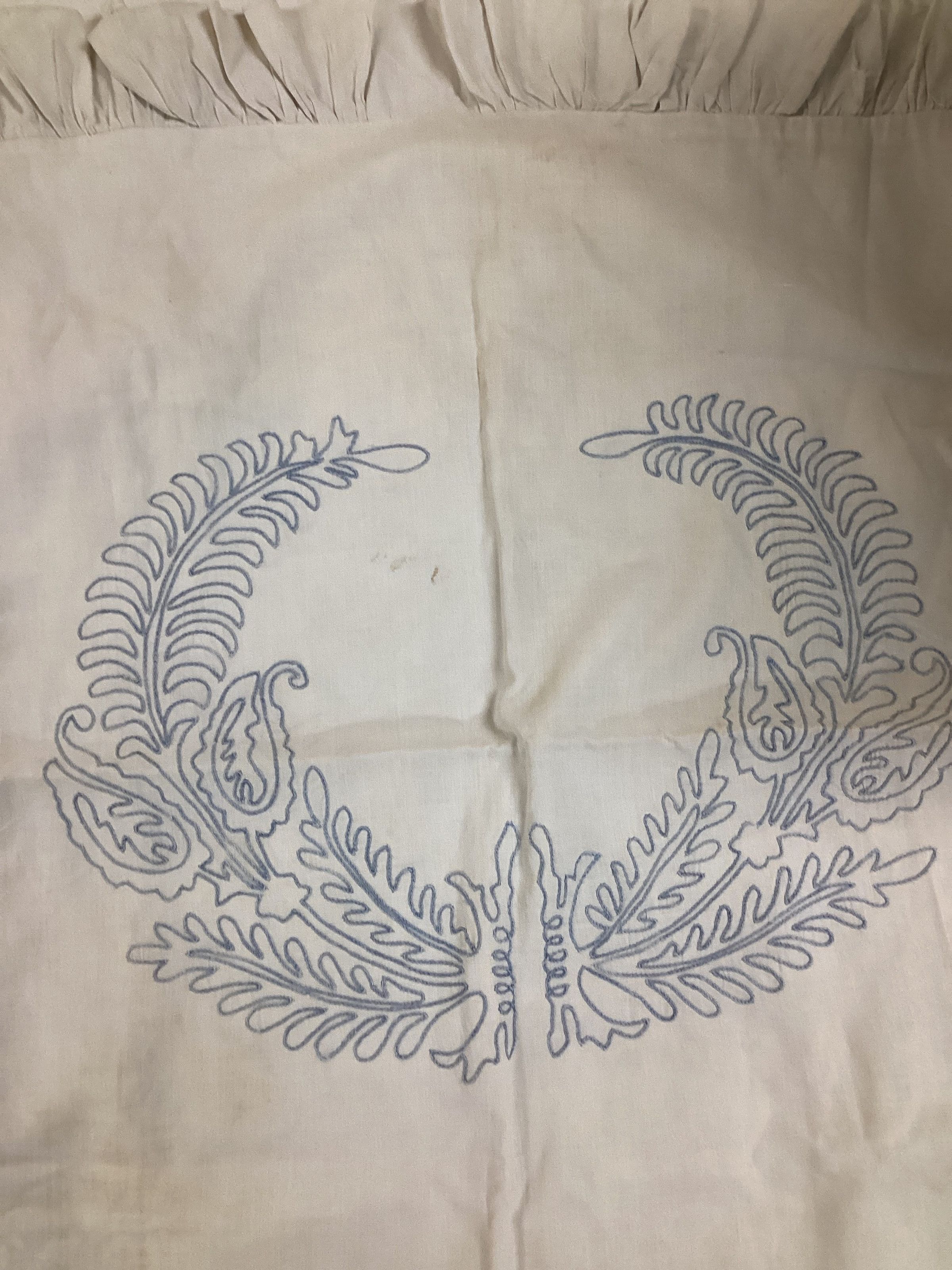White cotton with blue hand embroidered feather like design; 2 1/4" ruffle on all sides.- 24" x 21"