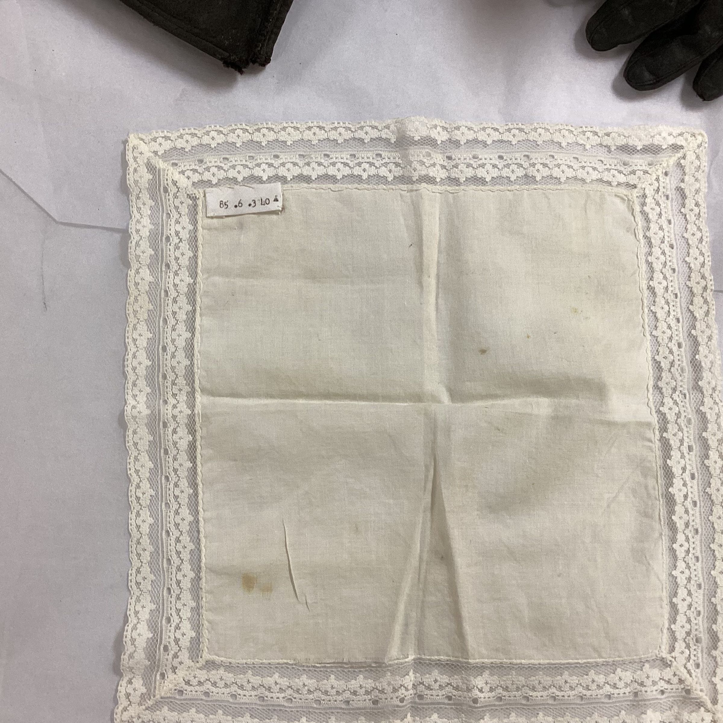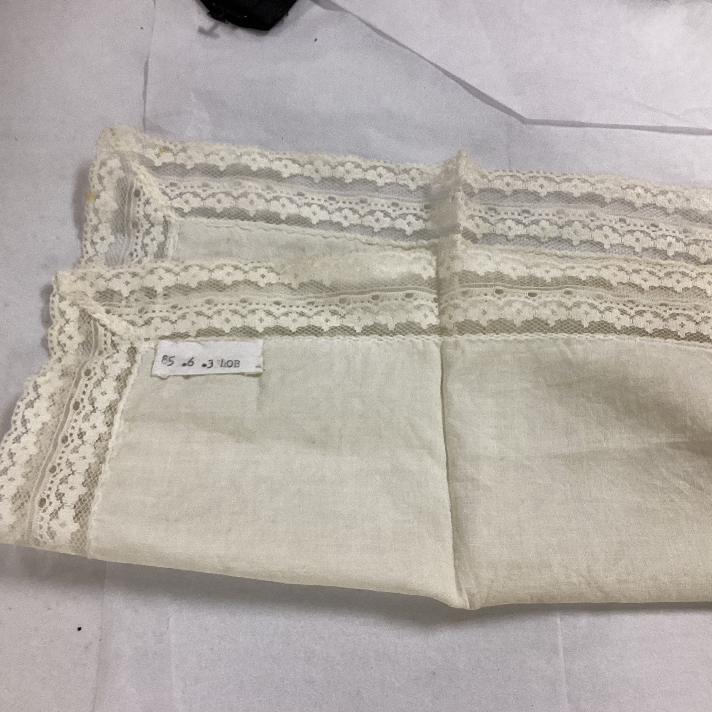 Ladies cotton handkerchiefs, hand sewn white cotton with 1 1/4" lace edging; two rows of lace medallions in pattern, mitered corners. Each 10" x 10".