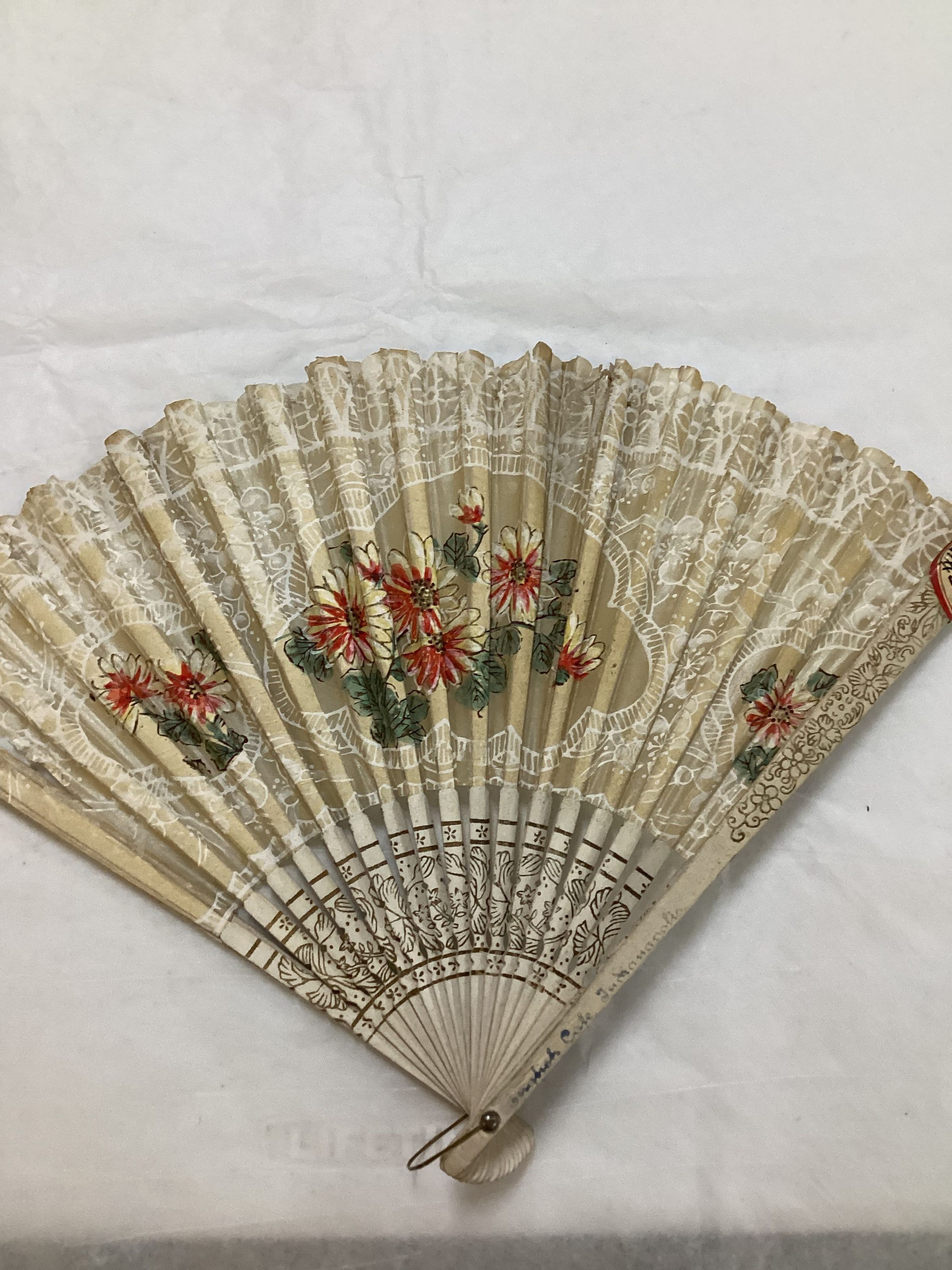 A flat wedge-shaped collapsible device; 23 reeds are threaded on a metal pin; a metal loop handle is attached to the pin; reeds are white and have a gold floral design in a 1 1/2" band; above the design, a folded translucent paper is glued to each reed; background is a white floral design; major design is in three areas of red and yellow flowers with green leaves.Collection