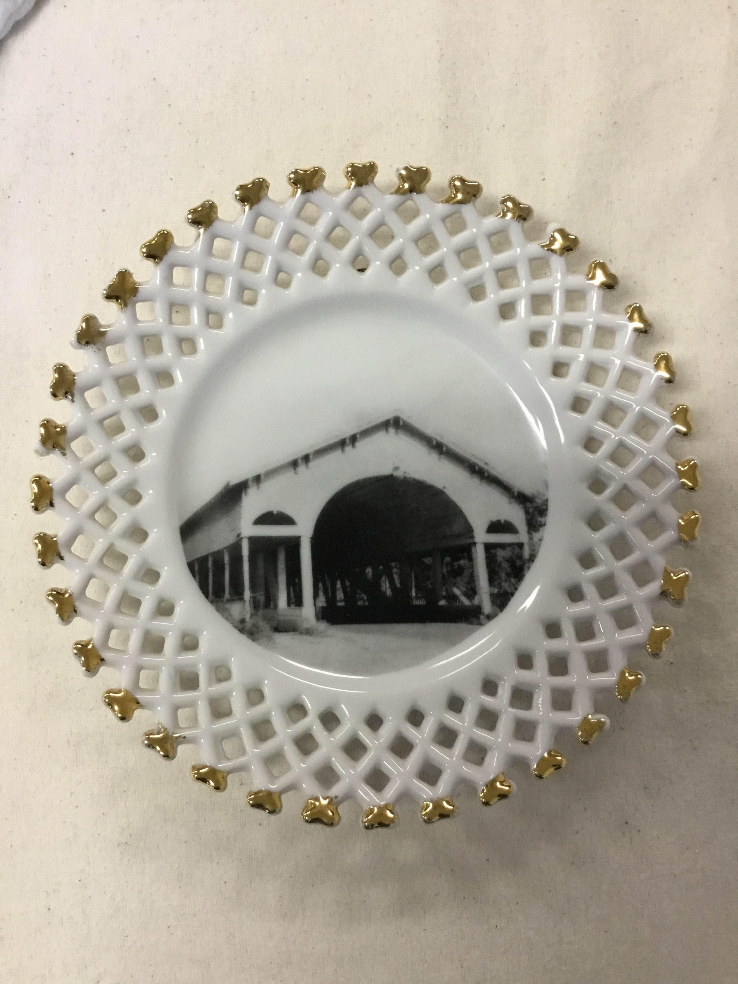 White glass with lattice-work around edge. Gold paint on very outside edge. A picture of Walkerville Bridge in center of plate. On back written in gold "Walkerville Bridge, 1892-1958, Shelbyville, IN, L. WolfCollection