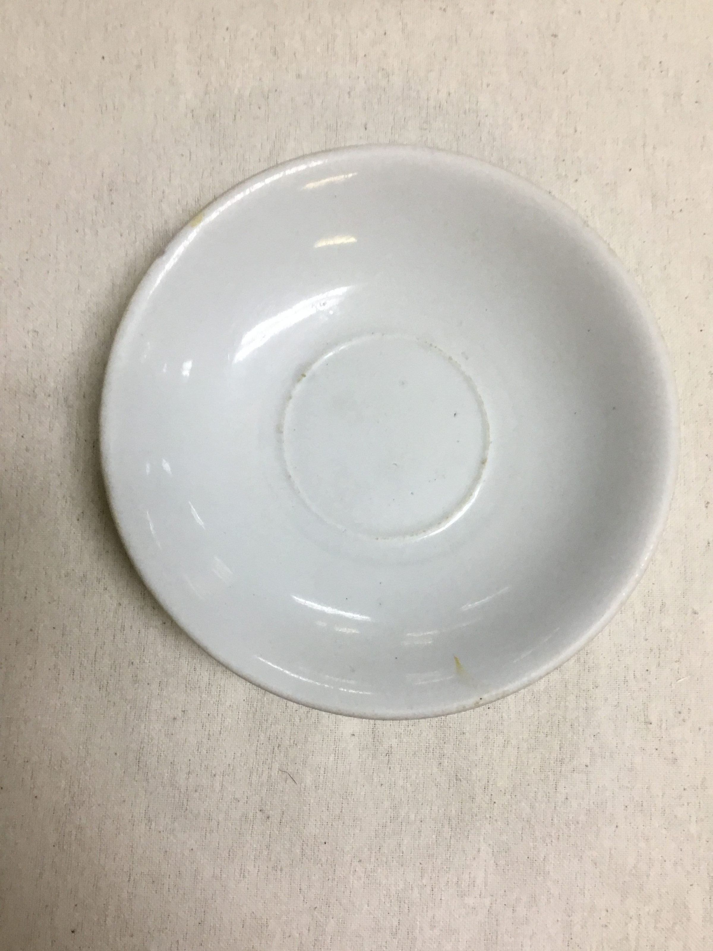 White ironstone saucer; edge rises to 1" from table surface; there is a cup well in the middle.