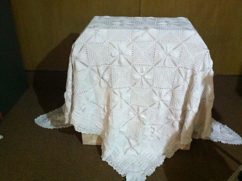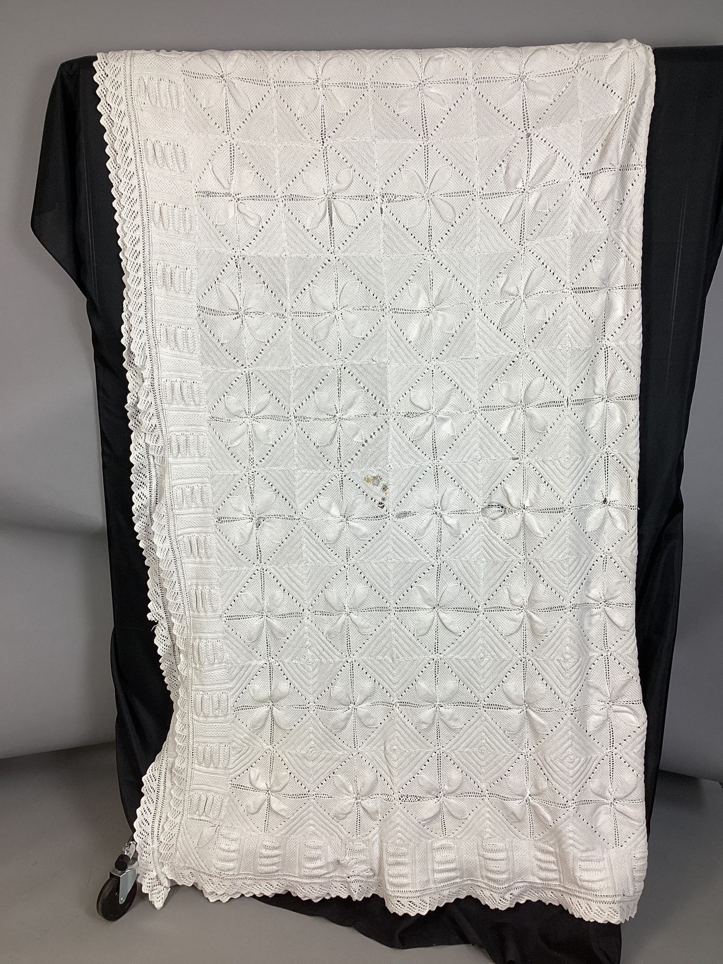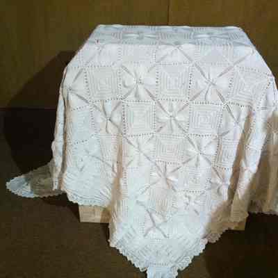 A large white knit bedspread with crocheted edging.Use