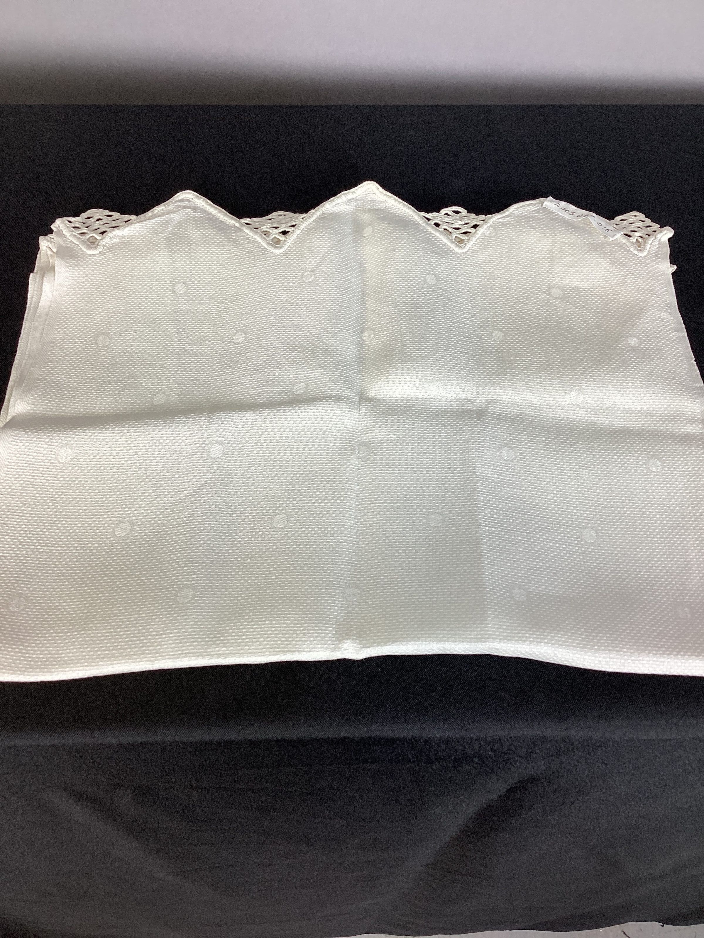 Piano or dresser scarf, white cotton or linen, white dots woven in the fabric, seven points on edge, four of the points have open-work in them.Collection