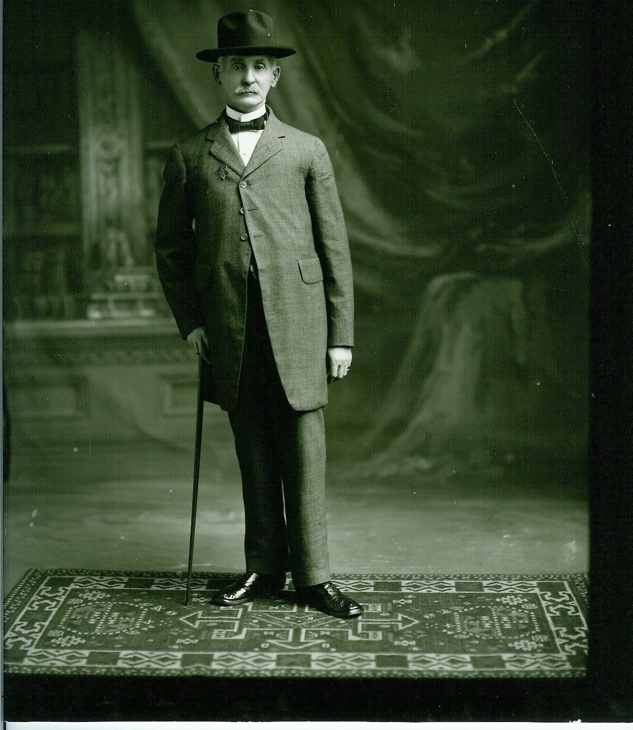 Black and white glass-plate negative in portrait format. Image is of a man who is standing and facing the camera. He has a hat, mustache and is leaning on a cane. He has a badge pinned to his coat that reads "Night Police". Original envelope identified subject as John D. Williams. Print made from glass neg 8/2003, stored in envelope with neg. Also in envelope is sepia-tone print F.I.C.Collection