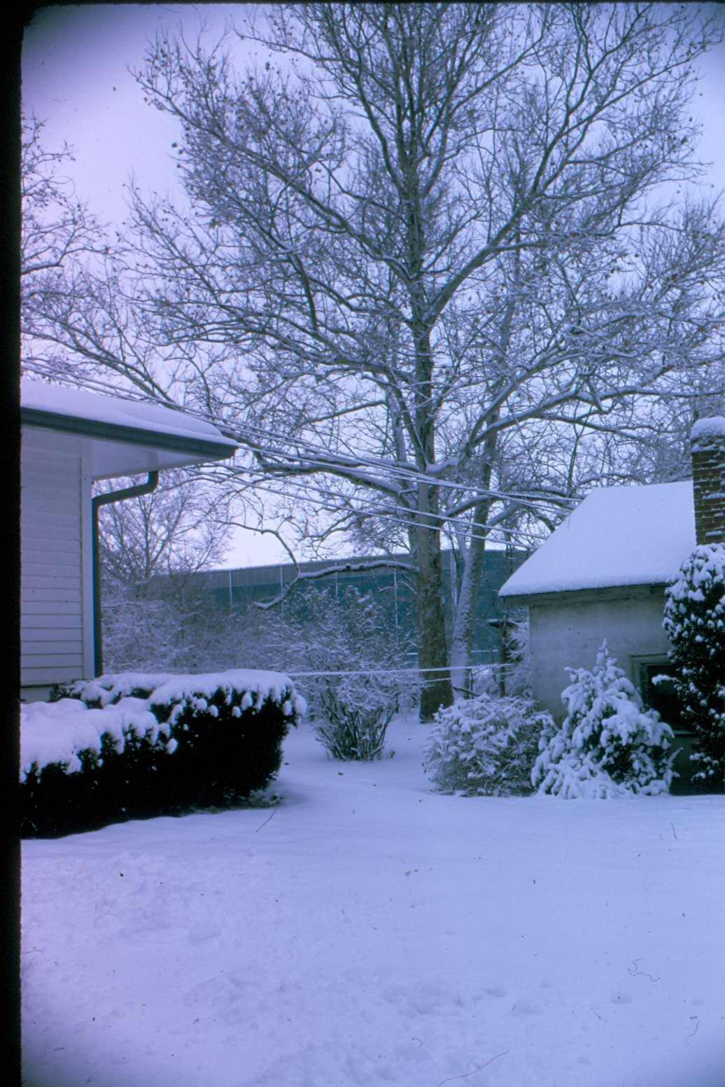 Image is of a winter scene, eave of house on left, small building with a chimney is on the right, bare tree between the buildings. Shrubs and bushes in the foreground, everything is covered in snow.Collection
