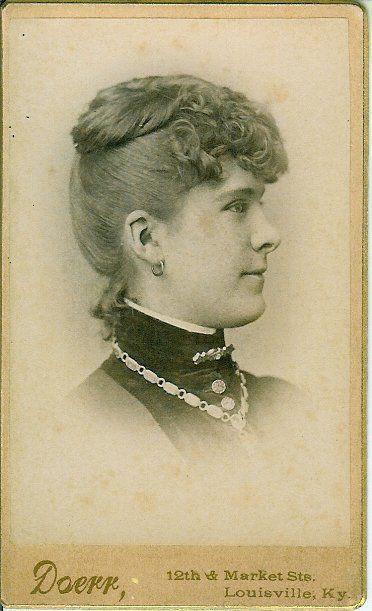 Image of of a young woman; right profile; hair is curled over the forhead and wrapped on the top of the head; circle pierced earring; dress is of med. color with velvet front and stand-up collar; white under collar shows above velvet; bar pin at throat; buttons appear to be metal down the front of the dress; chain at neck is of circles and rectangles; mount is of white cardboard with gold beveled edges, rounded corners; this is a carte d'visite photo in B&W, Pinted in gold at bottom of mounting: "Doerr, 12th & Market Sts. Louisville, Ky."Collection