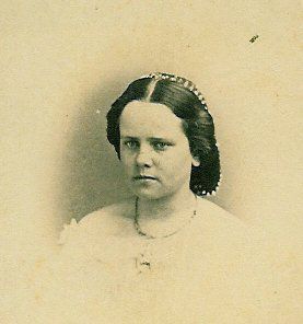 Image is of a woman; hair is center parted and brushed back from the face; hair appears to be caught up in a beaded snood at back of head and down neck; narrow necklace around her neck; dress is white or light and has an off the shoulder neckline; there appears to be an ornament or pin of some type at the center of the dress neckline; mounting is of white cardboard with 2 narrow bands of gold near all edges; edges are straight and corners square; this is a carte d'visite photo in B&W. printed on back on mounting: "PHOTOGHAPHED BY A. WHISSEMORE, Mansfield, Ohio"Collection
