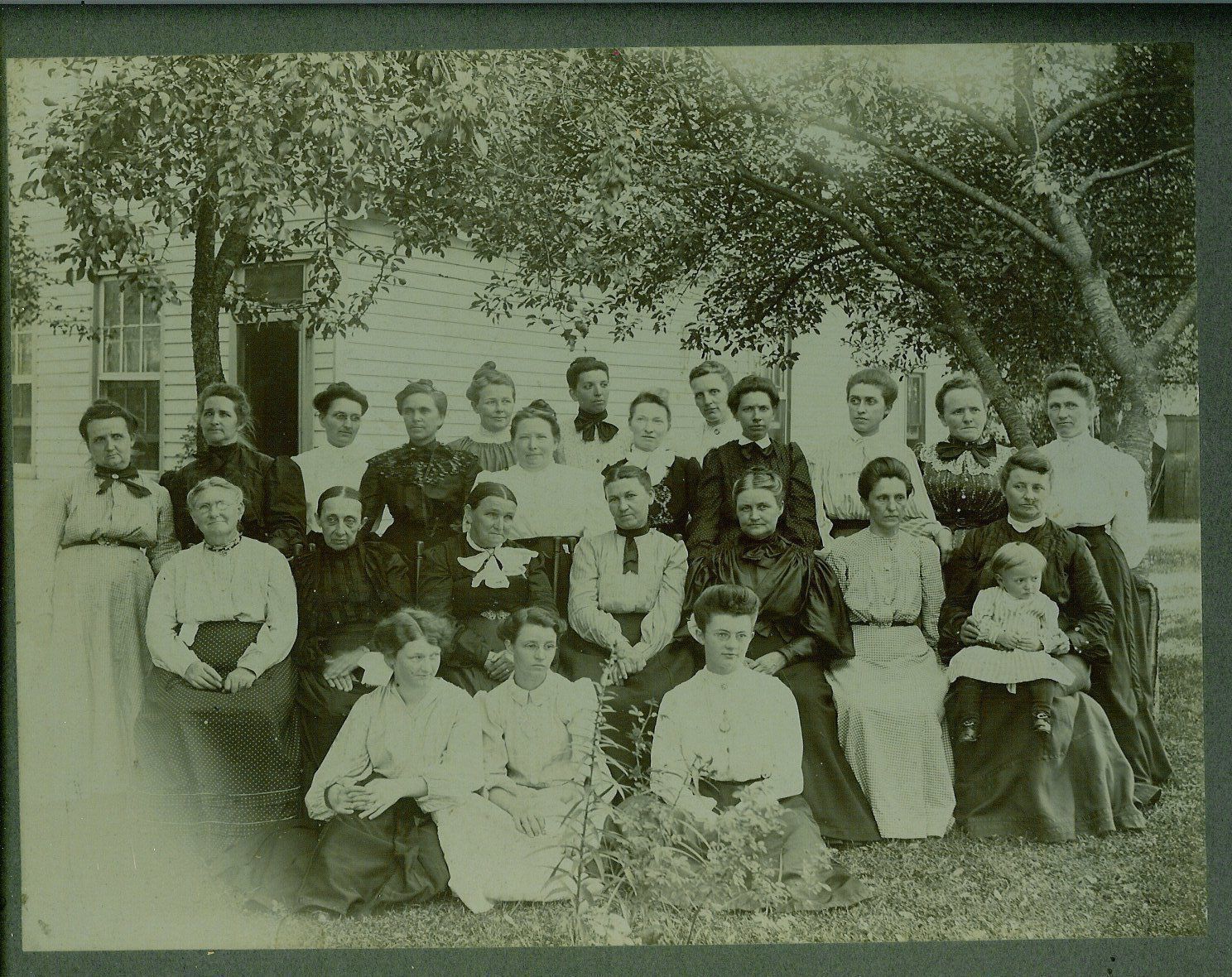 three women and one child posed for the camera out-of-doors with a clapboard house behind them. Three in front are kneeling in the grass. Second row is seated on chairs. Back row is standing. Some people are identified in blue ink on back of mount. Imprinted in lower right corner of mount: "J. L. Rohm, Fountaintown, Ind."Collection
