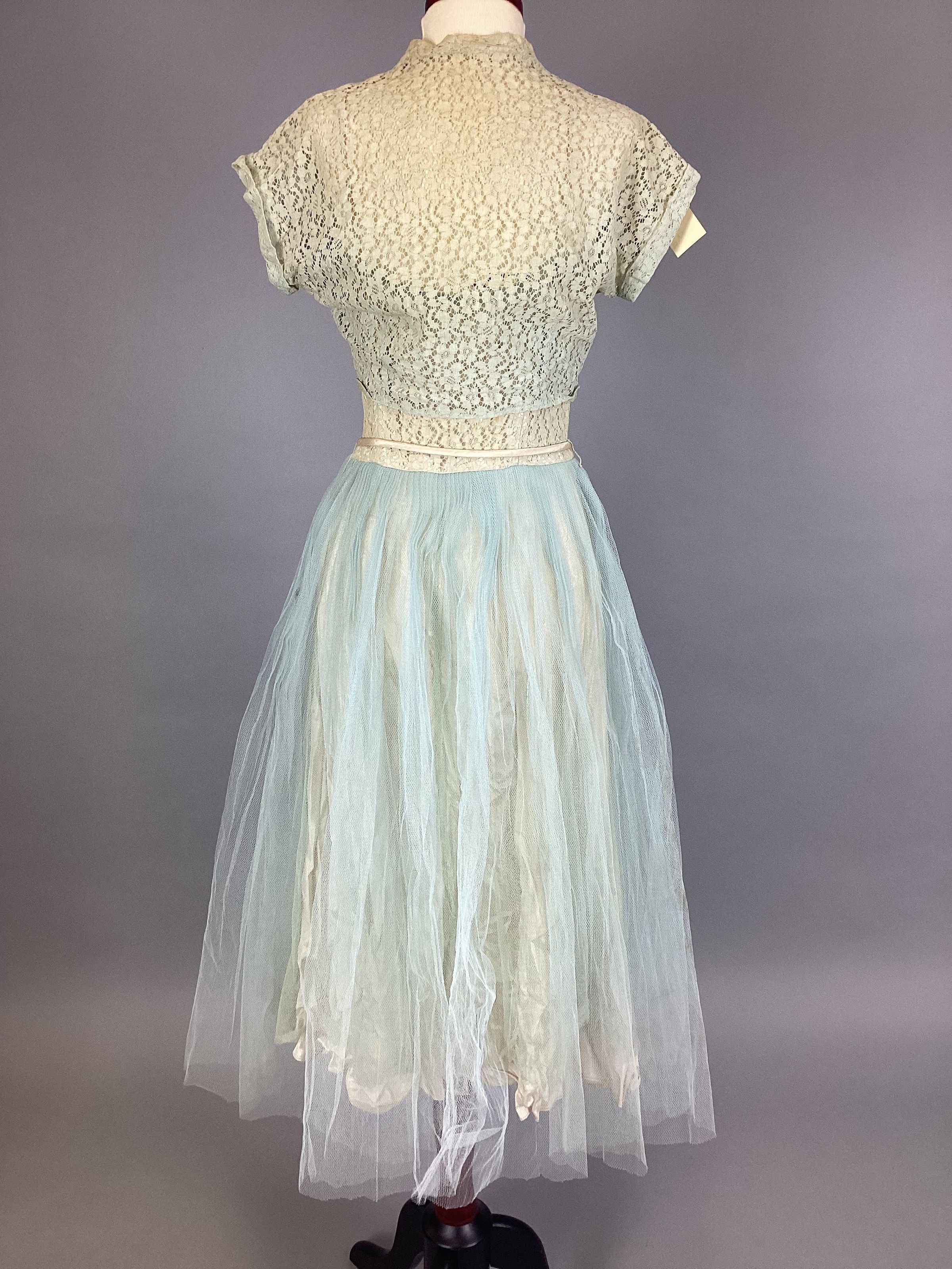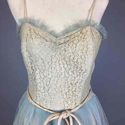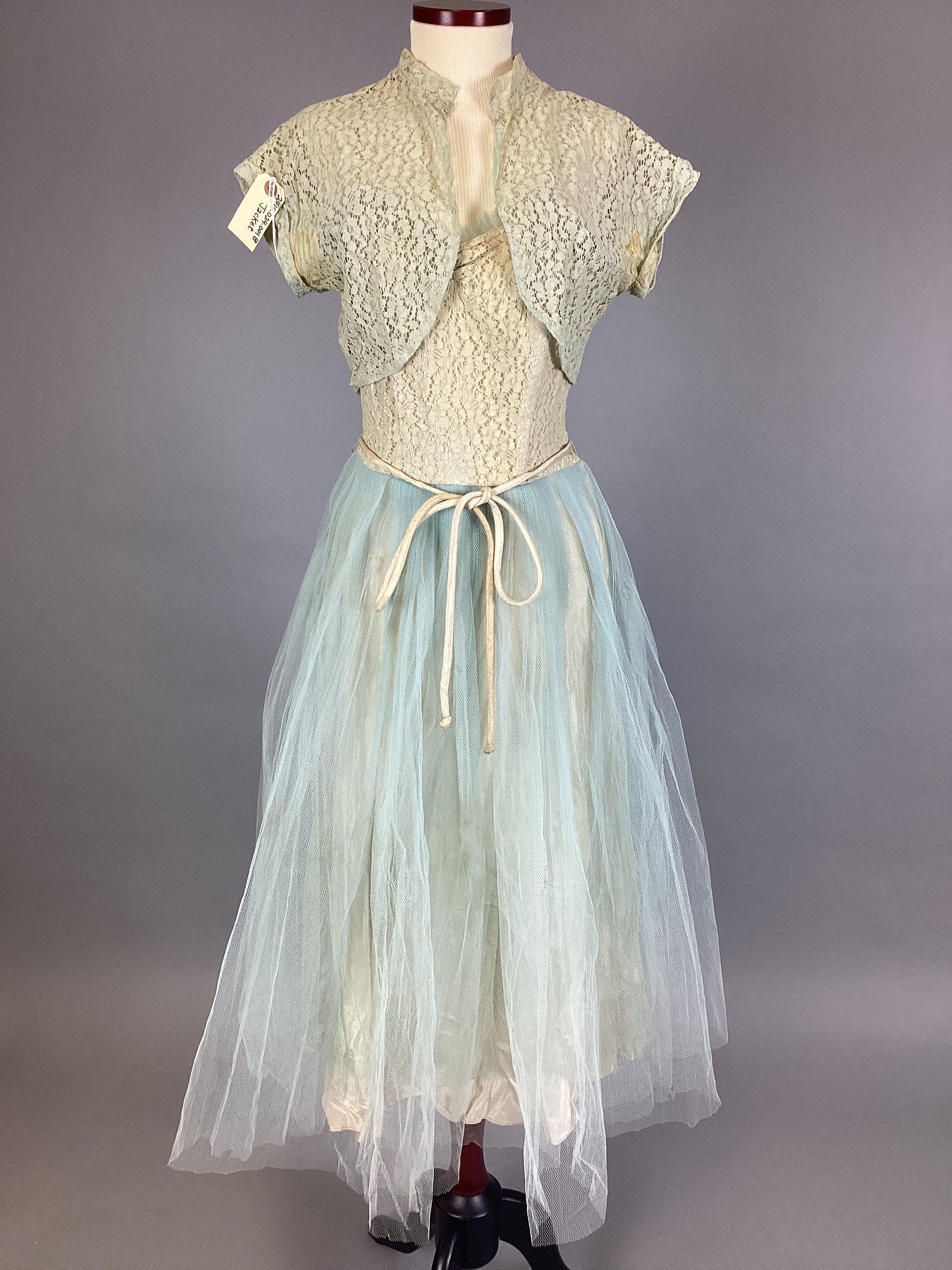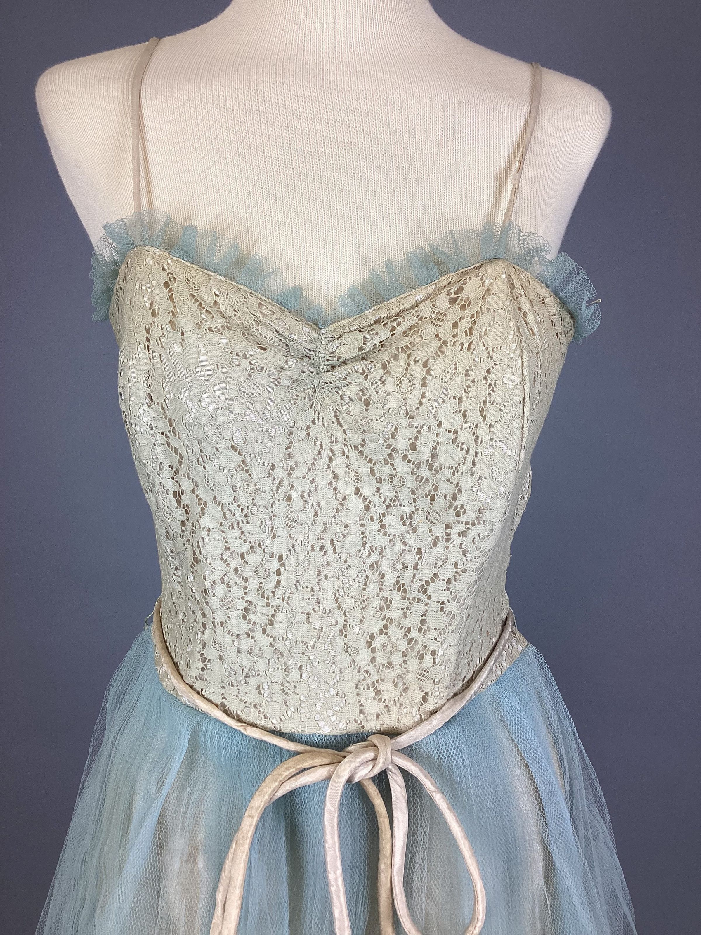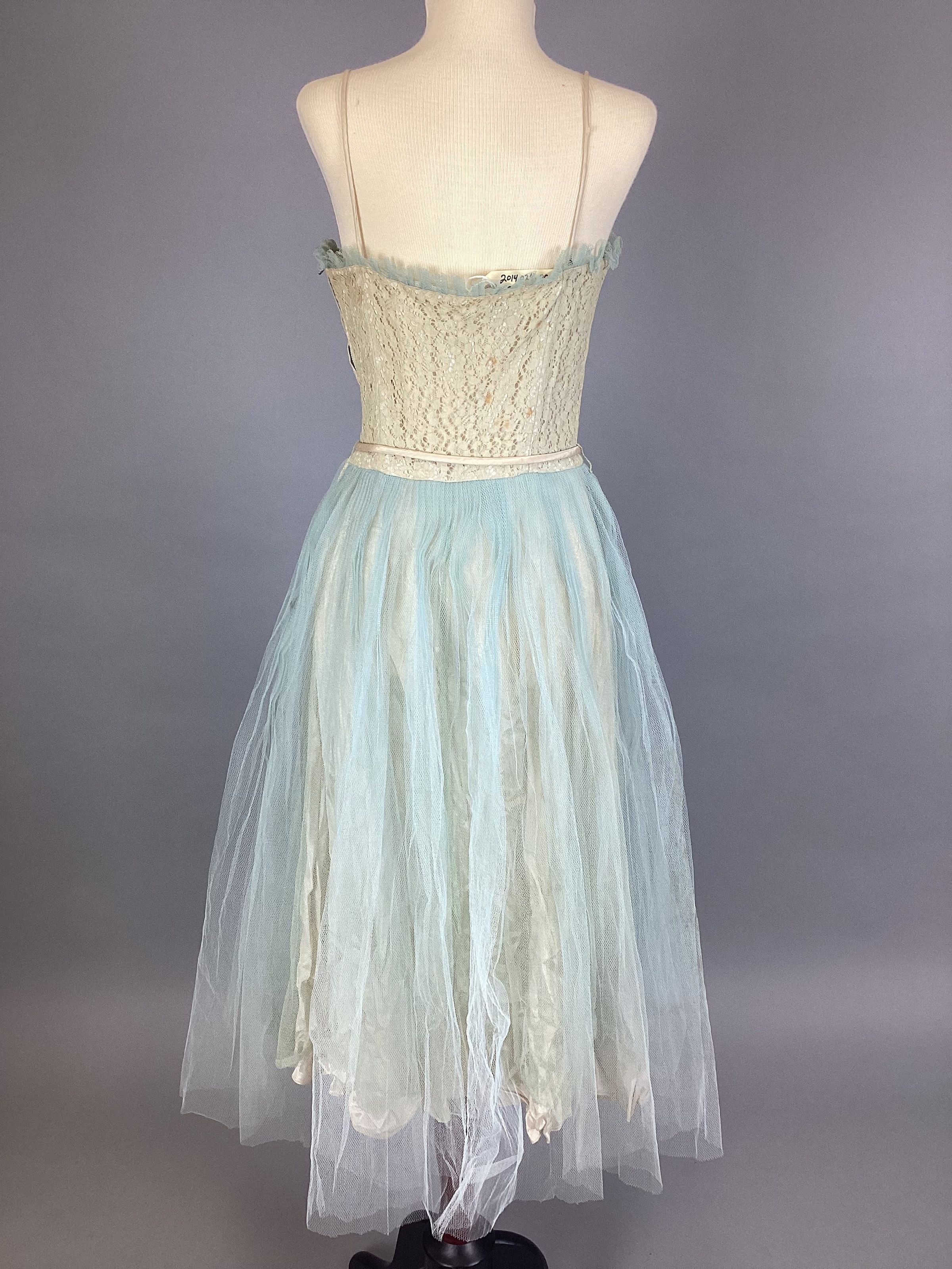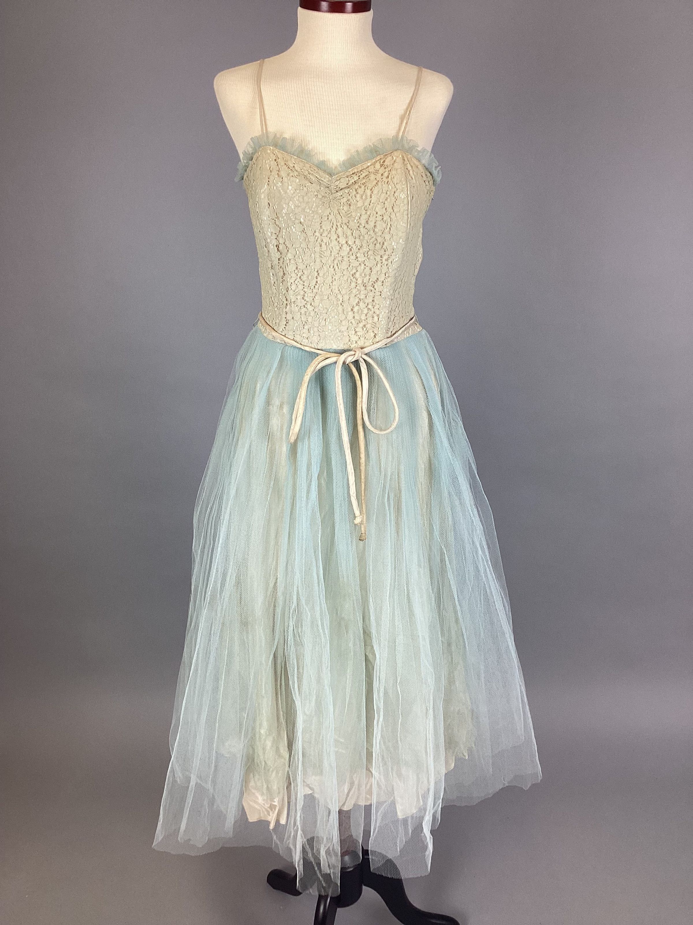 A spaghetti-strap dress with a full, three-layer skirt. Top half of dress is beige lace with powder blue gauze trim. Lower half of dress has underlining of beige taffeta with an overlay of gathered powder blue gauze making a flared full skirt. Waistline of dress is accented with beige-piped tie string. Zipper on left side.