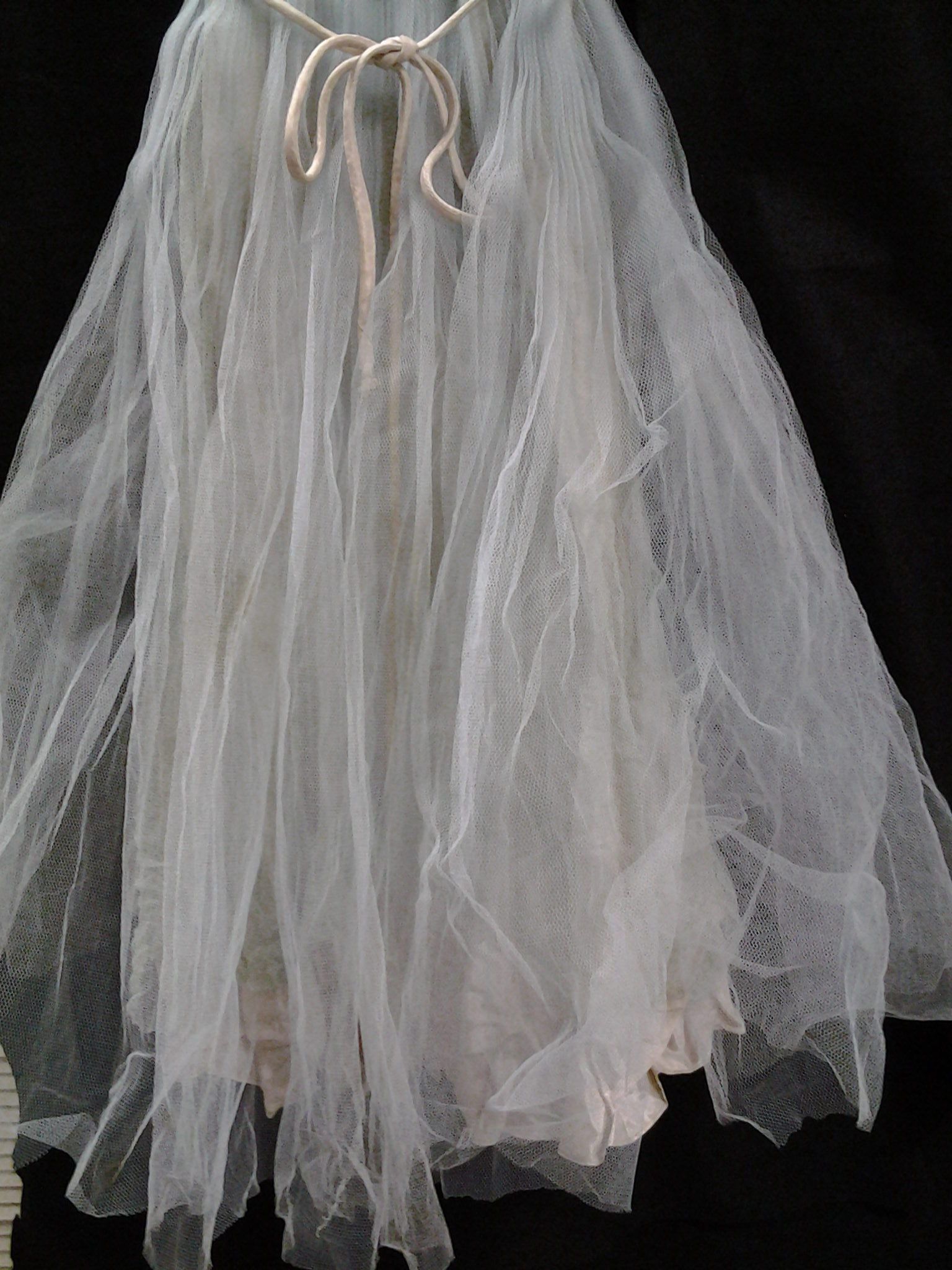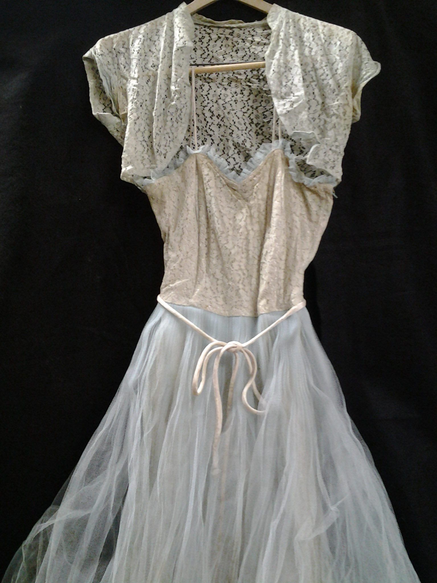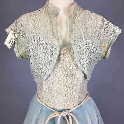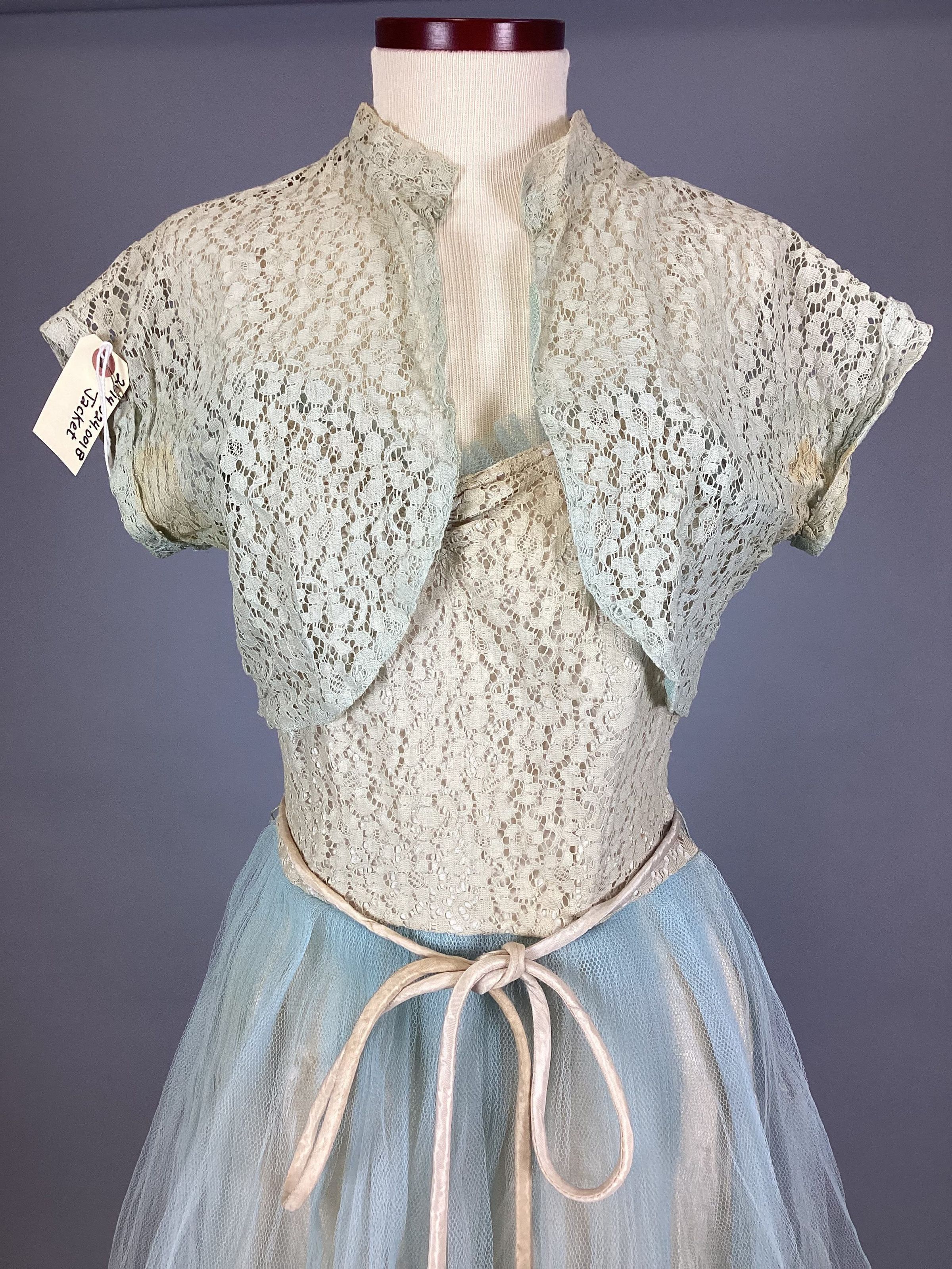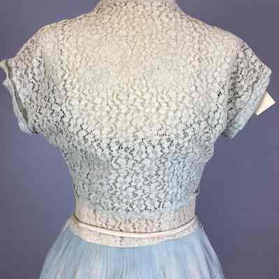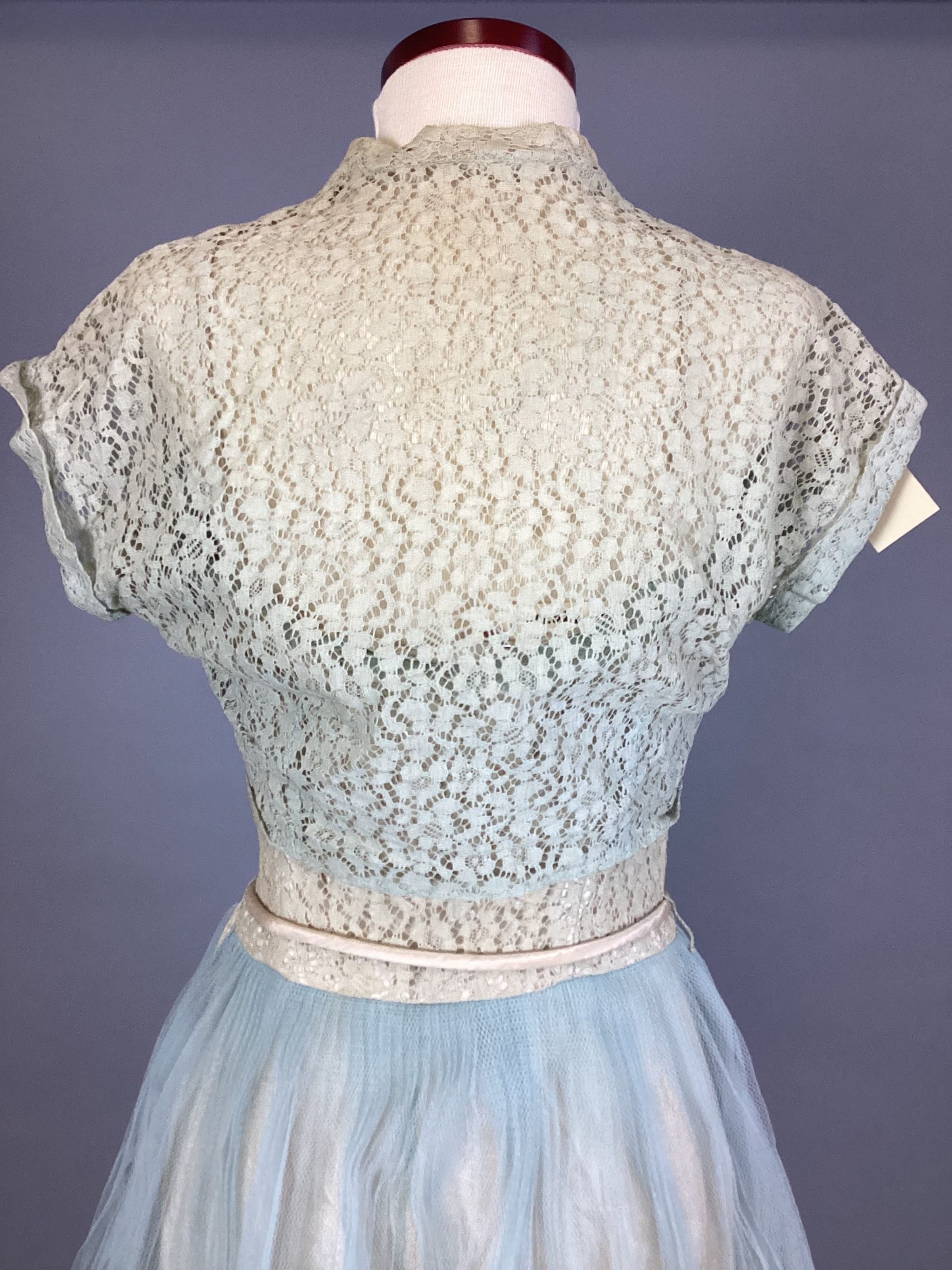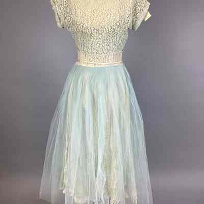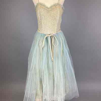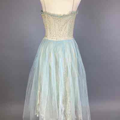 A spaghetti-strap dress with a full, three-layer skirt. Top half of dress is beige lace with powder blue gauze trim. Lower half of dress has underlining of beige taffeta with an overlay of gathered powder blue gauze making a flared full skirt. Waistline of dress is accented with beige-piped tie string. Zipper on left side.