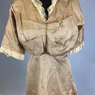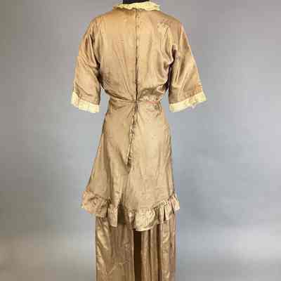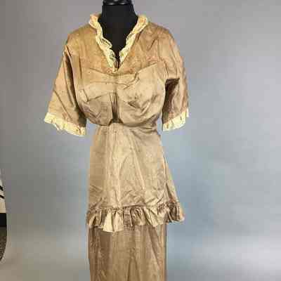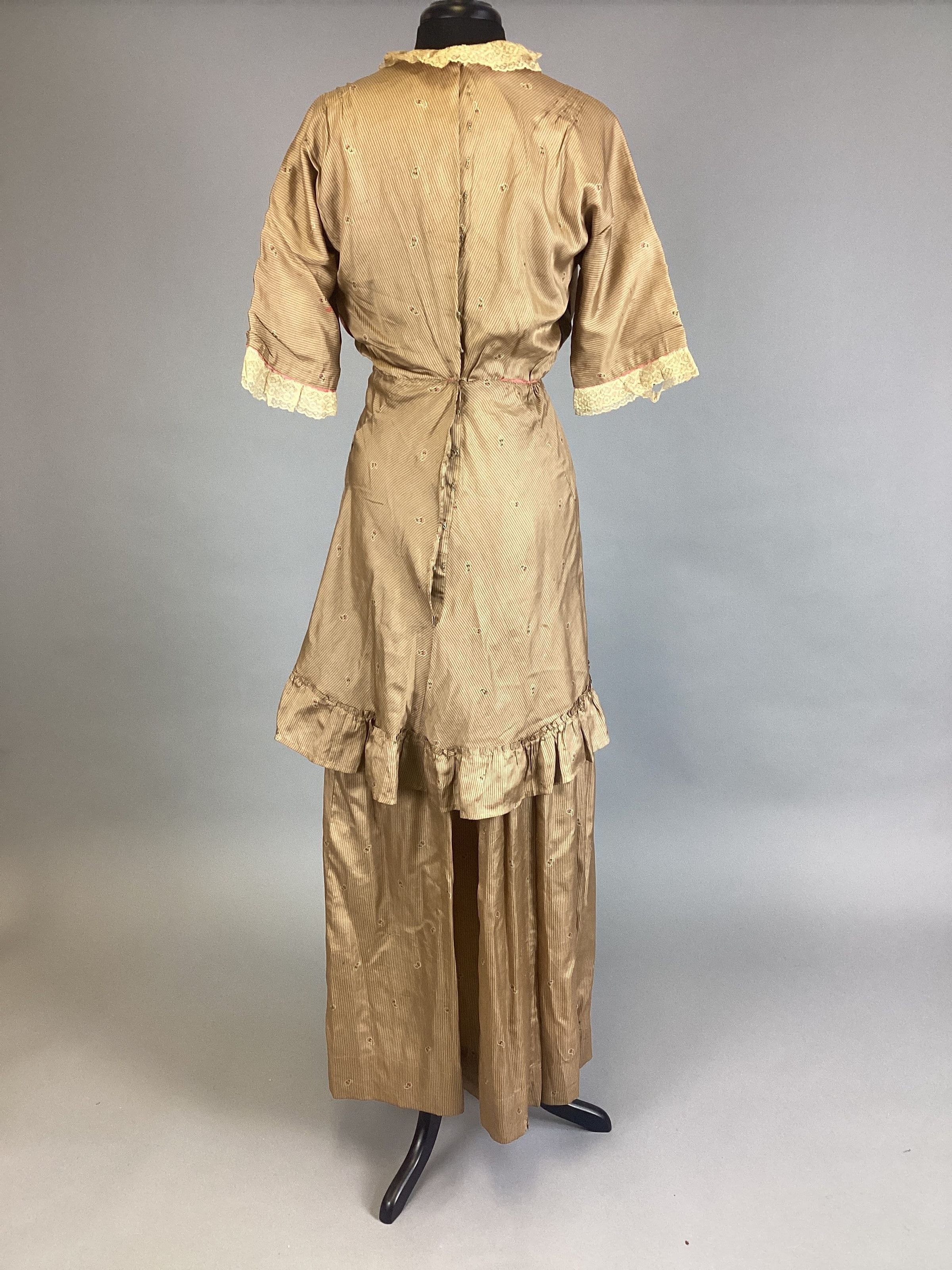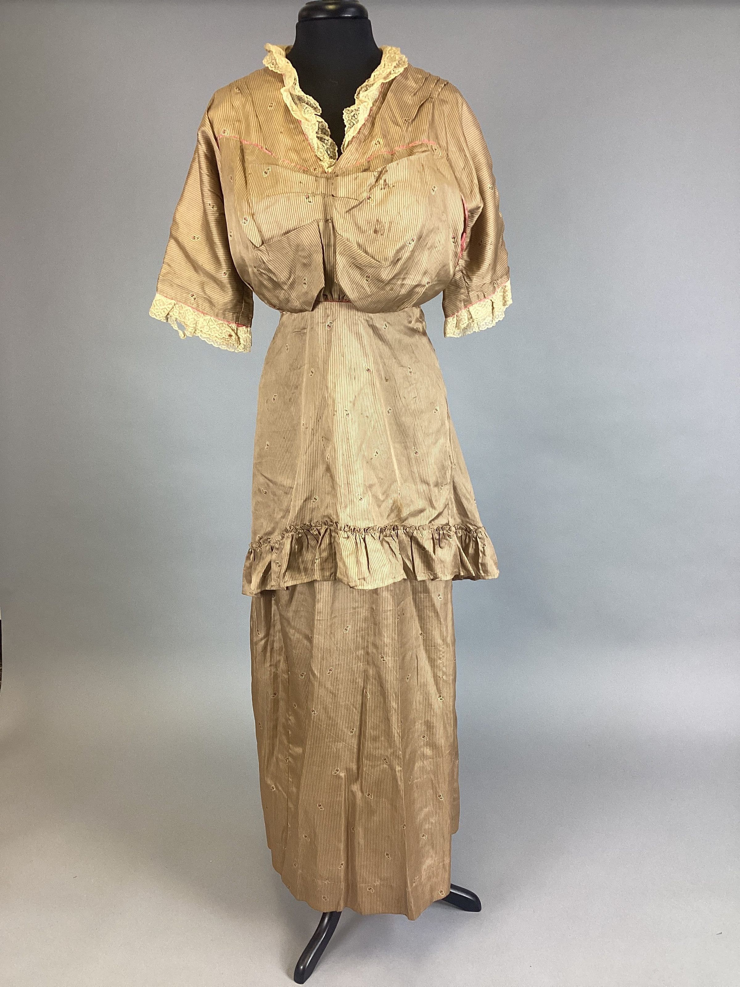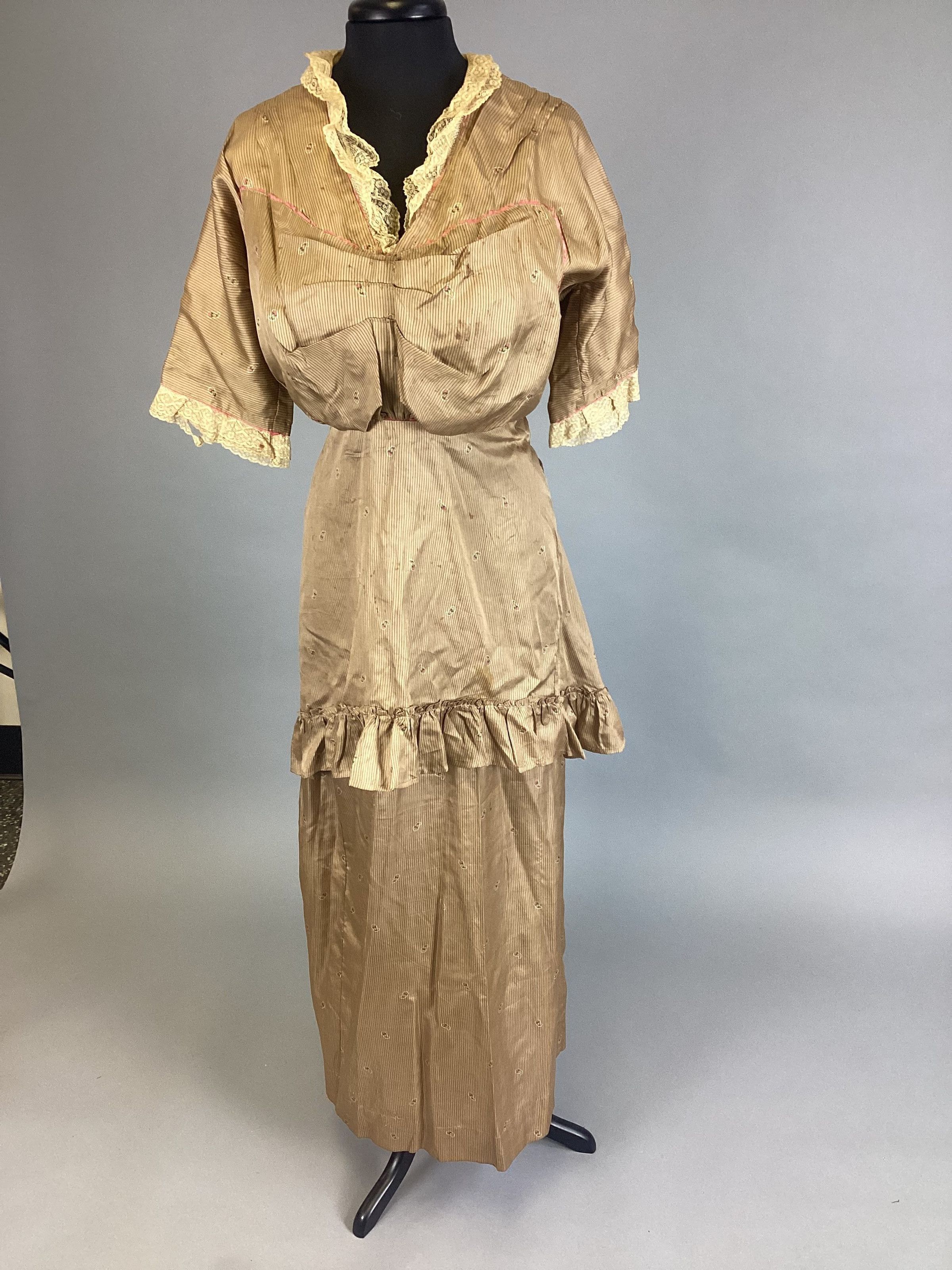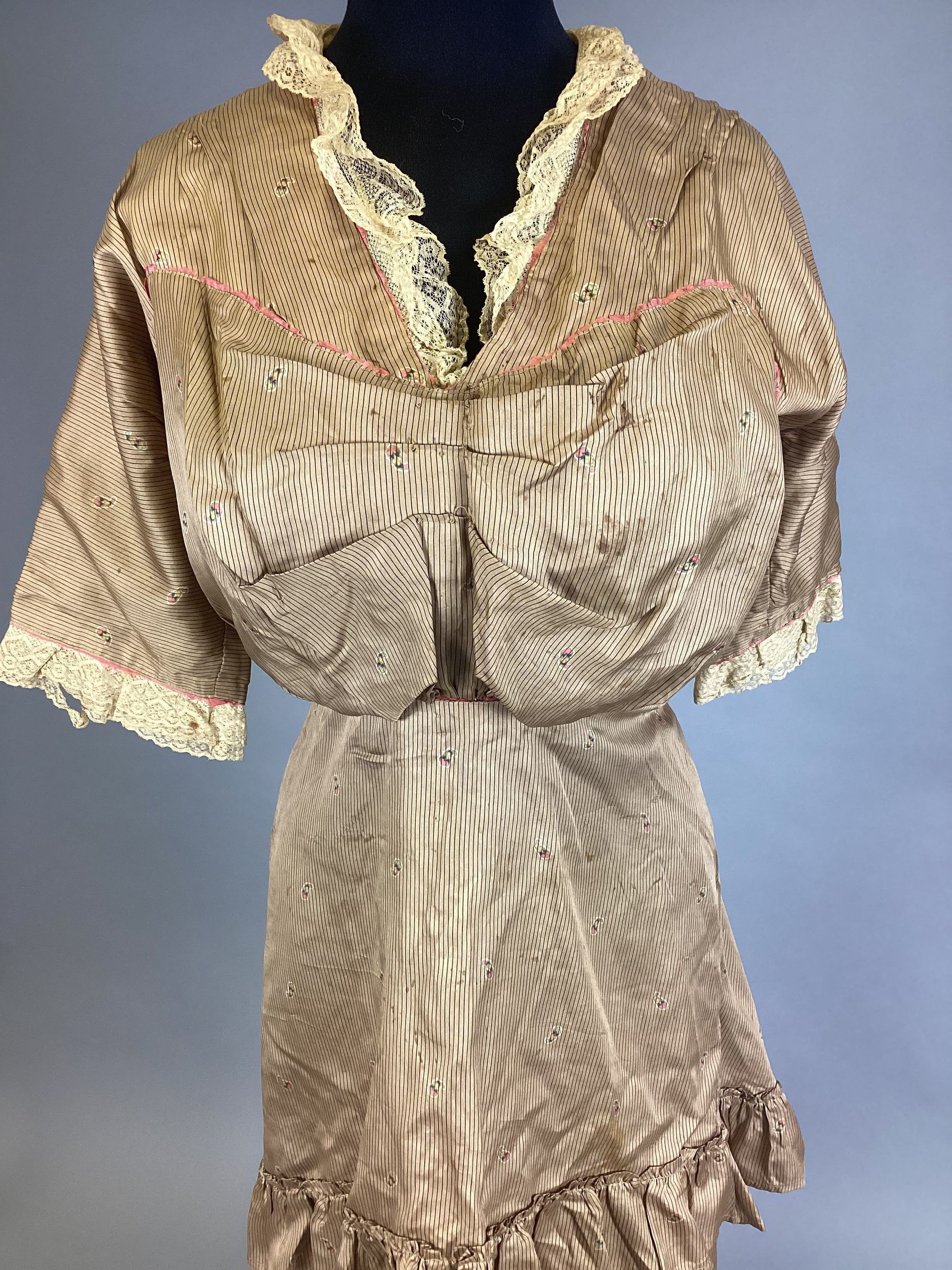 Dress made of a beige material that is flowered and has fine stripes. Dolman sleeves. Opens down the back and secures with hooks and eyes. Trimmed in pink binding around the neck, across the front, and cuffs of sleeves. Double ruffle at neck and sleeves. Three tucks on each shoulder. Some hand stitching and some machine stitching. Dress has two pieces (A) top has fitted waist, long overshirt with a 3" ruffle. (B) skirt fastens in back with hook and eye, plain front, does have long center with long peice at bottom, skirt 42" long with 3" hem, waist gathered with 3 tucks in front