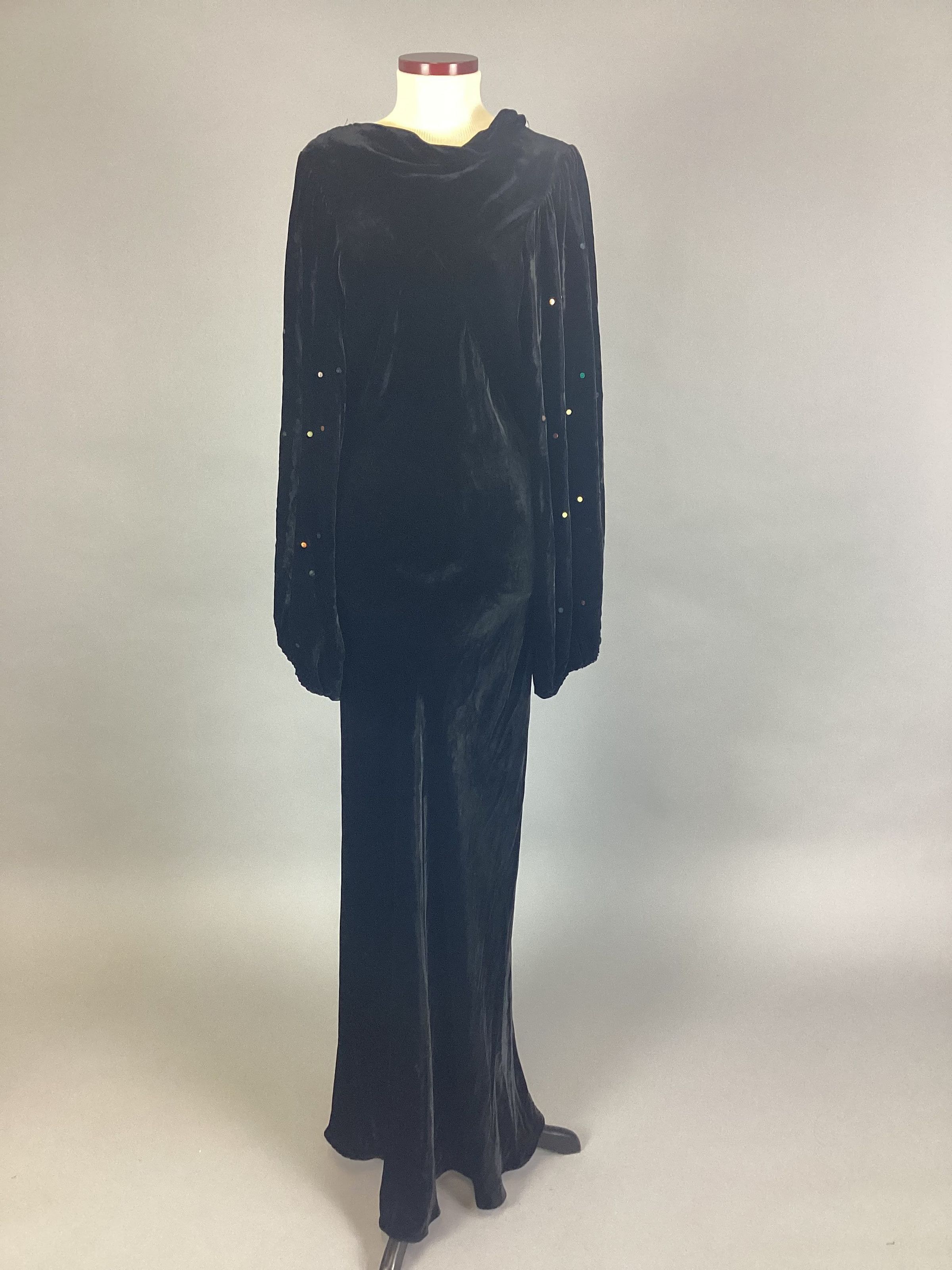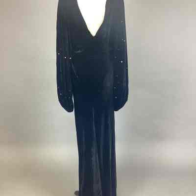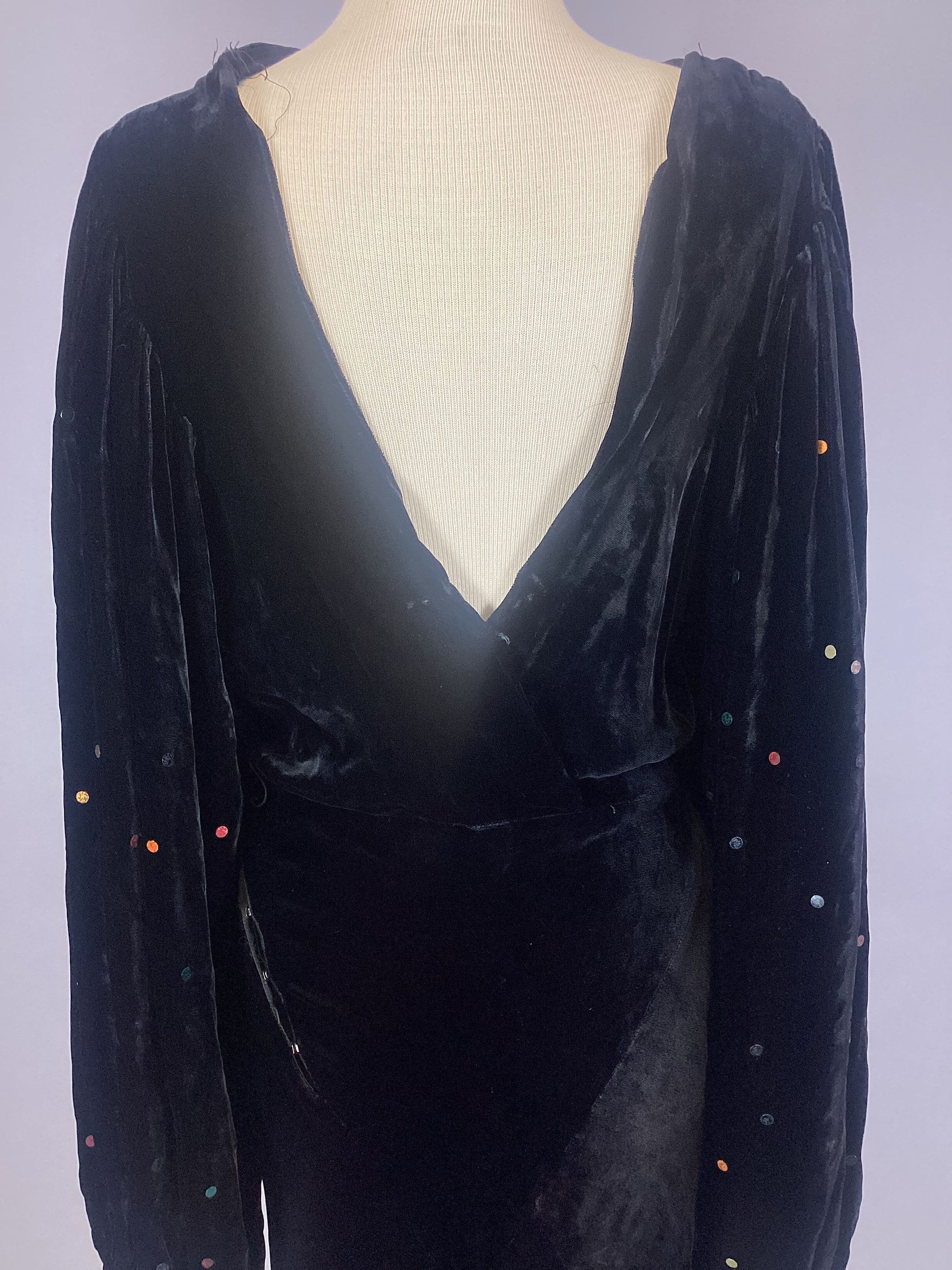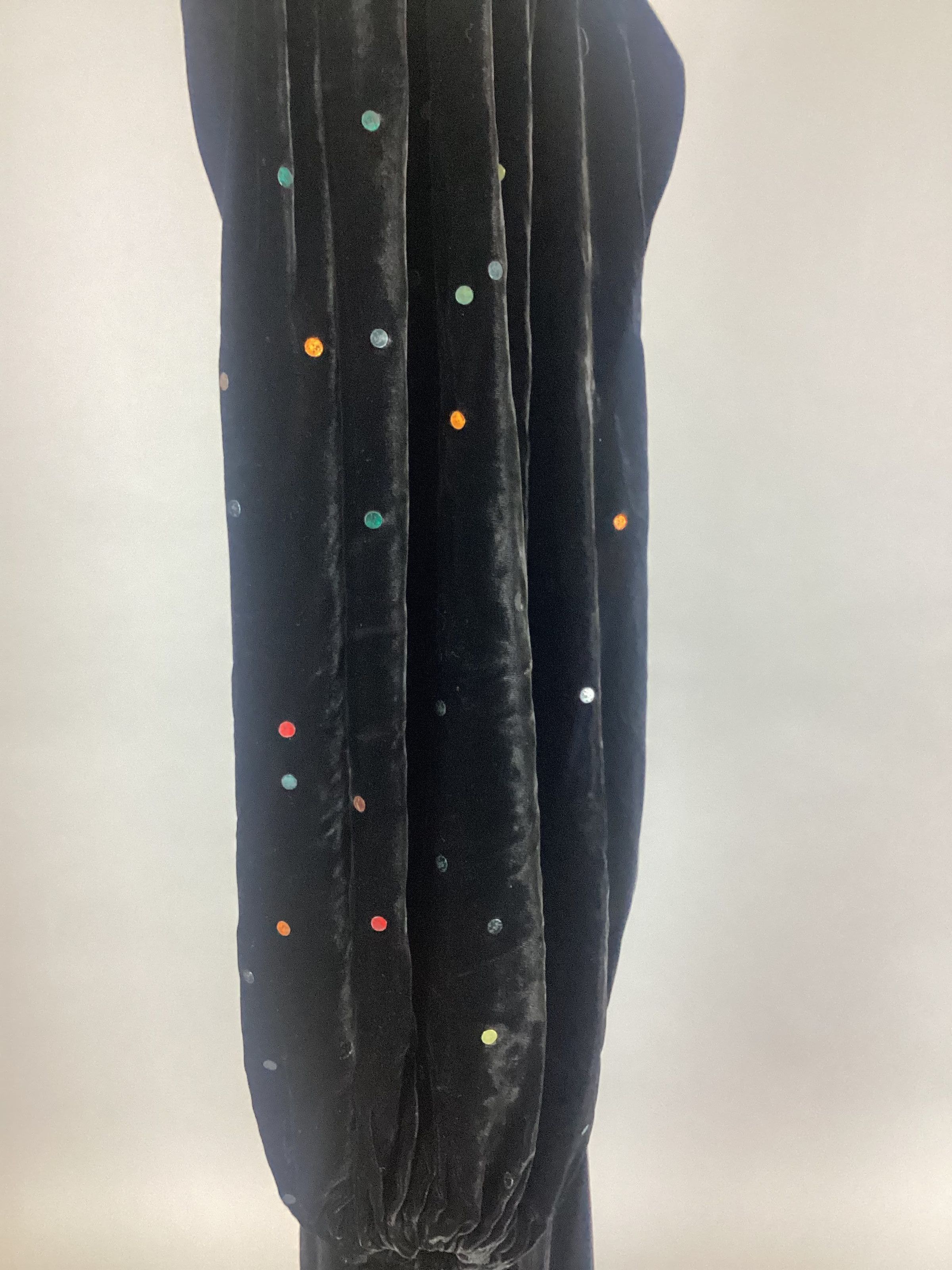 Black velvet formal; empire waist; bias slim skirt; full bishop sleeves with multi colored sequins stapled on sleeves; 12" placket fastened on with snaps; cowl neck with a deep V back.