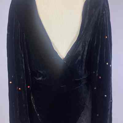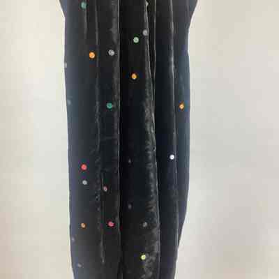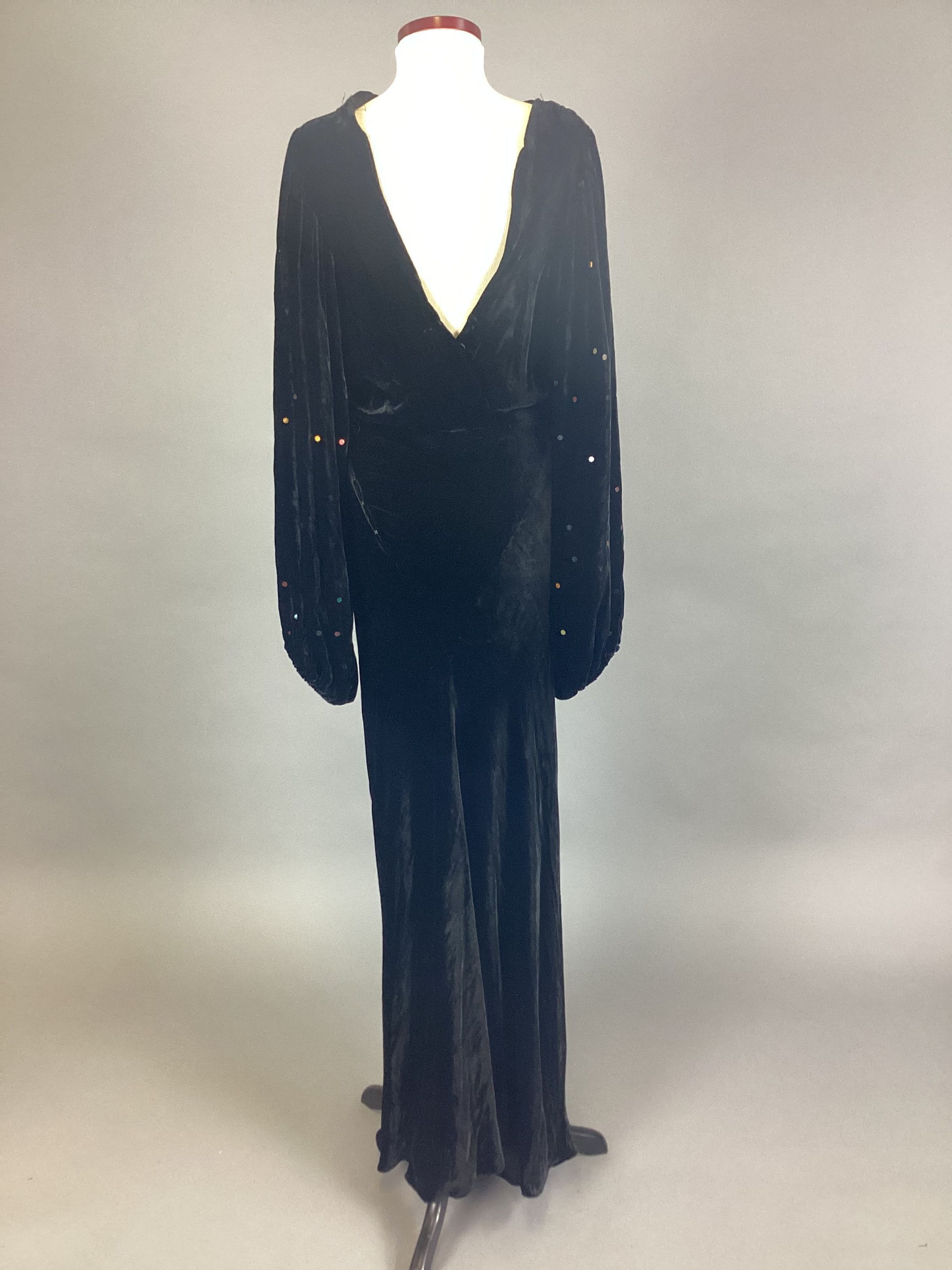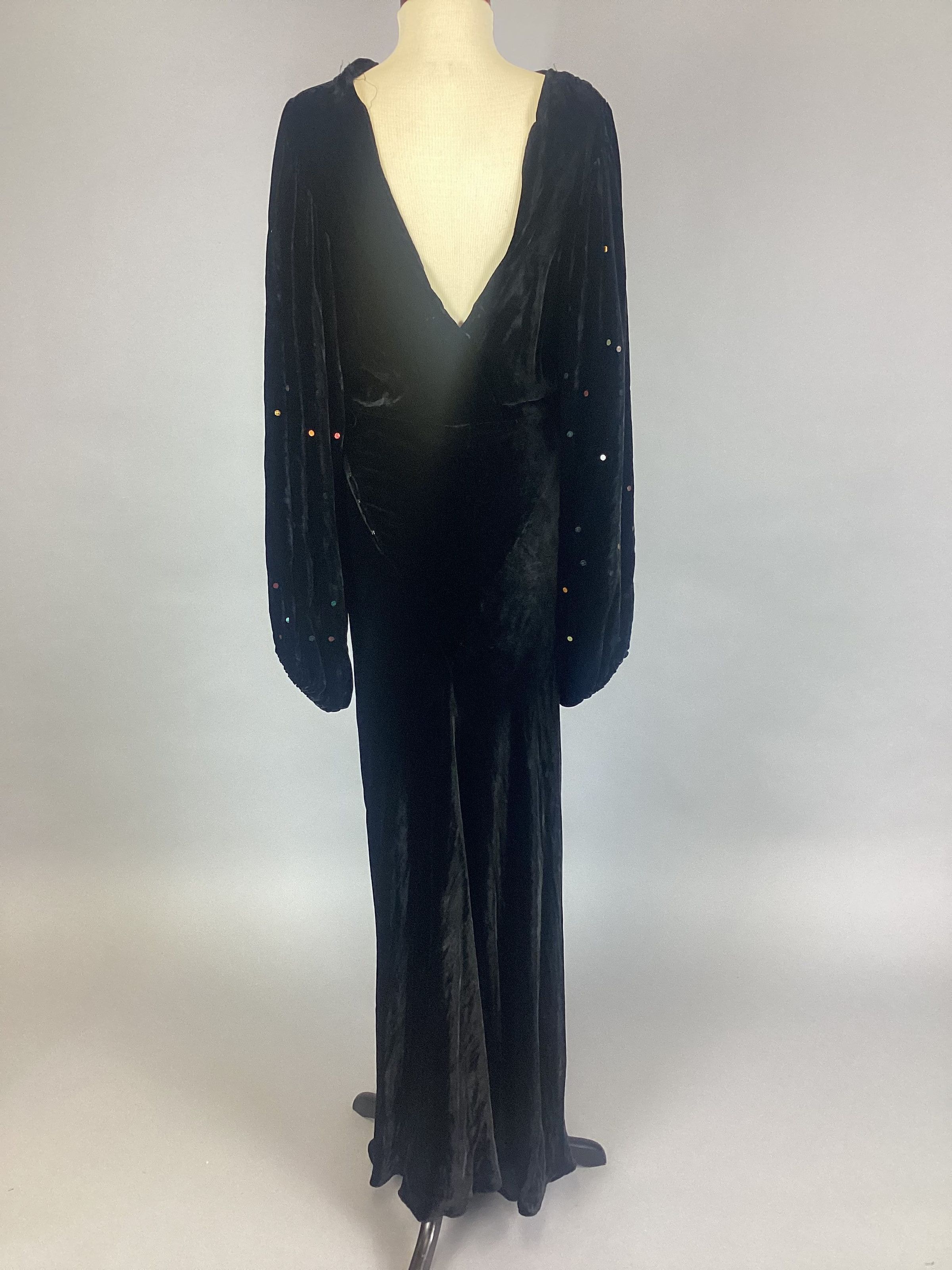 Black velvet formal; empire waist; bias slim skirt; full bishop sleeves with multi colored sequins stapled on sleeves; 12" placket fastened on with snaps; cowl neck with a deep V back.