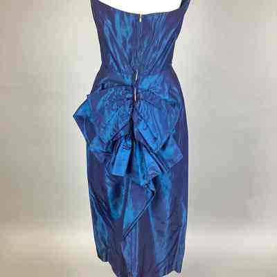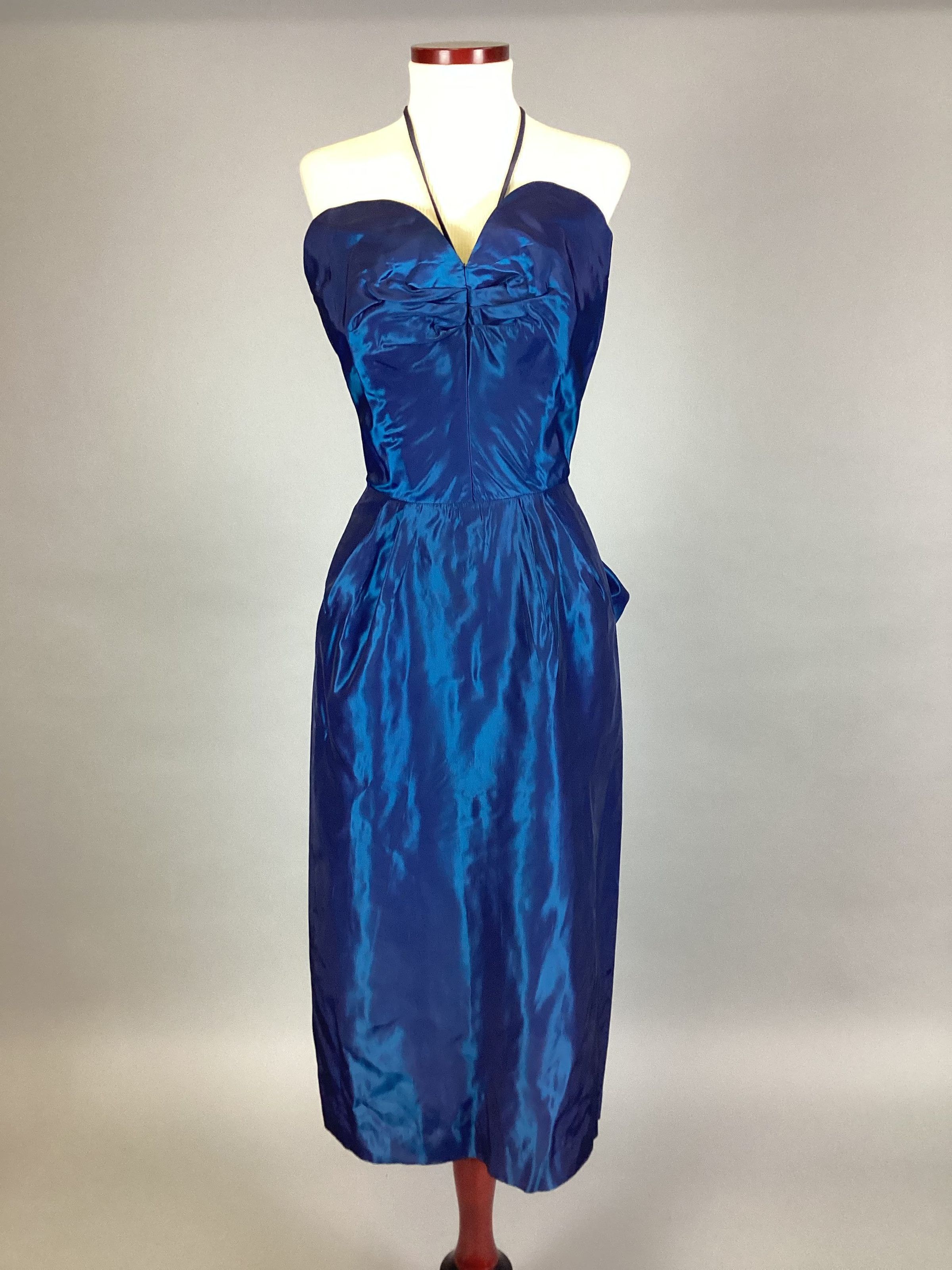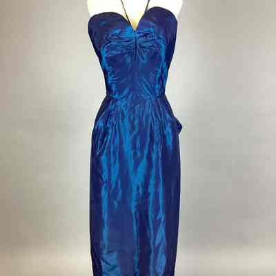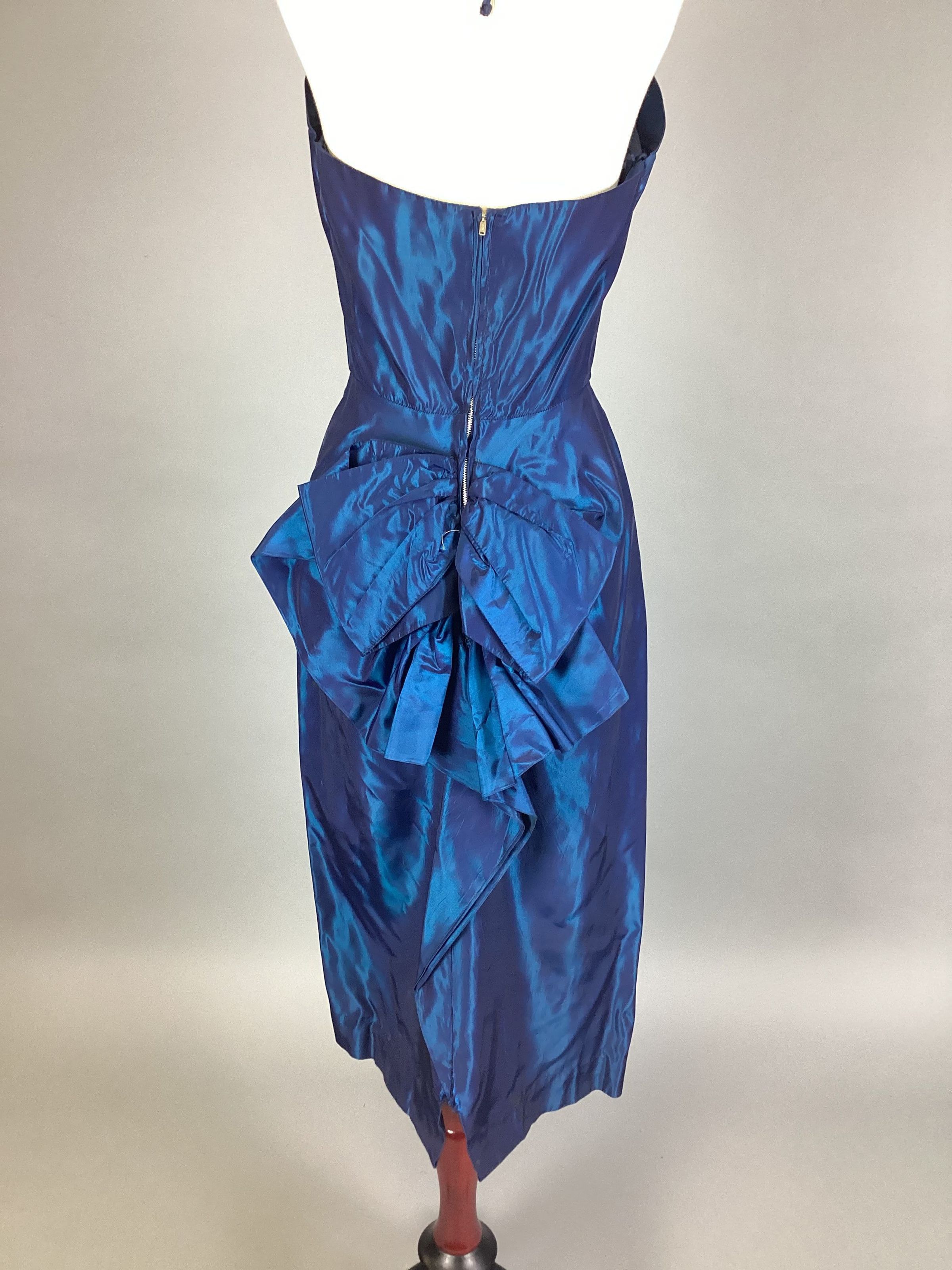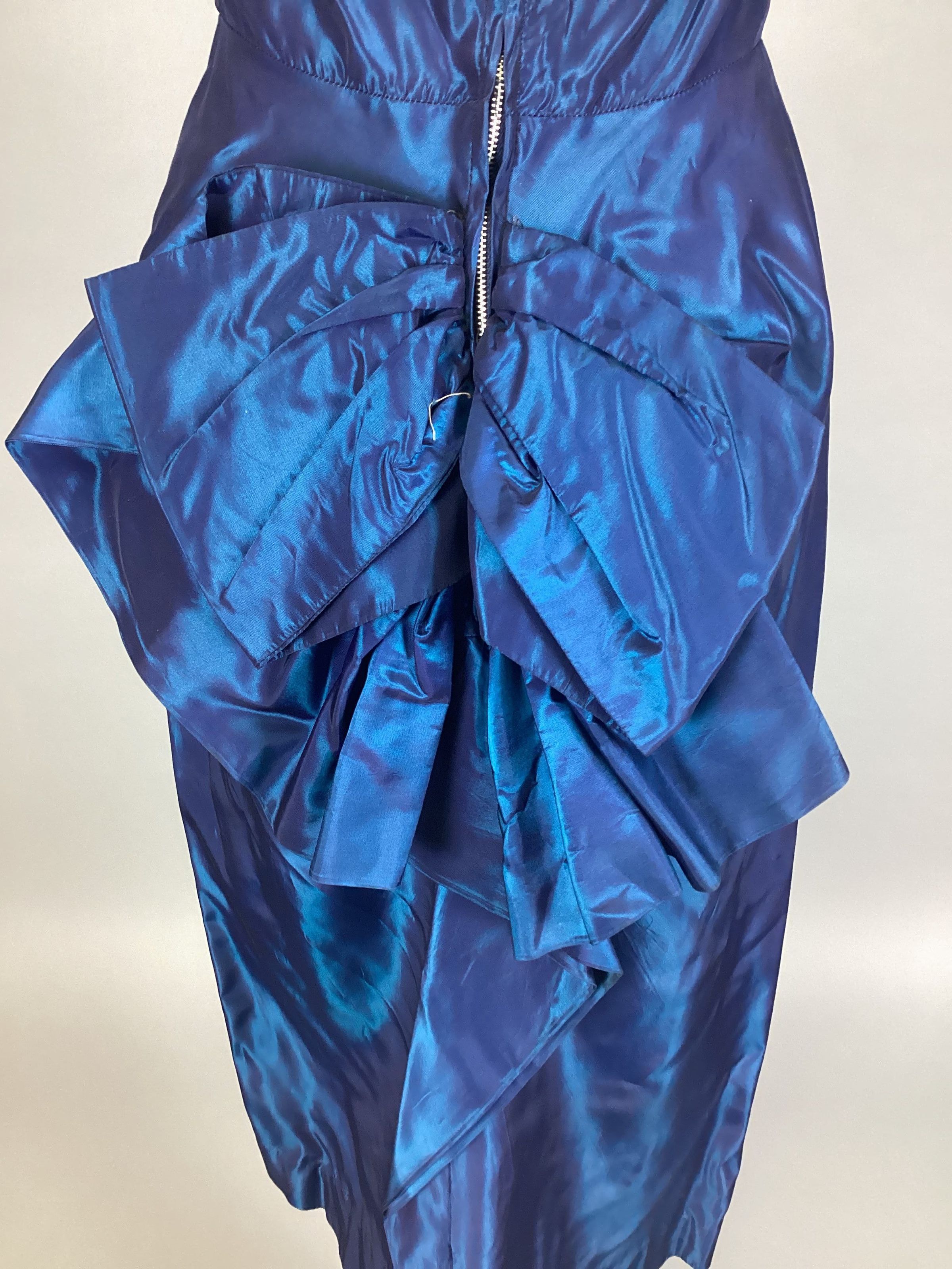 A: dress, strapless, blue taffeta, back zipper, "pouf" at back, size 9