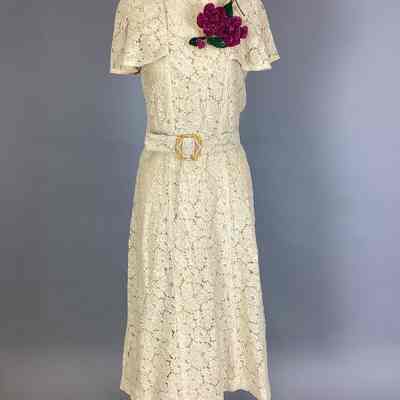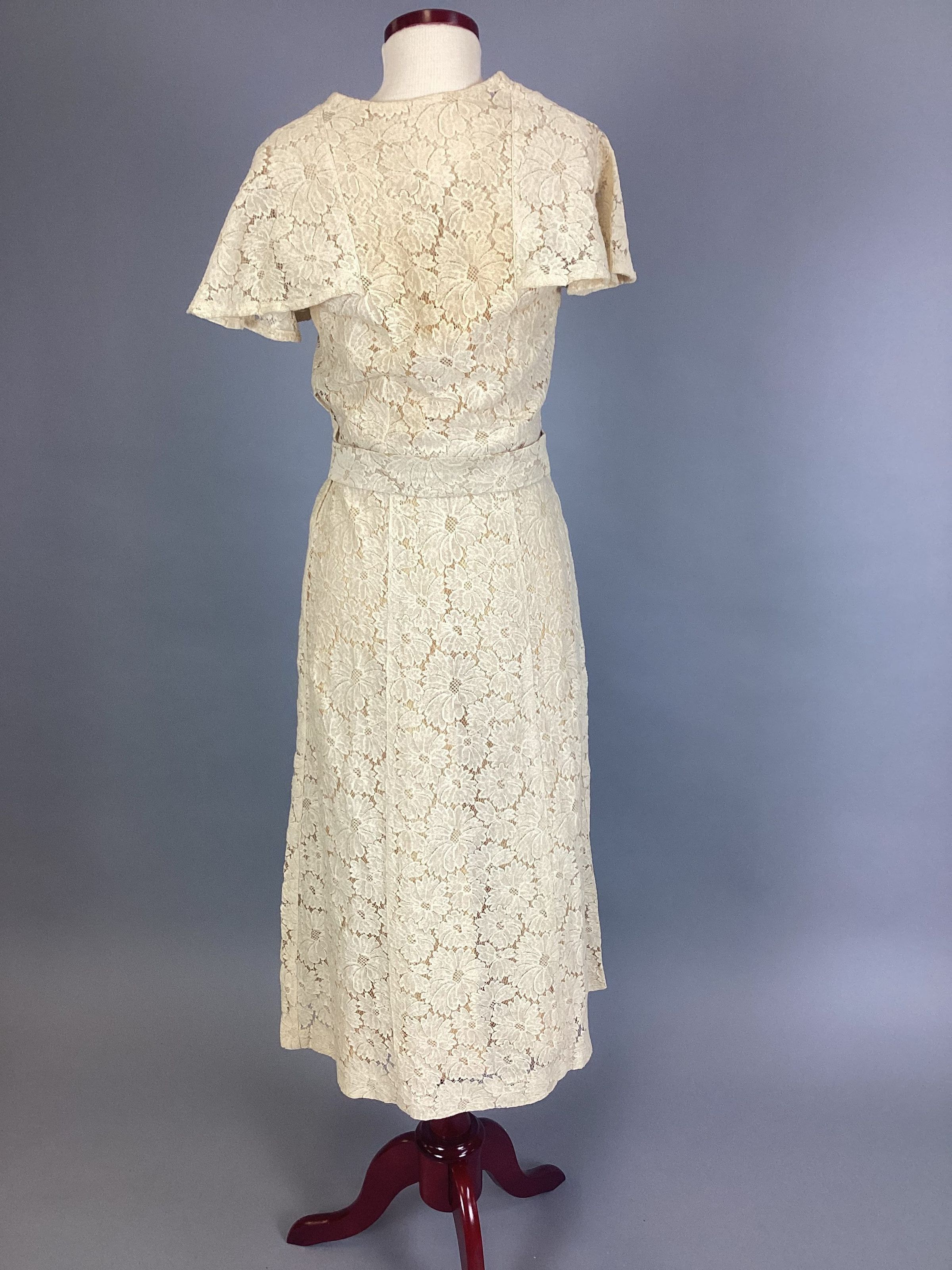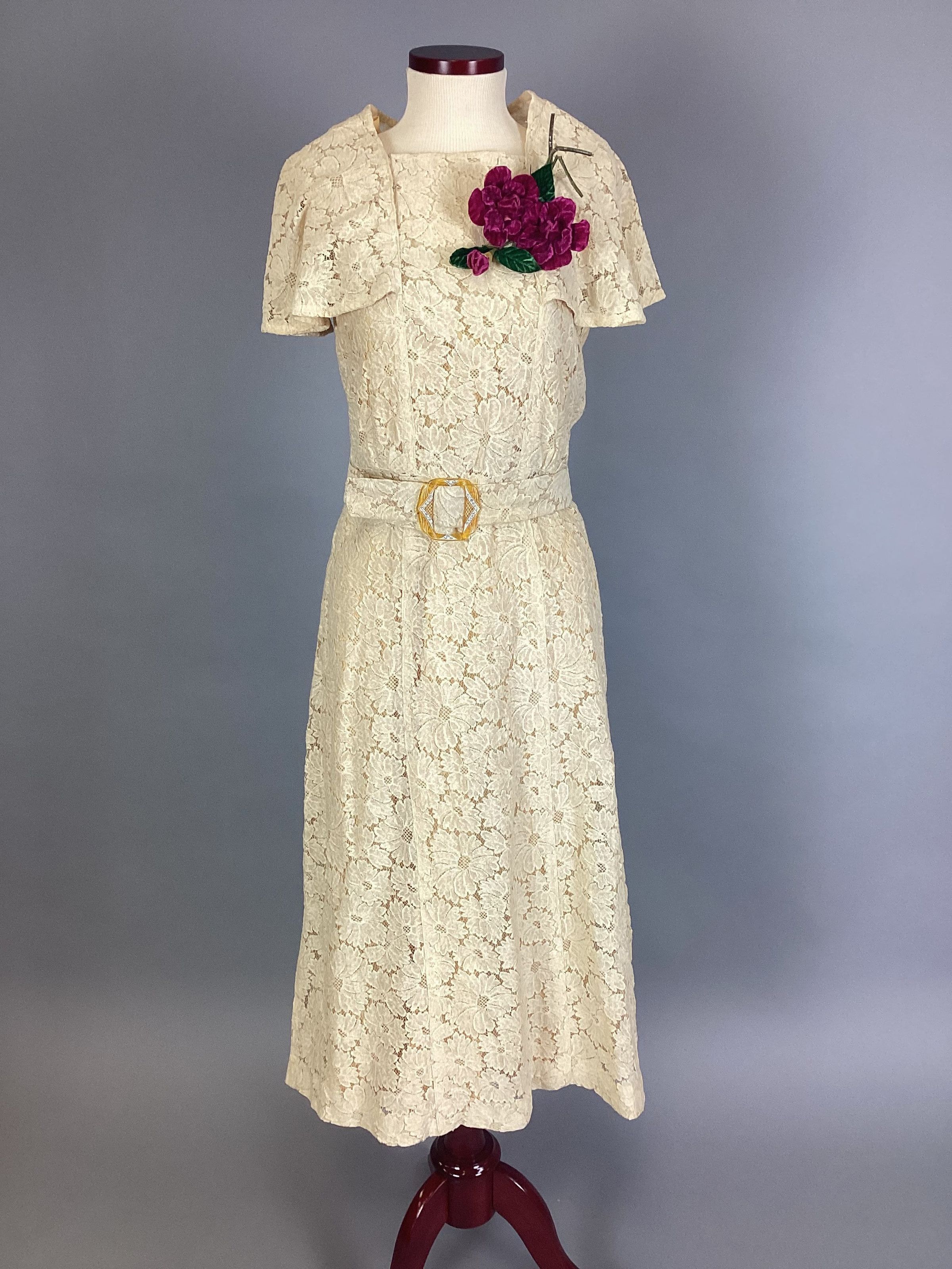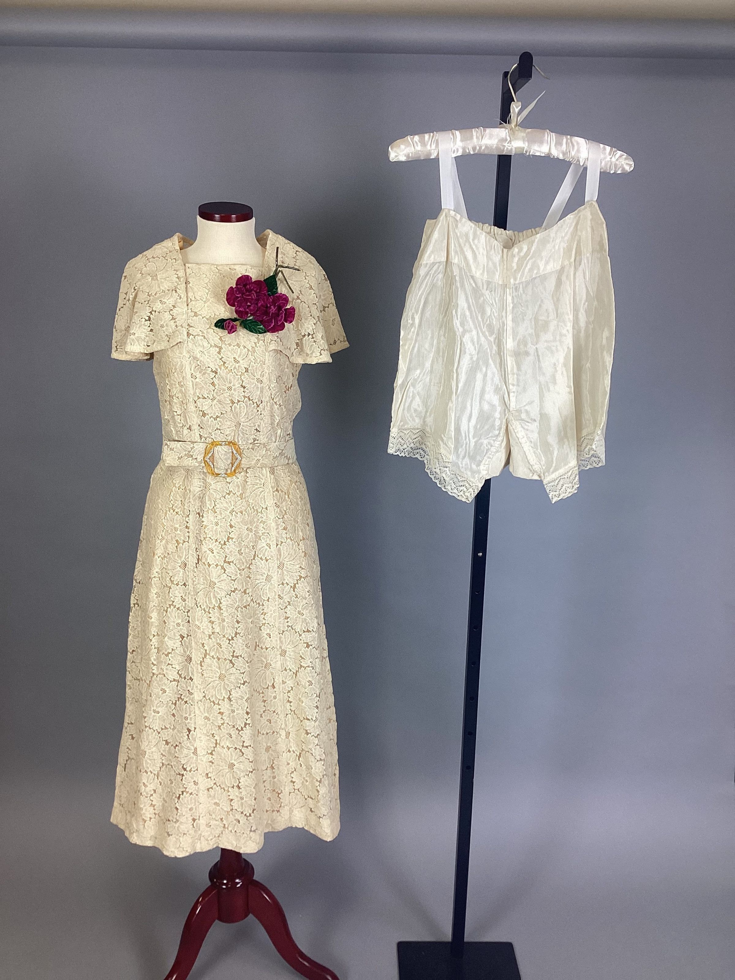 (A) Cotton lace dress of a pale peach color with knee-length, six-gored skirt and cape-sleeved bodice. There is a (B)self-belt with rhinestone decorated plastic amber buckle. (C) Slip is princess-style, peach color rayon (D) Drawers are white rayon with lace trim. (E) Corsage, velvet, 2 red roses and 2 green leaves.Use