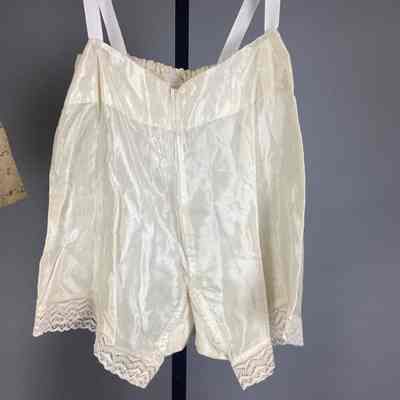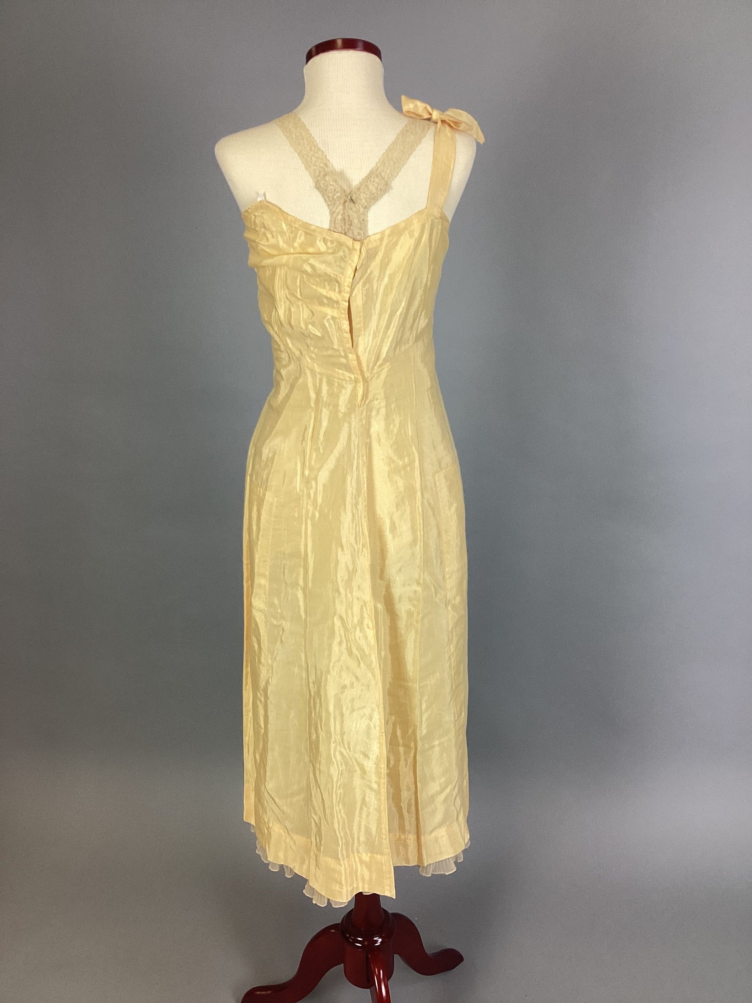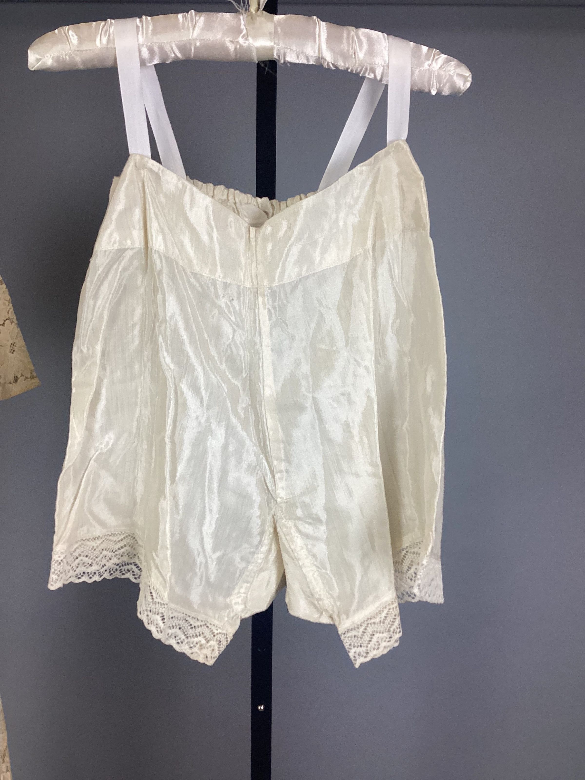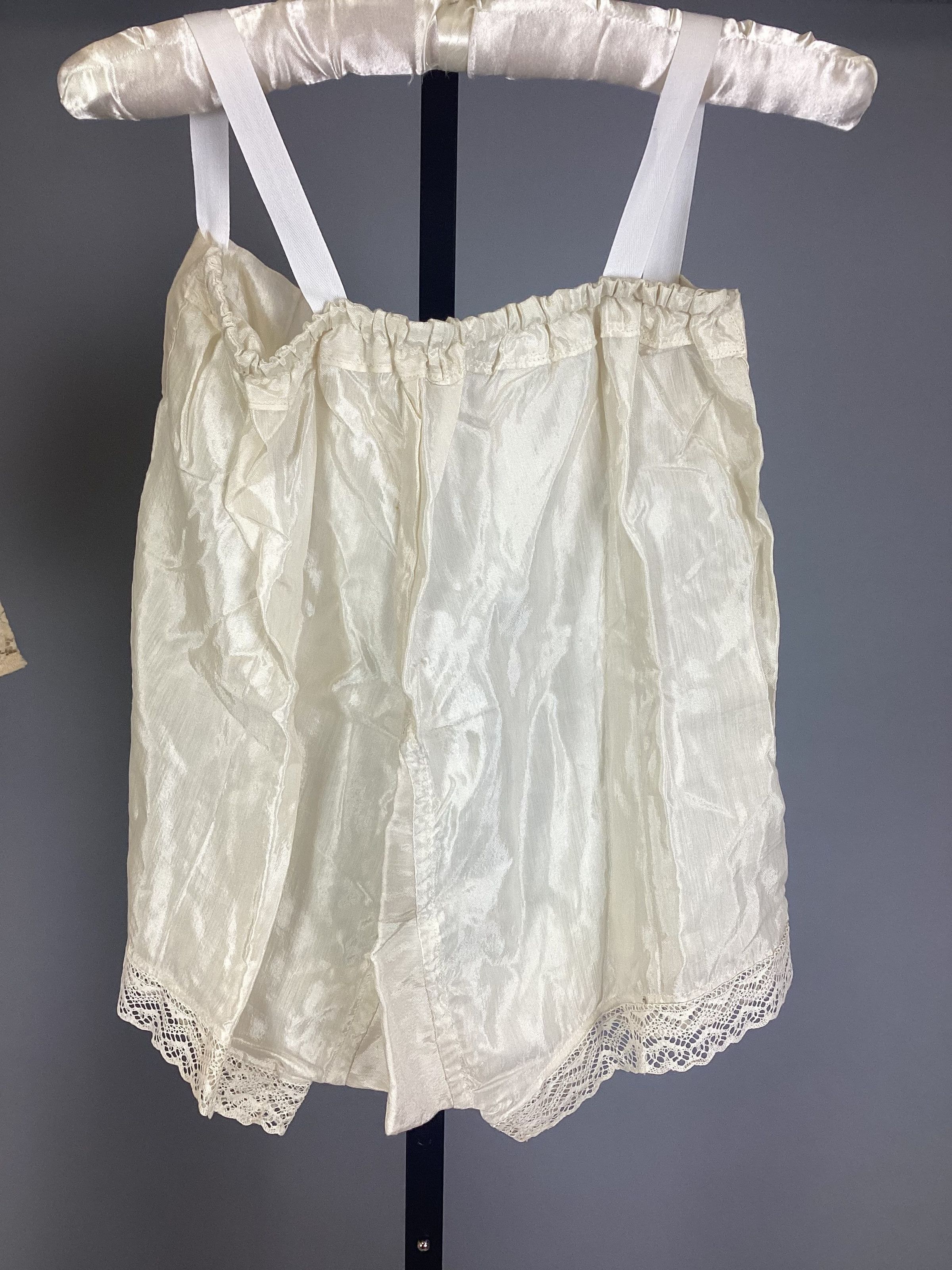 (A) Cotton lace dress of a pale peach color with knee-length, six-gored skirt and cape-sleeved bodice. There is a (B)self-belt with rhinestone decorated plastic amber buckle. (C) Slip is princess-style, peach color rayon (D) Drawers are white rayon with lace trim. (E) Corsage, velvet, 2 red roses and 2 green leaves.Use