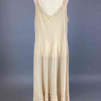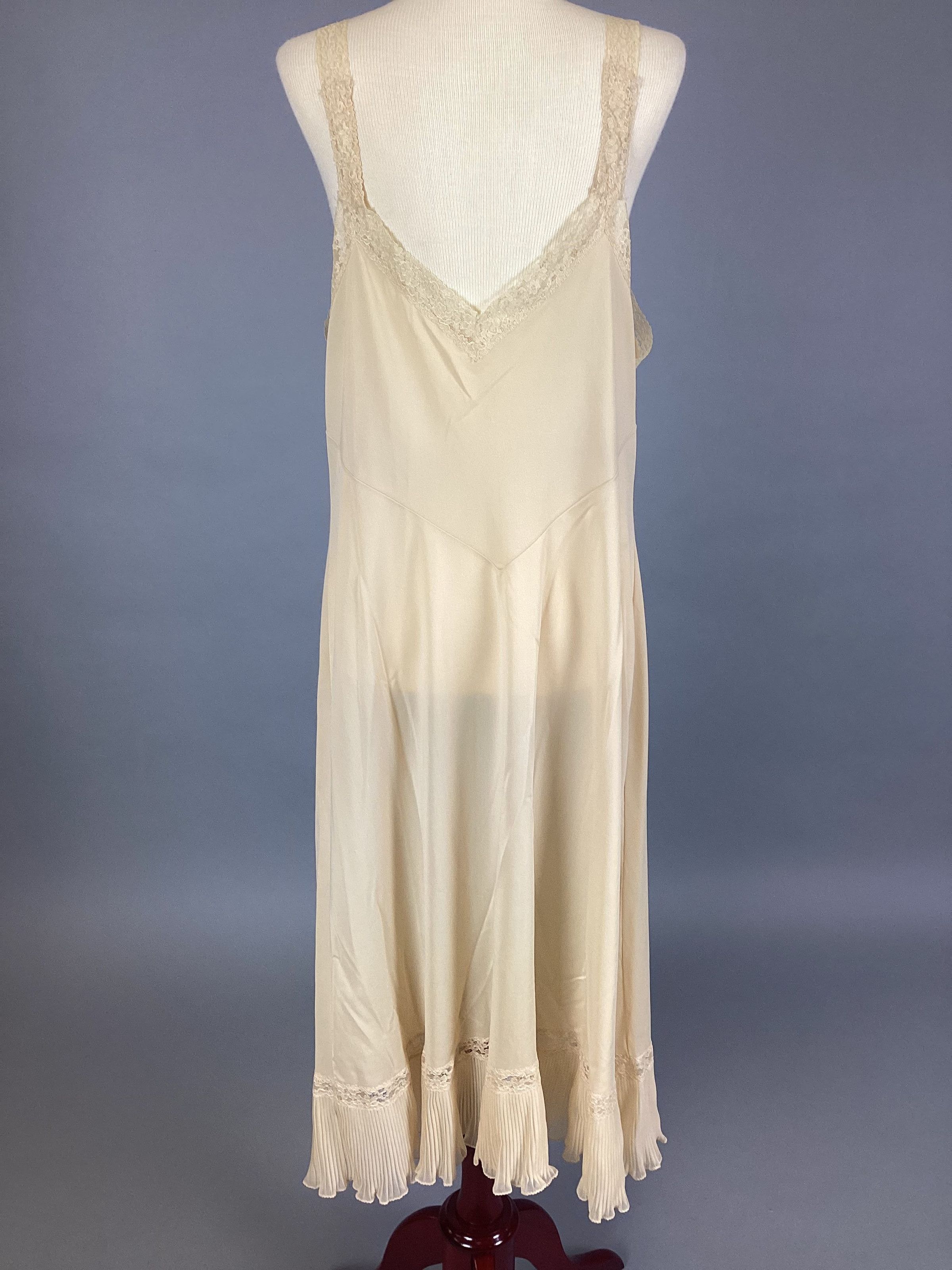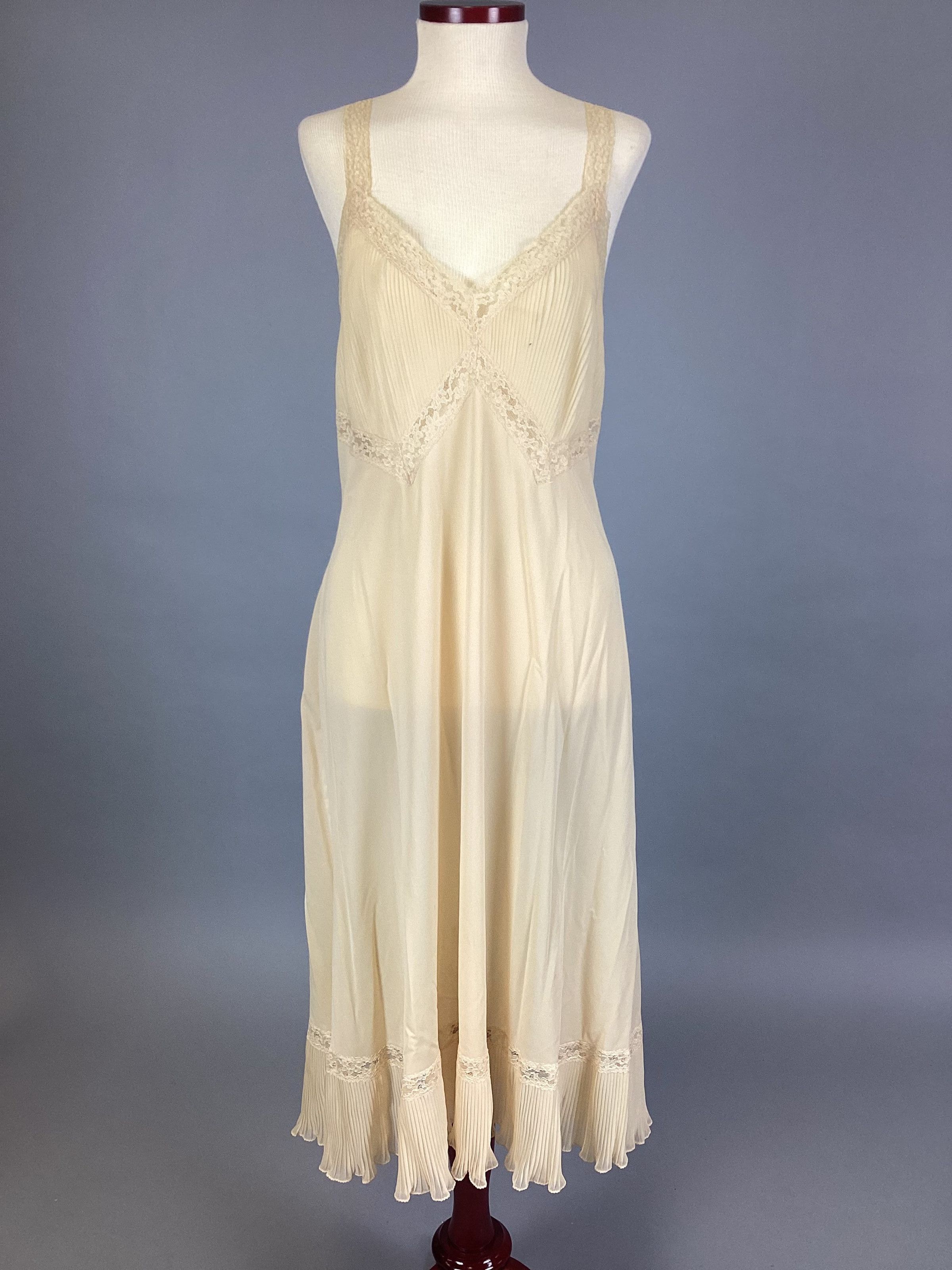 Ladies nylon slip with 4-3/4" pleated ruffle on hem and pleated yoke: 1" lace insertion outlines yoke and top of hem ruffle. Straps are also lace. Slip is 45" over all and in ecru color.Use