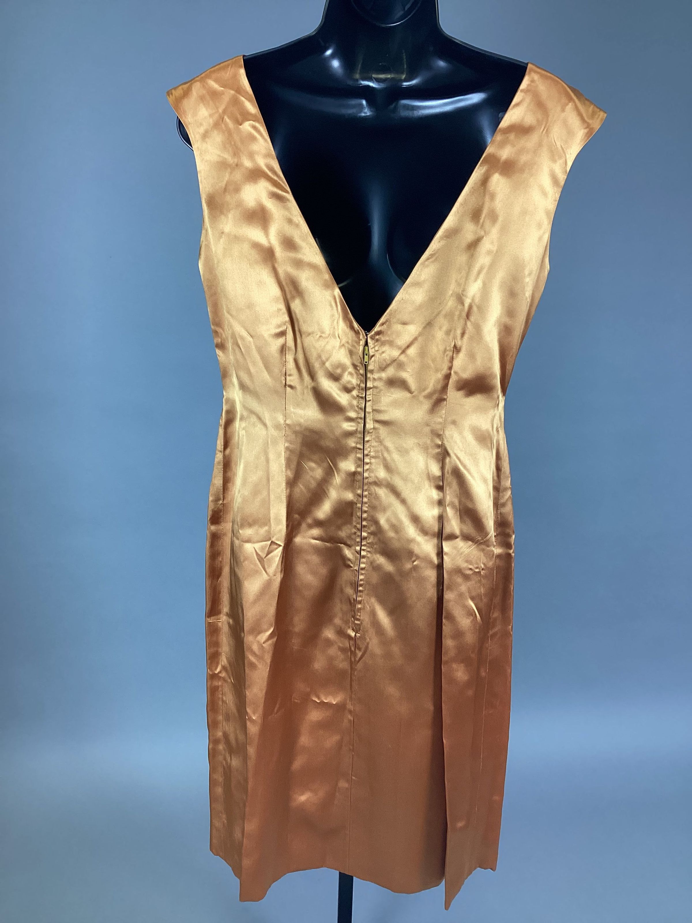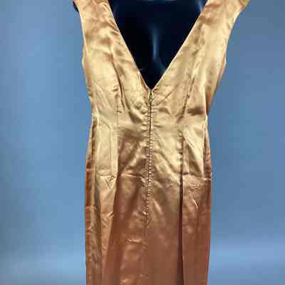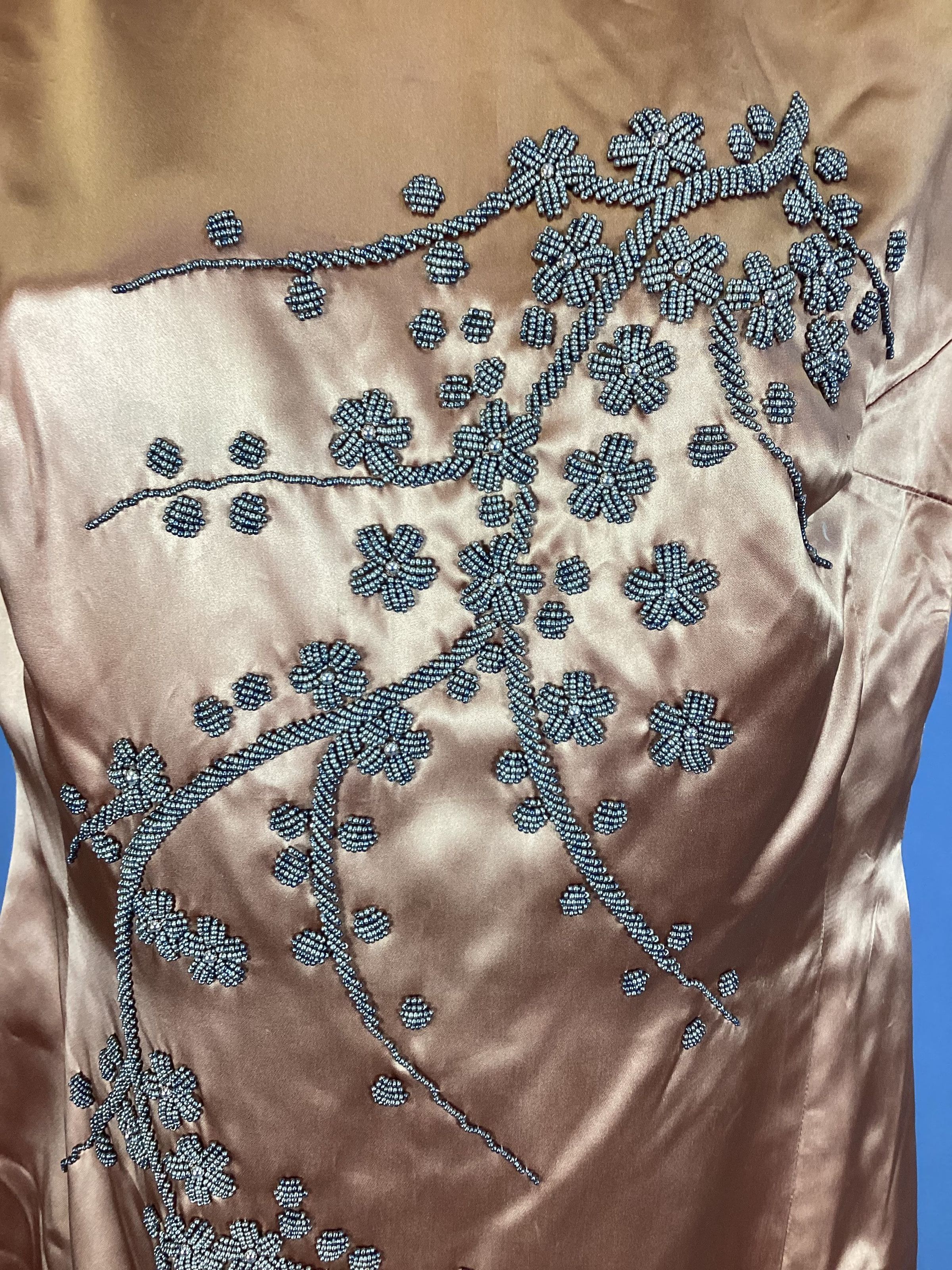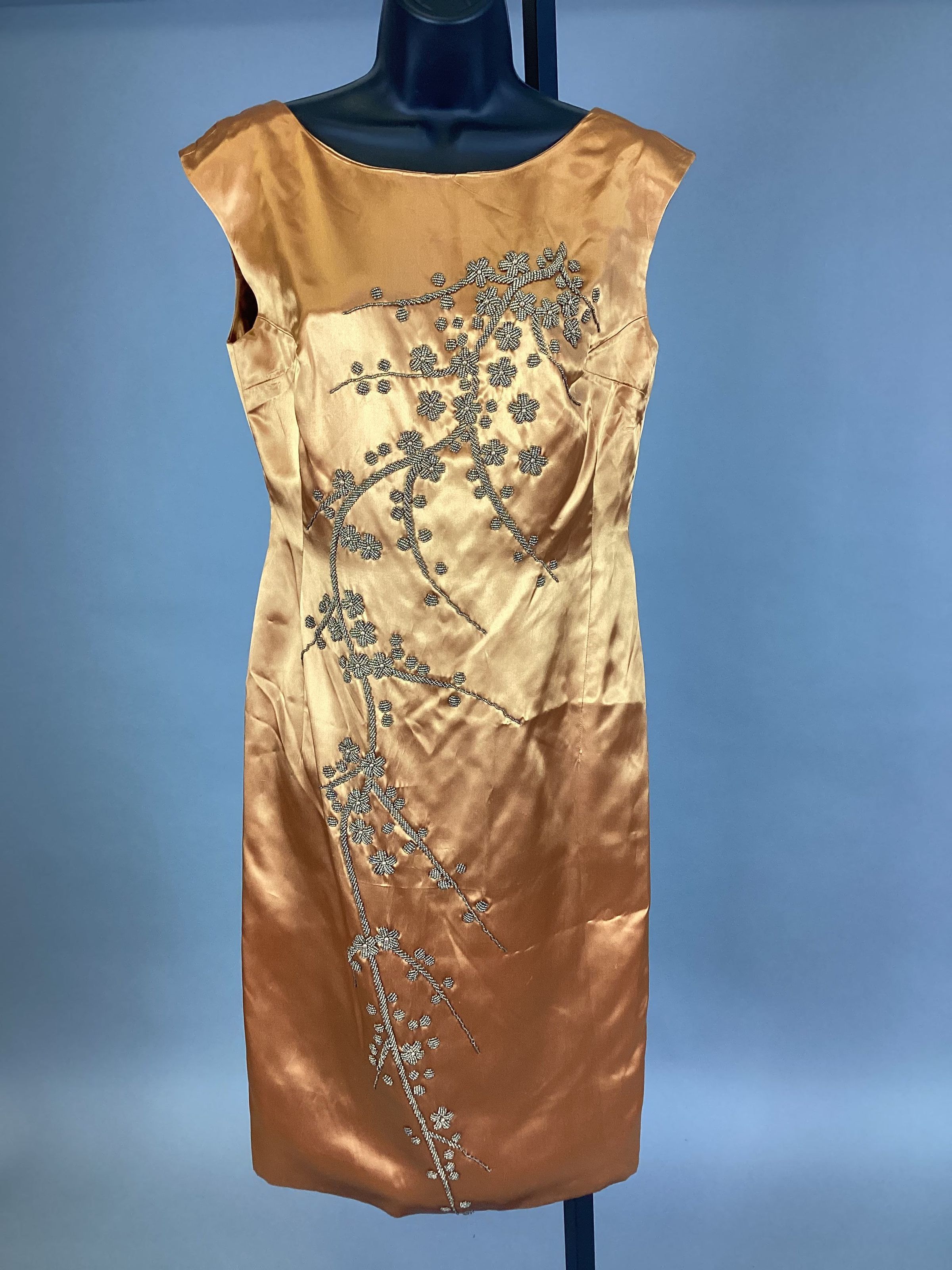 Old-gold color, beaded design front, fully lined, zipper in back, low-cut back.Collection