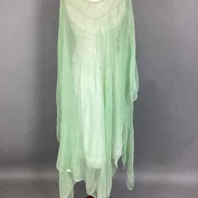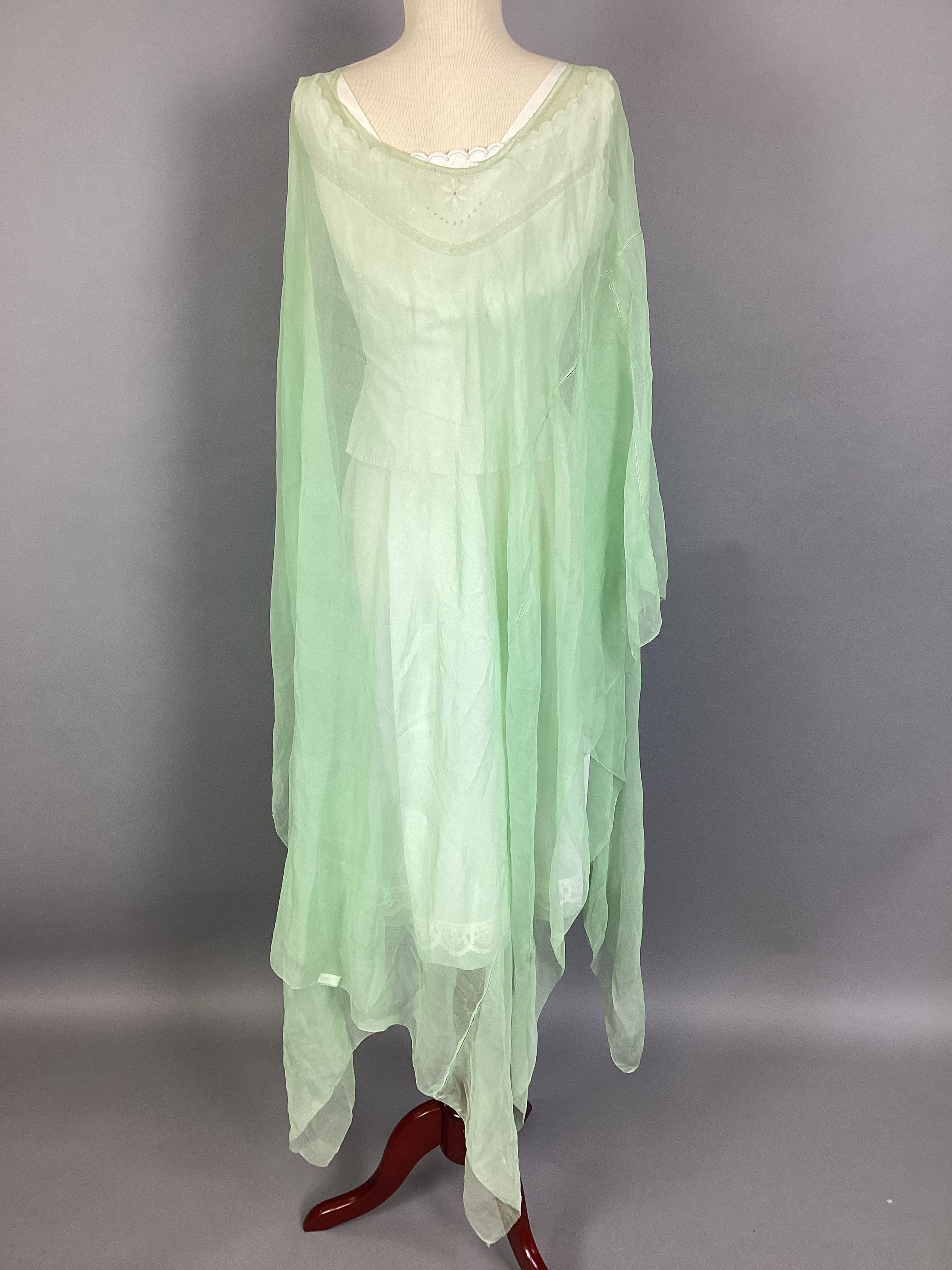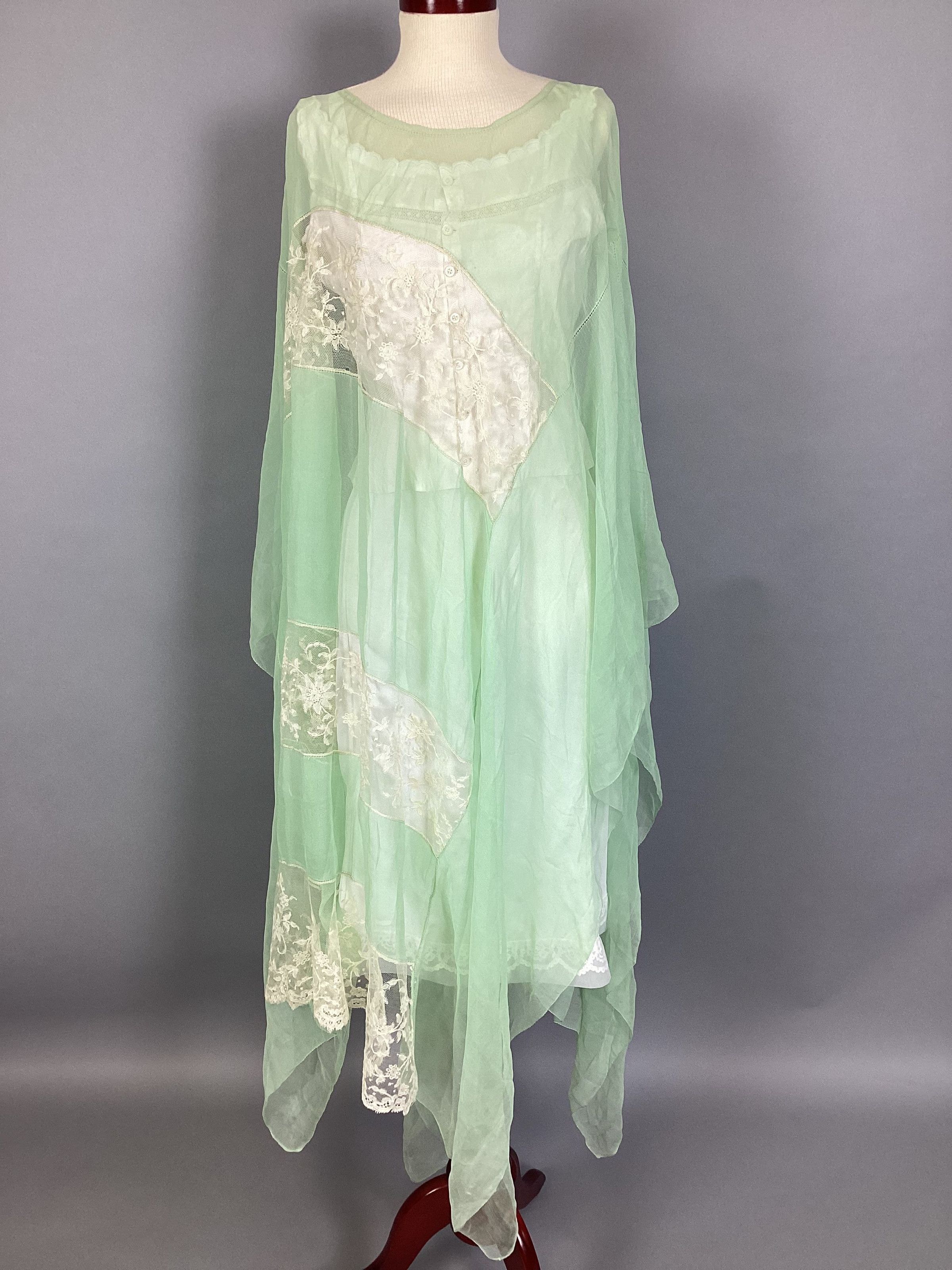 Pale green overdress. Two 5 1/2" wide lace panels are hem stitched inserts in the front. At the bottom of front is a 7" lace panel witha scalloped edge. There is a scooped neckline with a hemstitch edge.Use