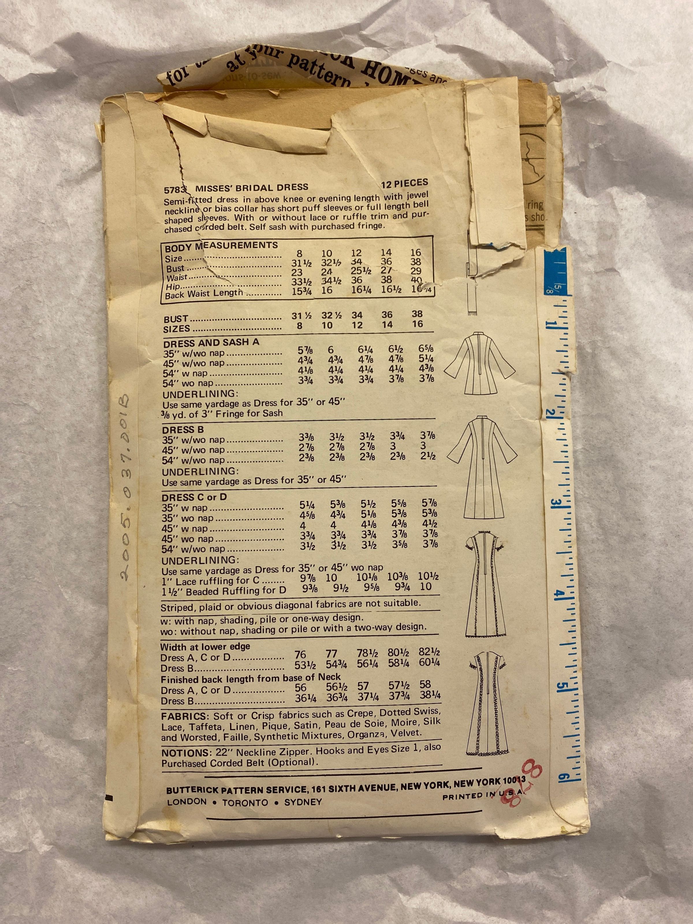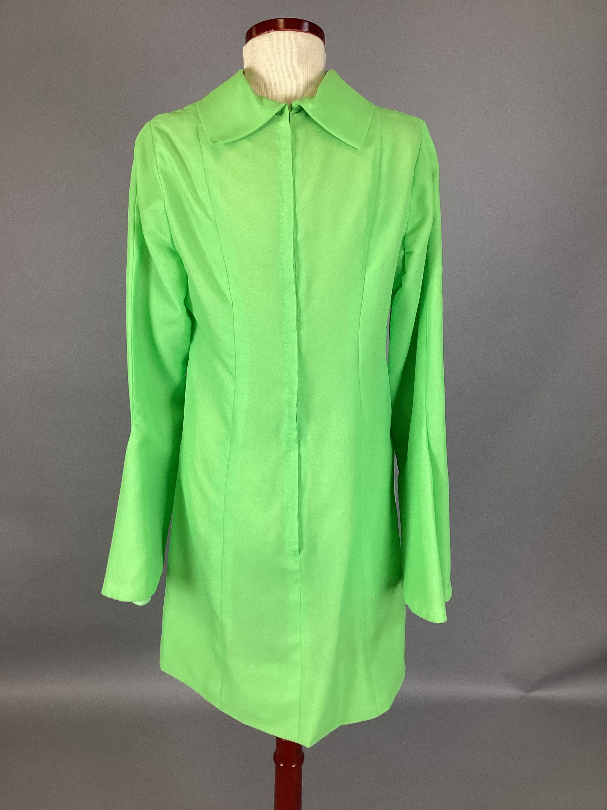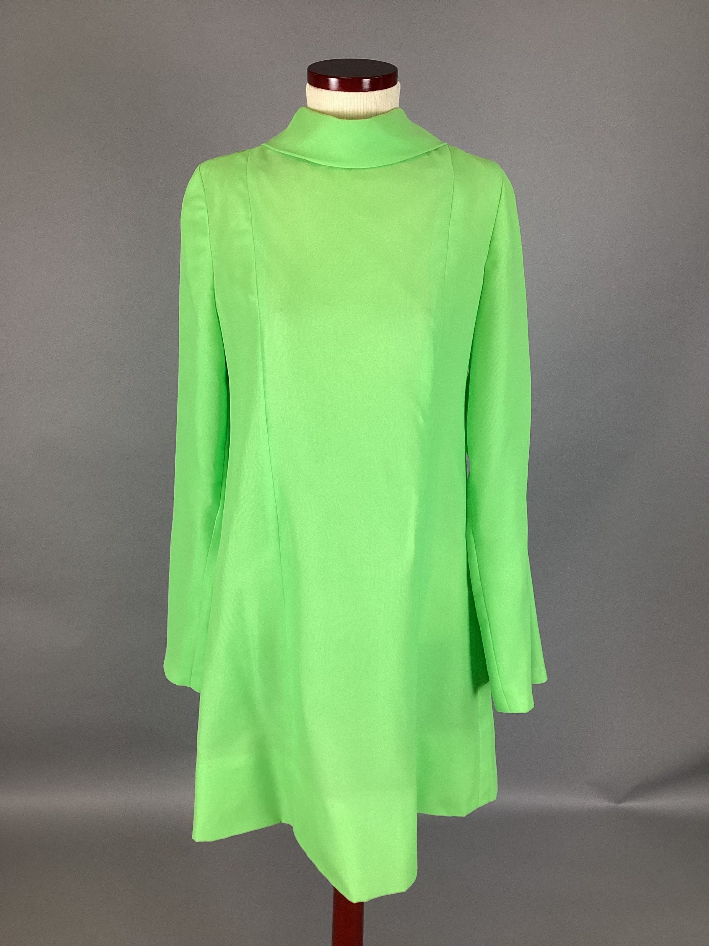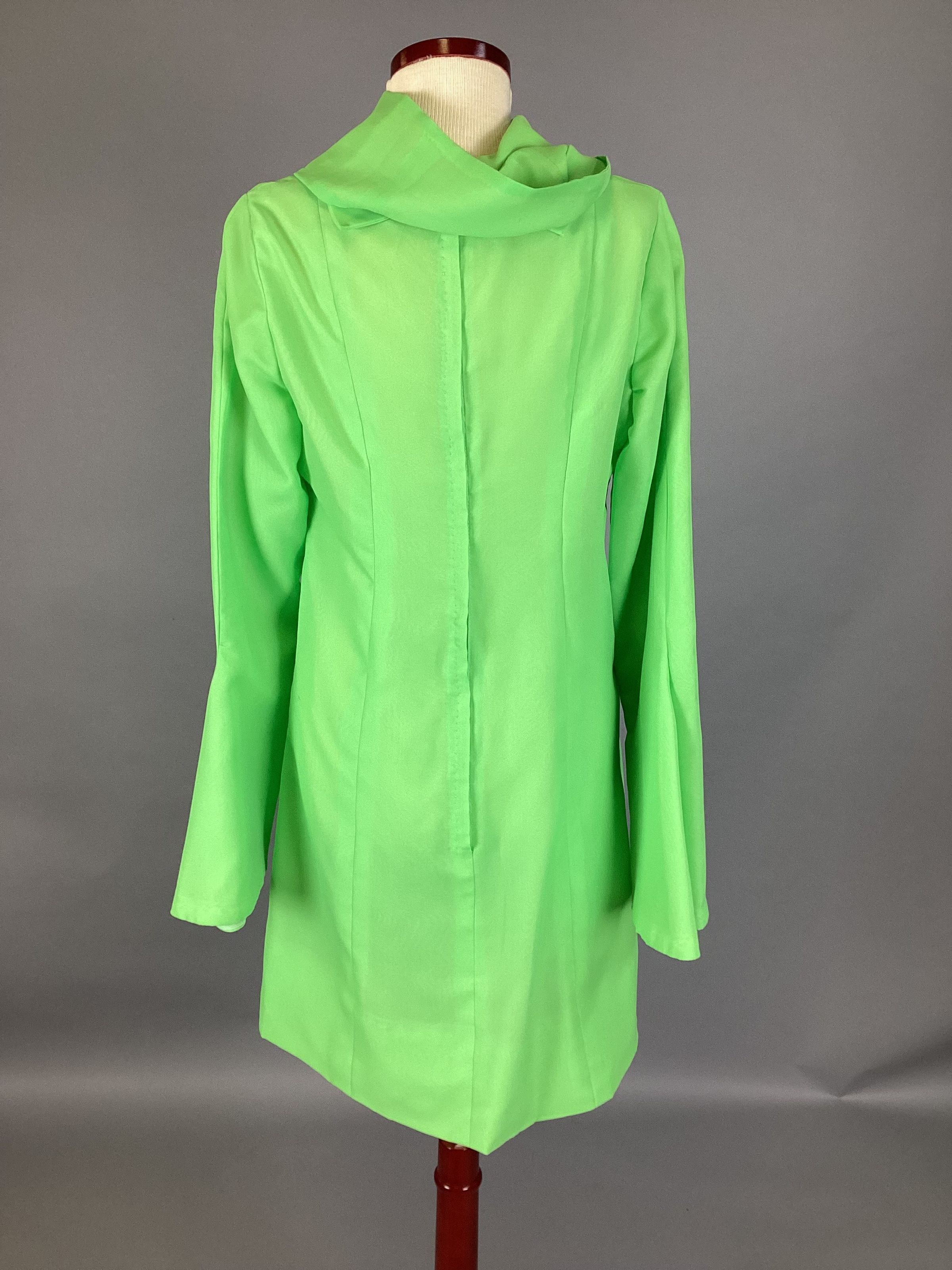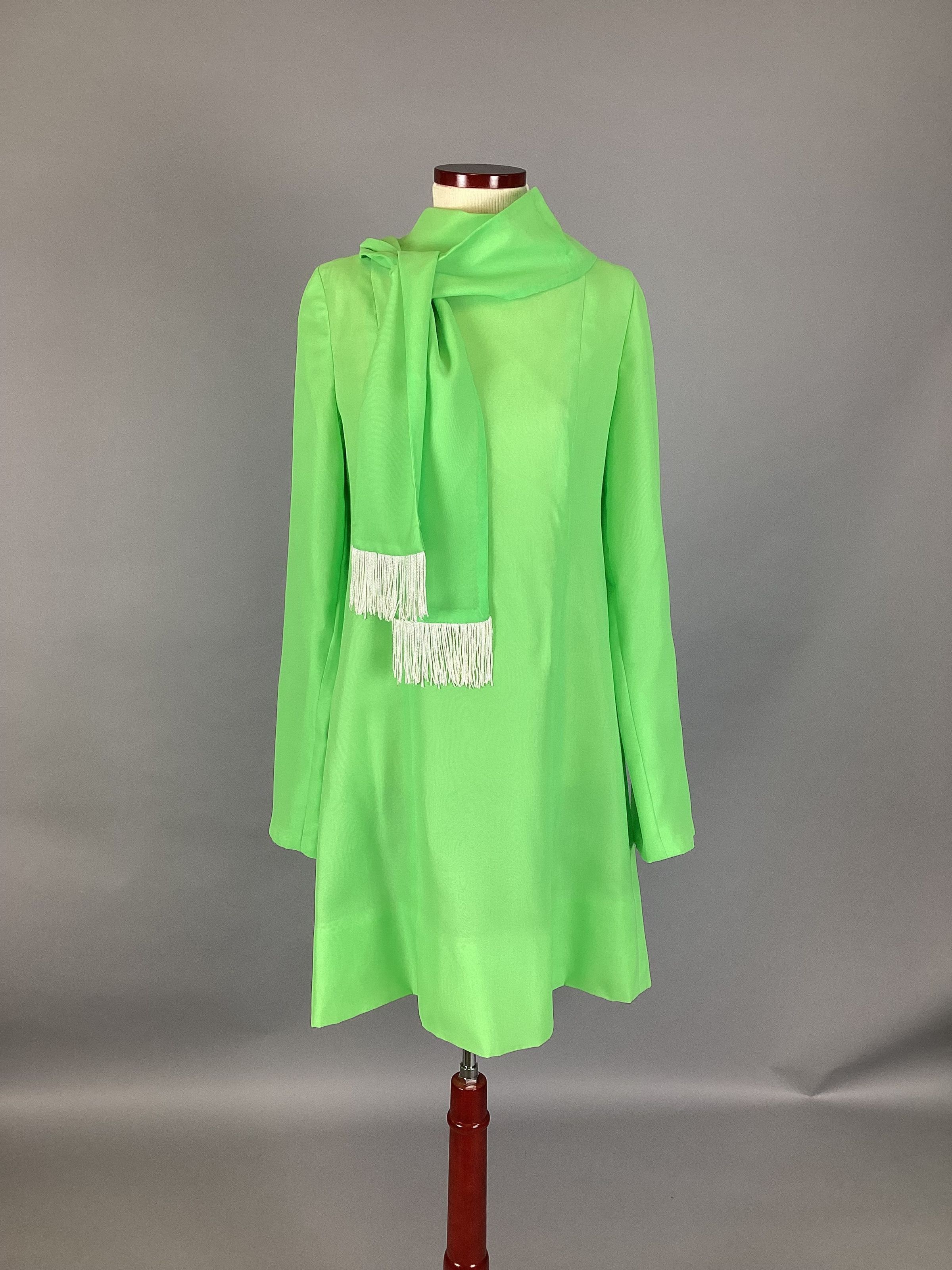 A monochrome green mod-style shift mini dress with a matching belt / scarf / sash. The dress has long bell sleeves and a faux-turtleneck collar. It zips in the back. The scarf has a white fringe hanging from each end. Also included is the Butterick 5783 B pattern for the dress, size 10. Sub-numbered A-C.Use