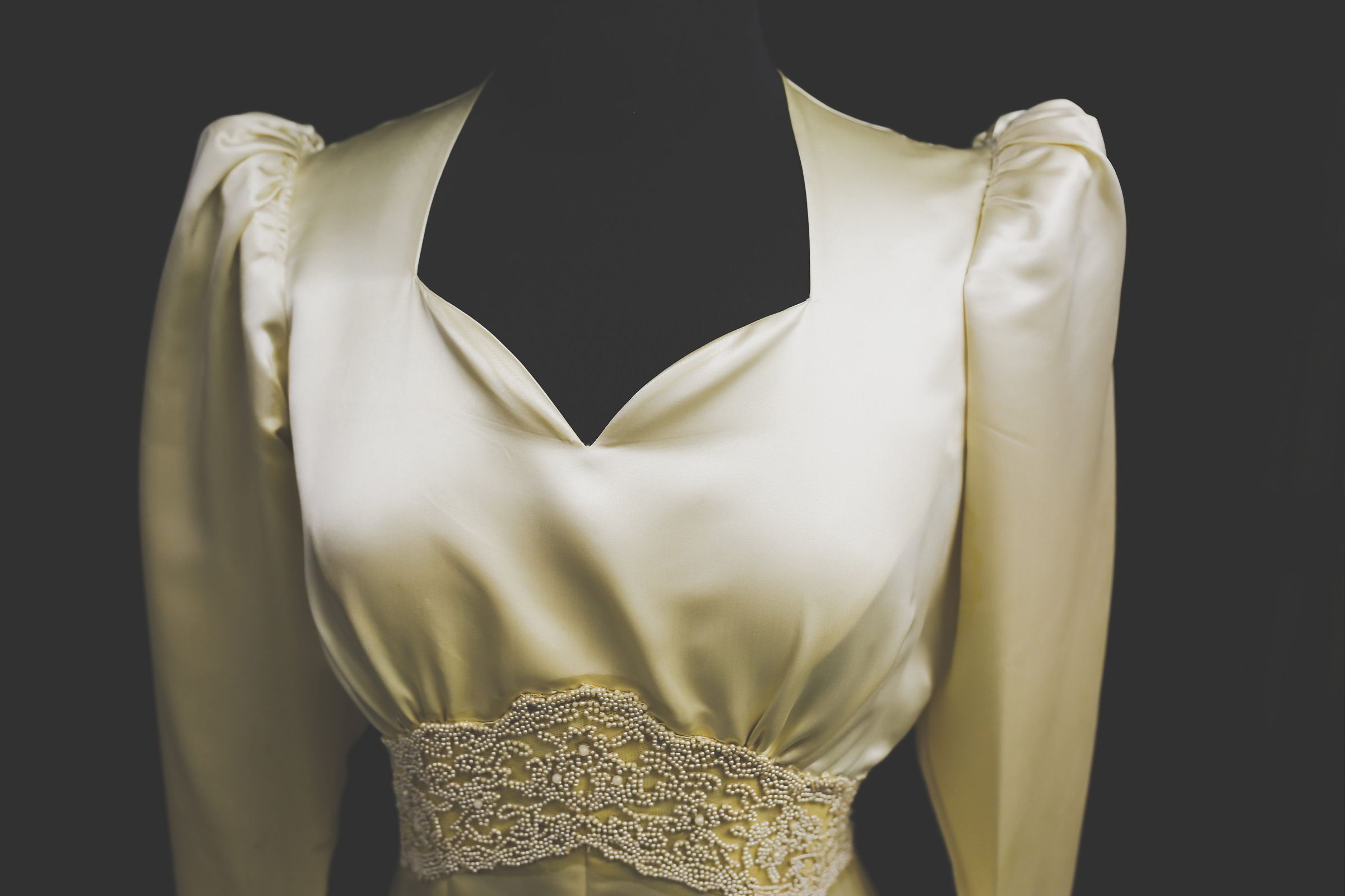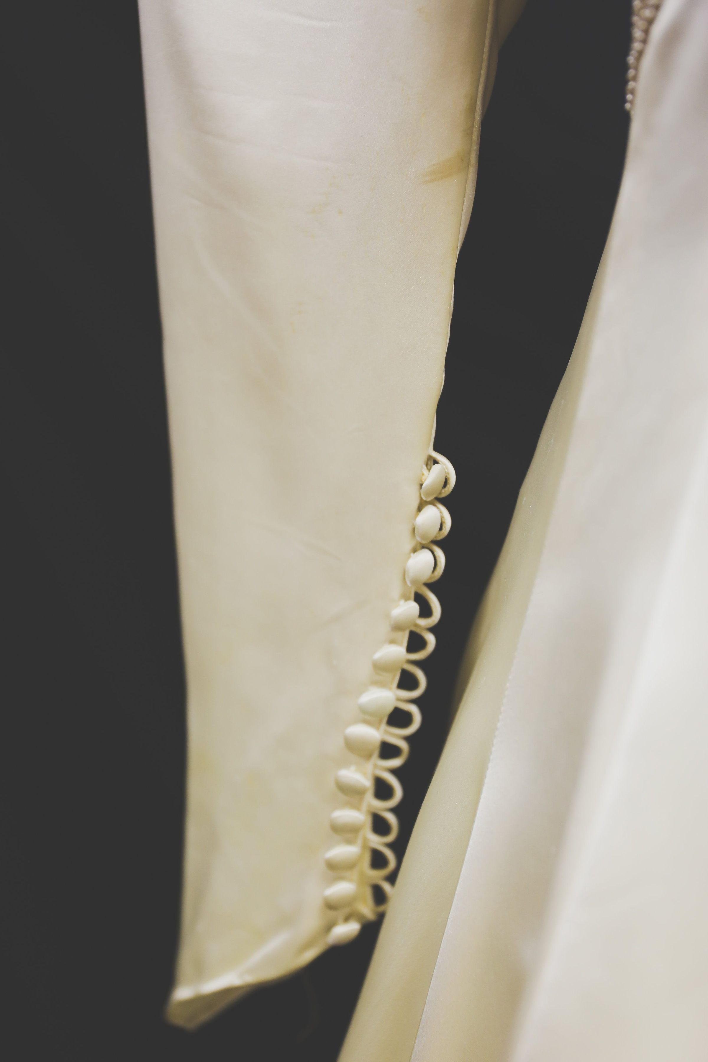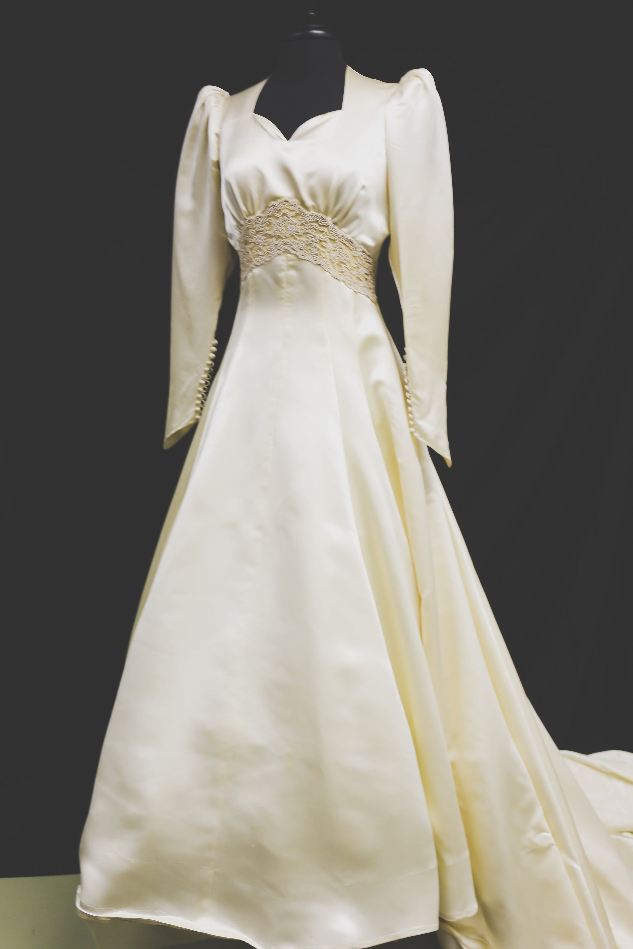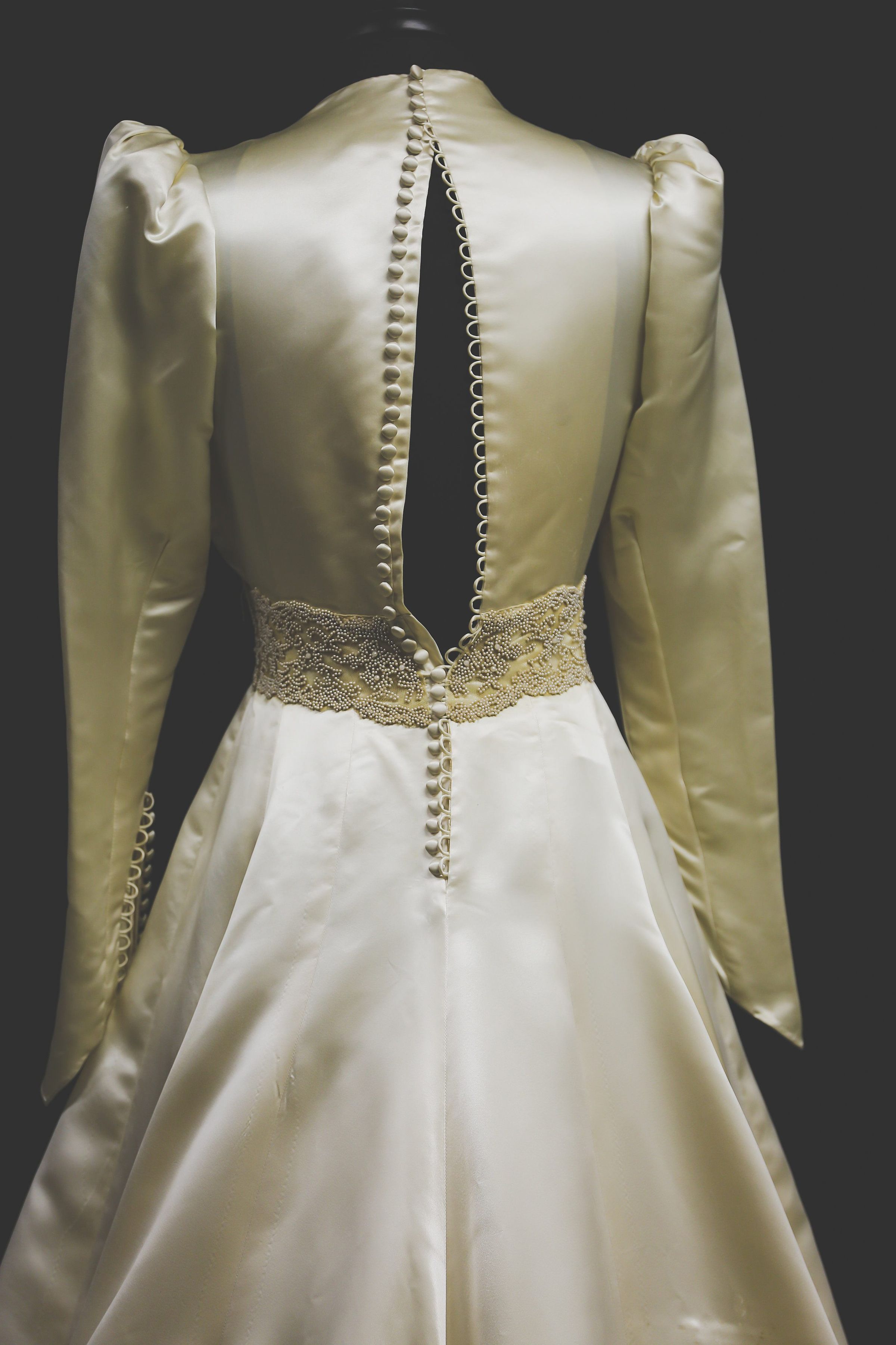 An ivory satin wedding gown with a cathedral train, beading around the waist, and buttons on the long sleeves. For the cathedral-length veil, see: 2017.019.002.Use