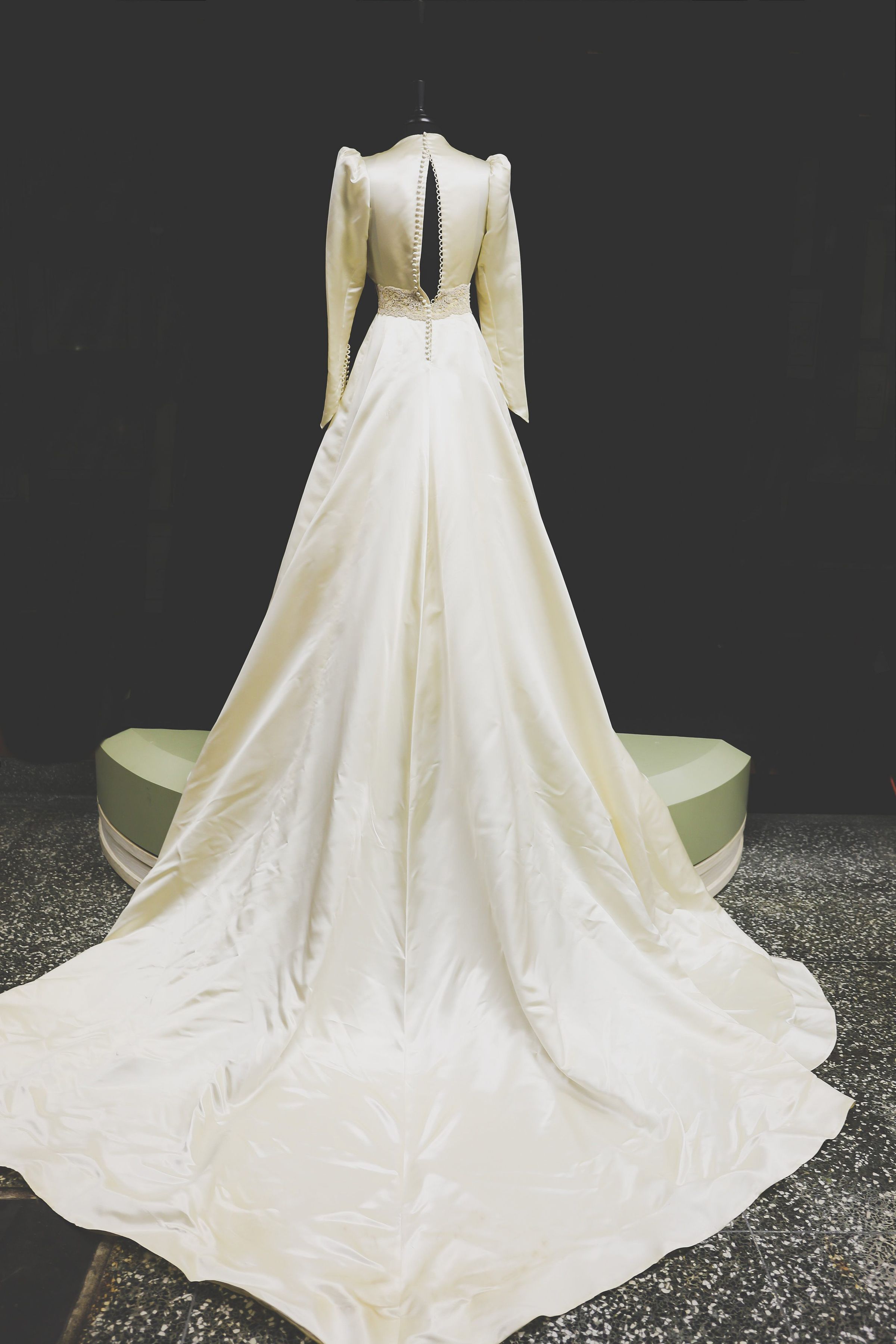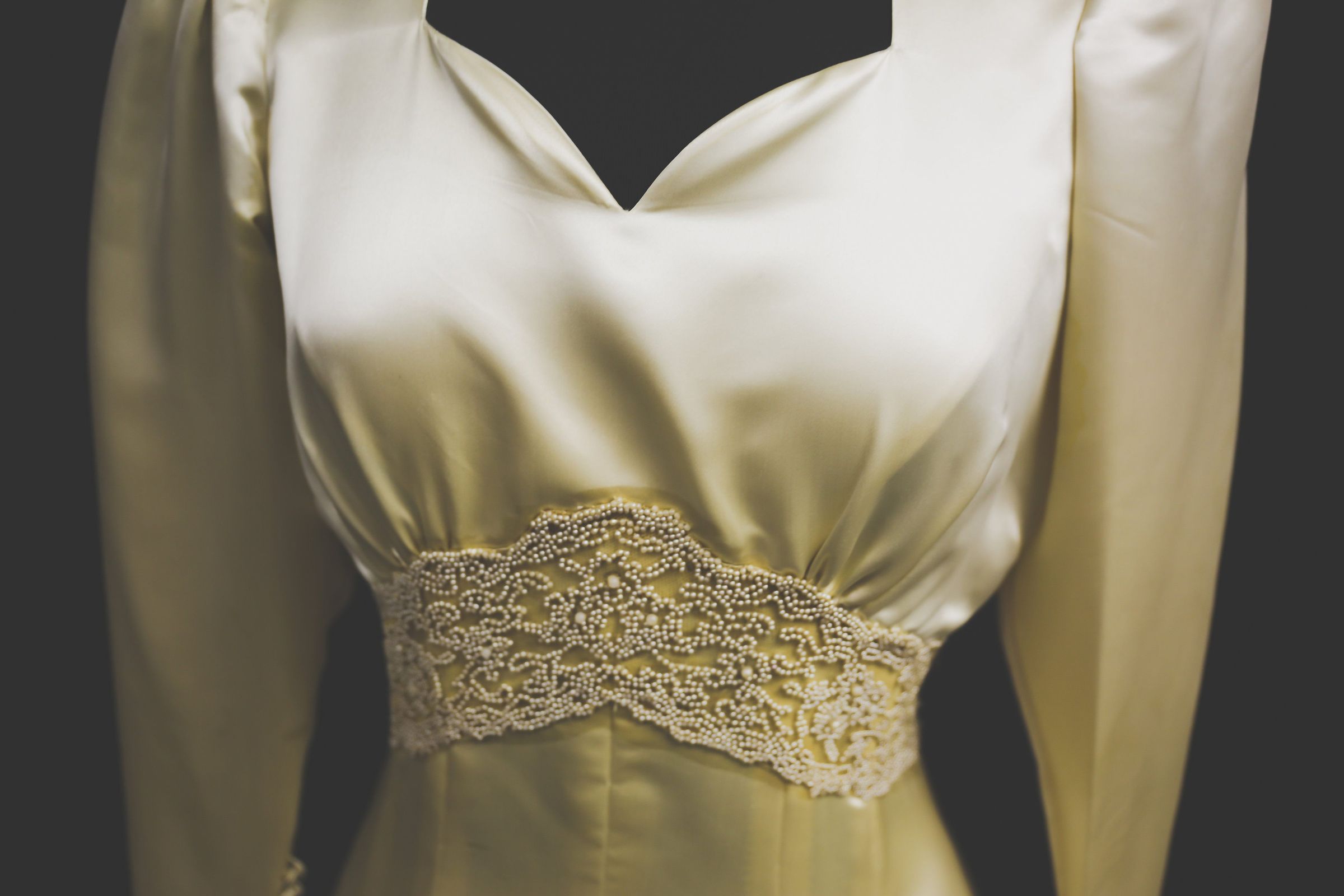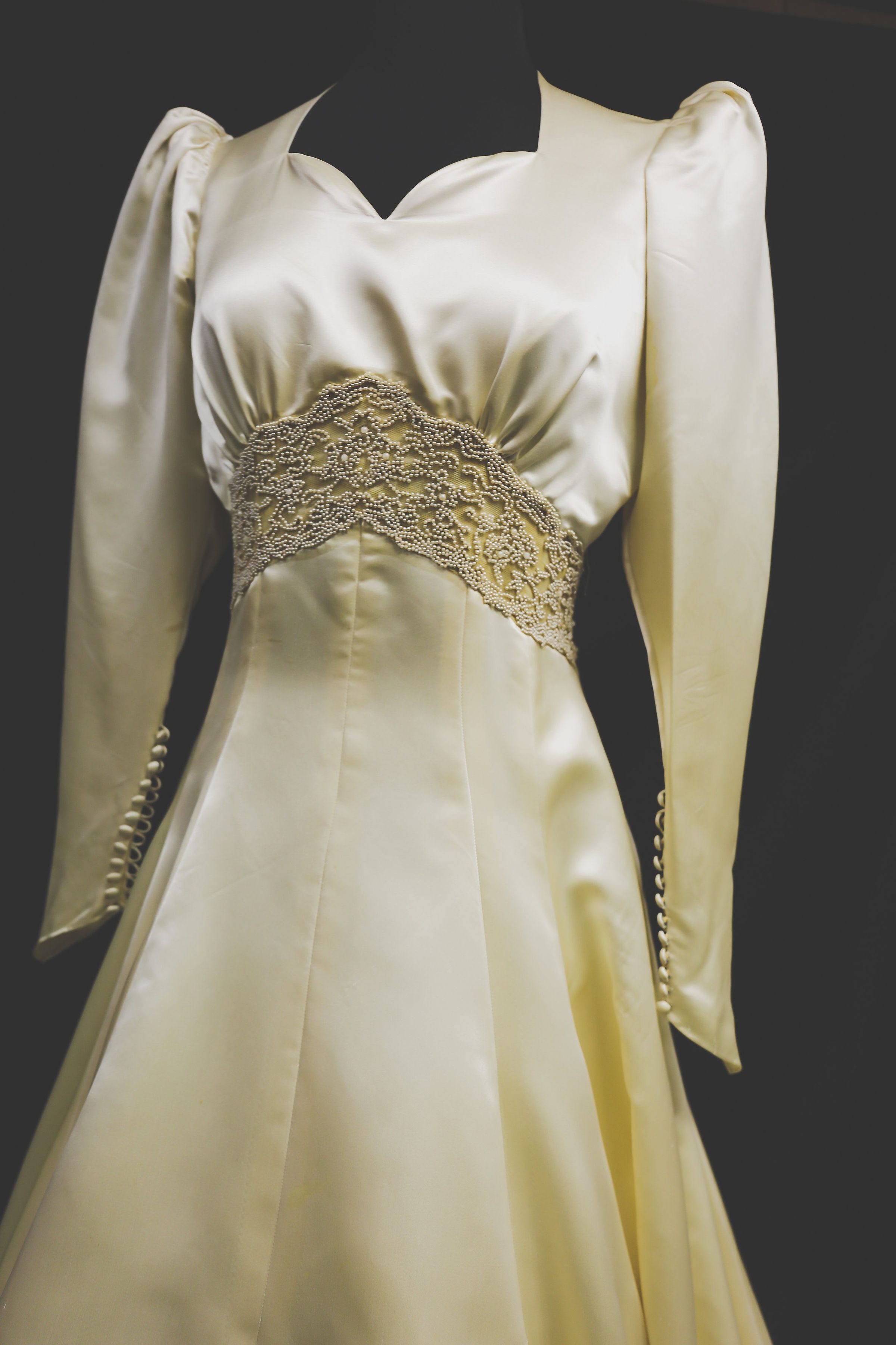 An ivory satin wedding gown with a cathedral train, beading around the waist, and buttons on the long sleeves. For the cathedral-length veil, see: 2017.019.002.Use