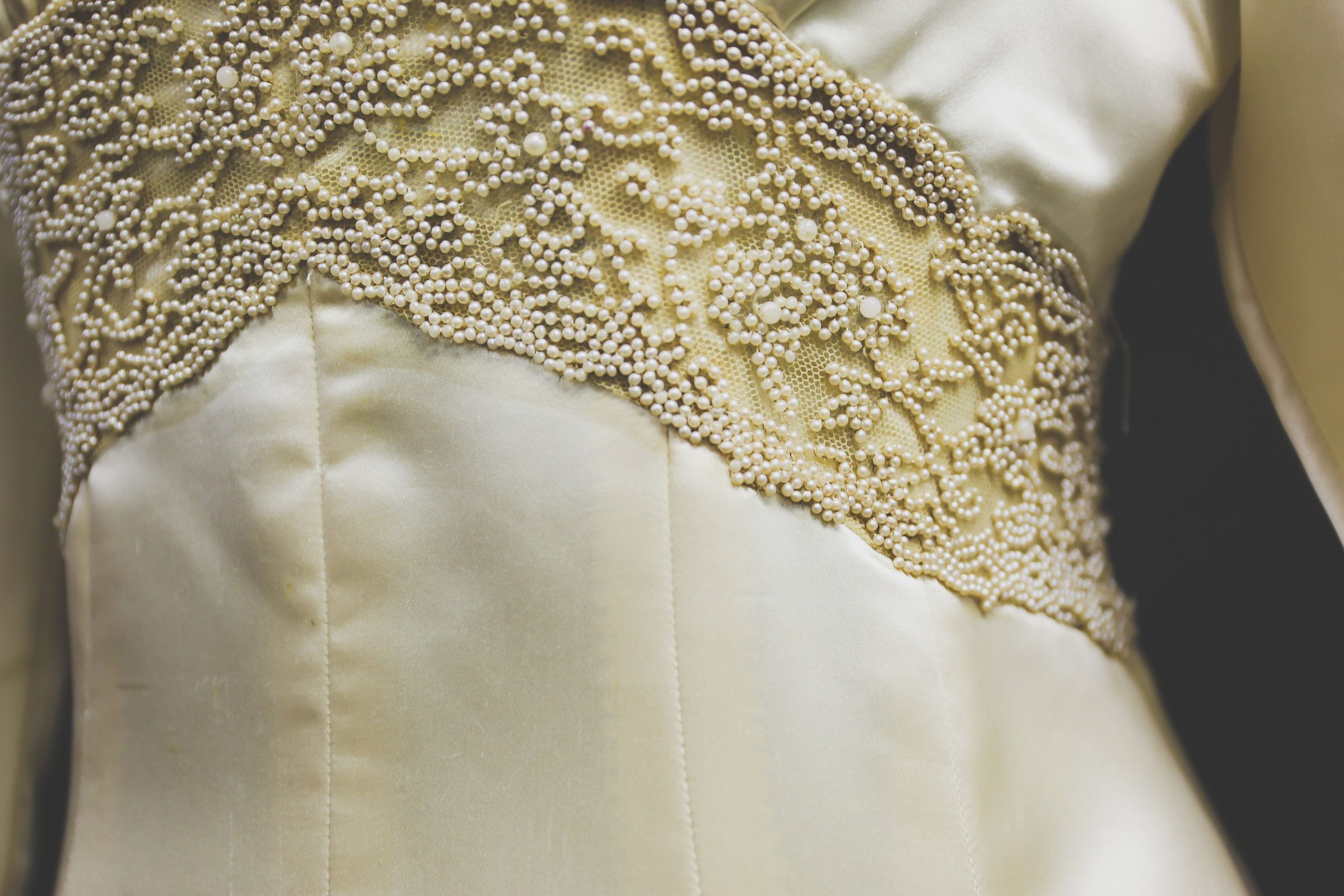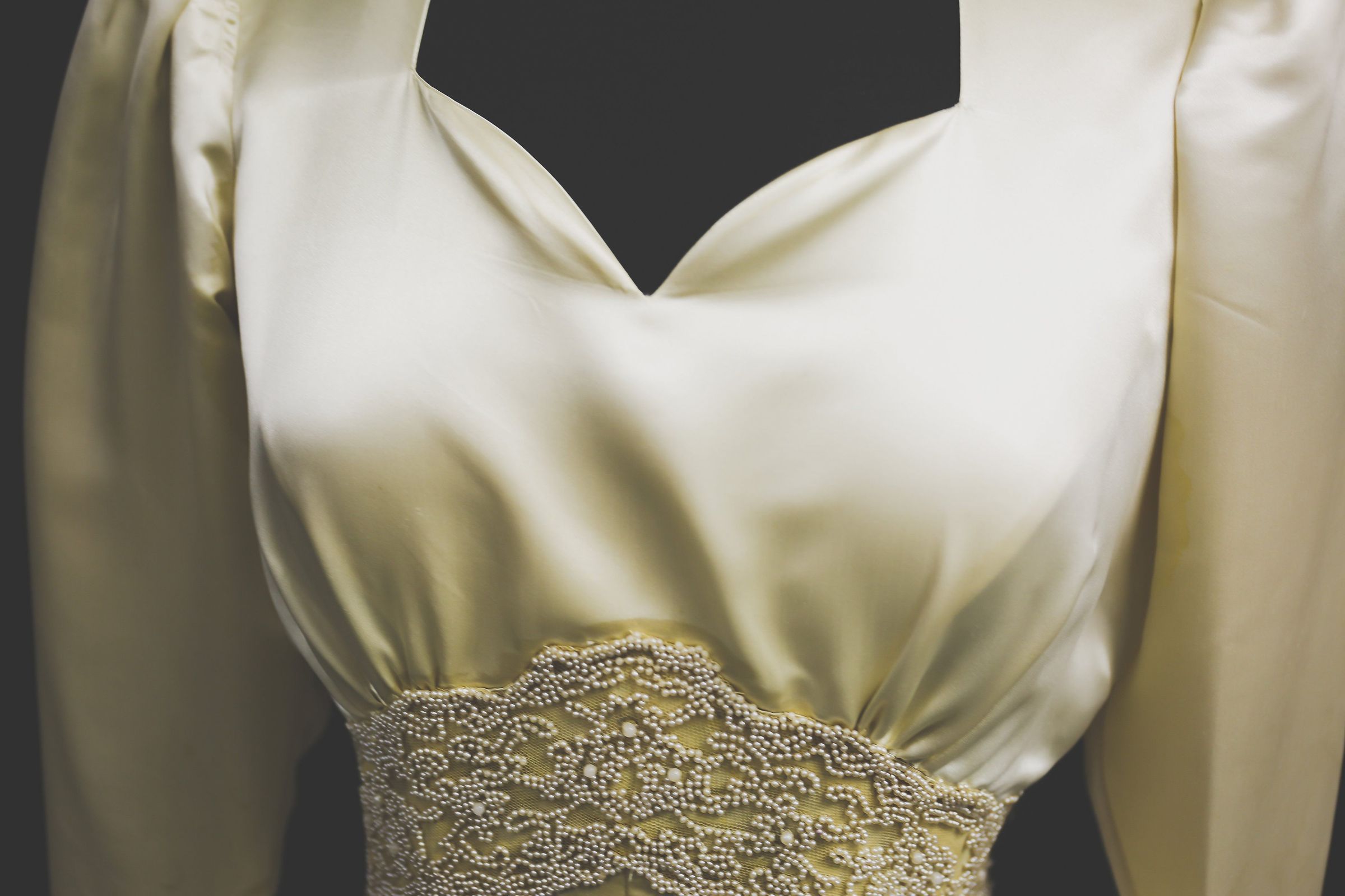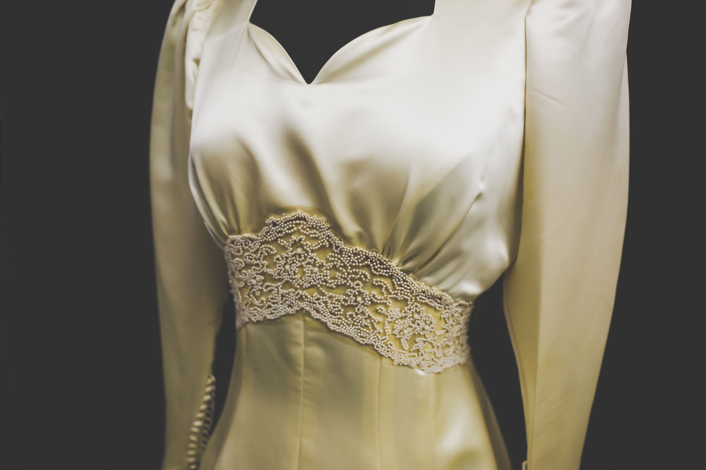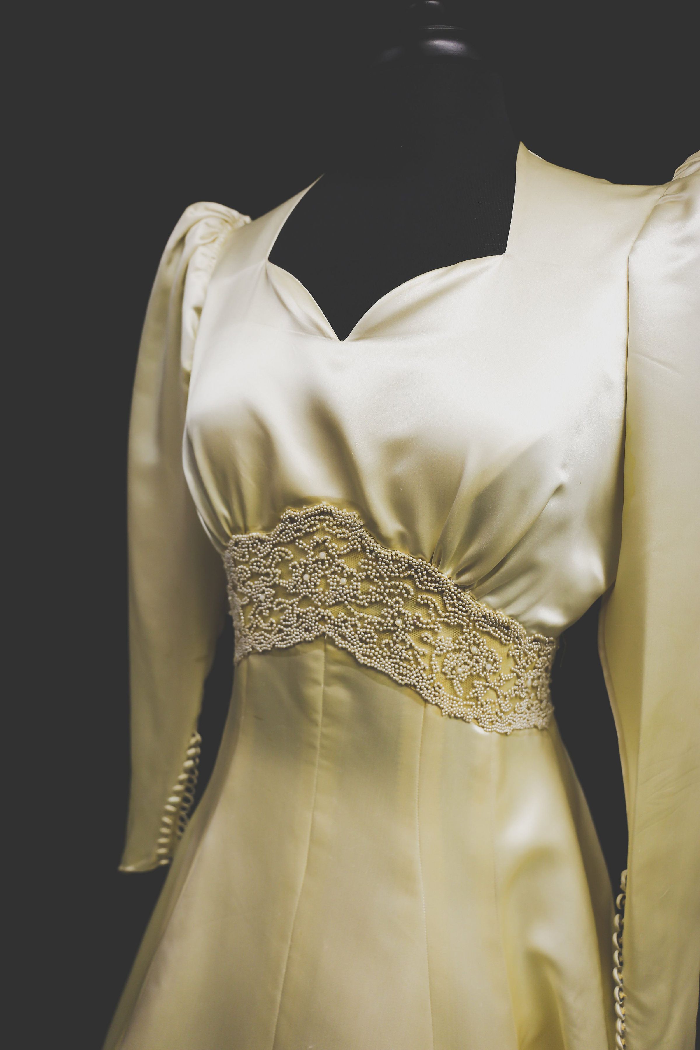 An ivory satin wedding gown with a cathedral train, beading around the waist, and buttons on the long sleeves. For the cathedral-length veil, see: 2017.019.002.Use