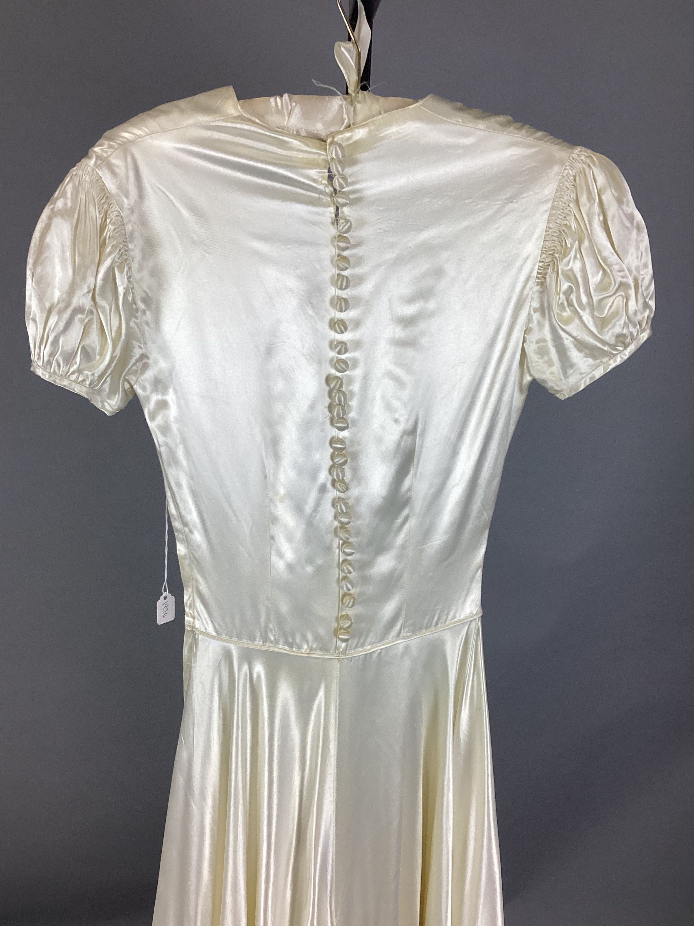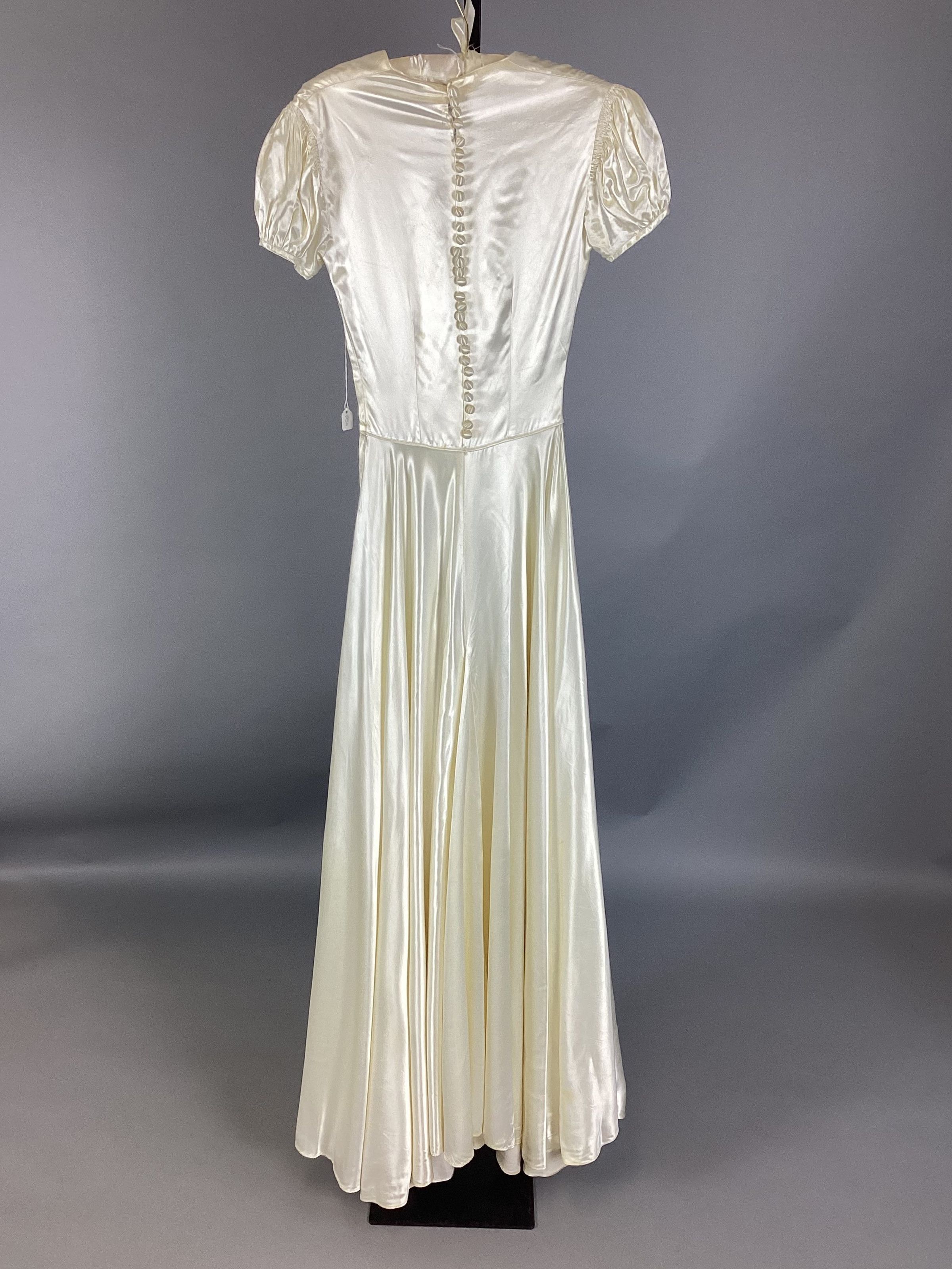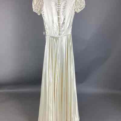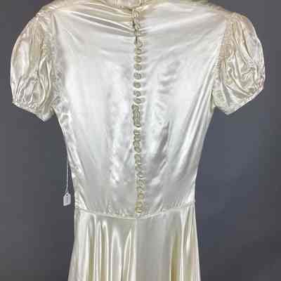 A: Ivory satin wedding dress; short, puffy sleeves, ribbon belt; 29 covered satin buttons down back, side zipper.