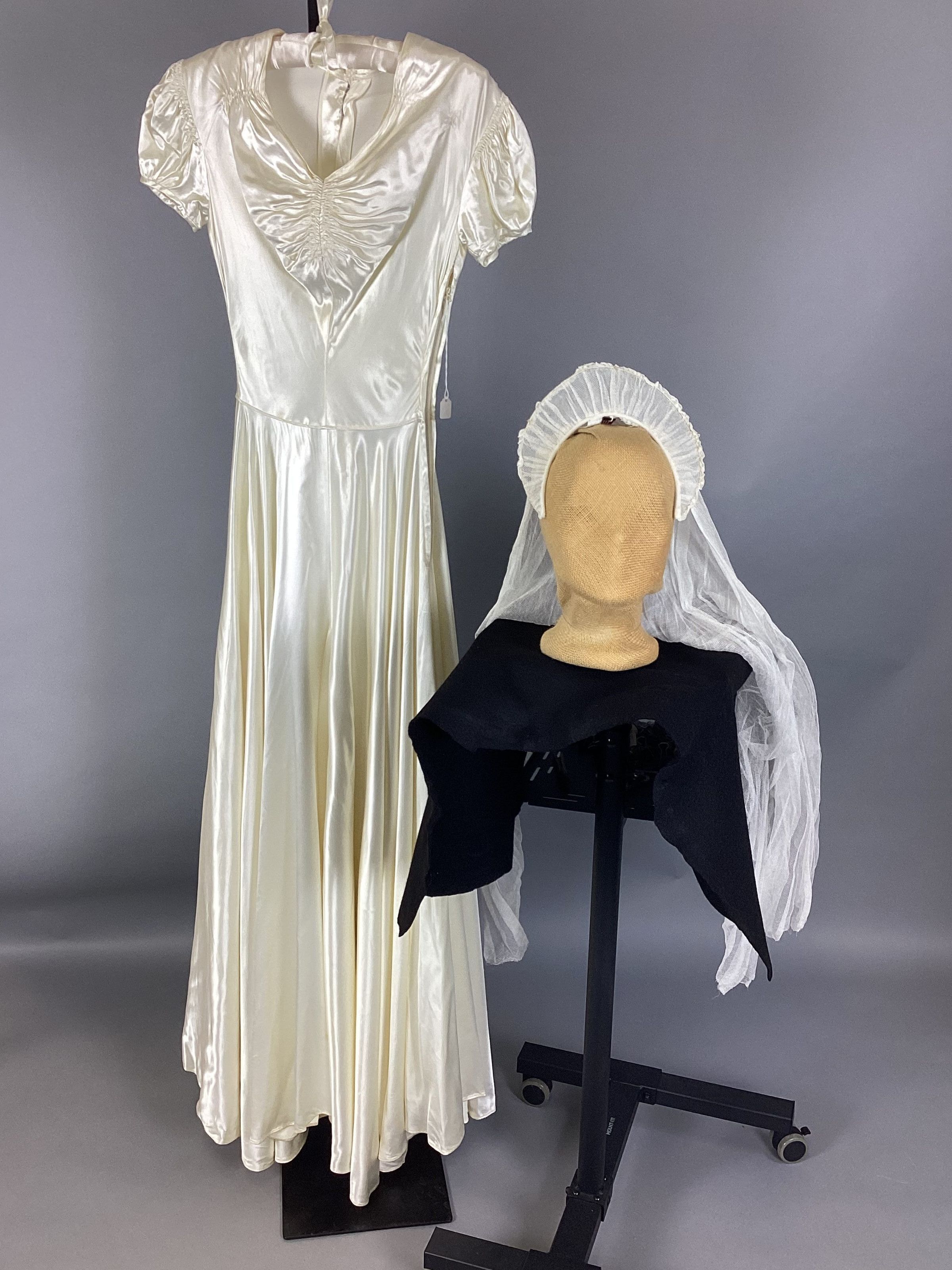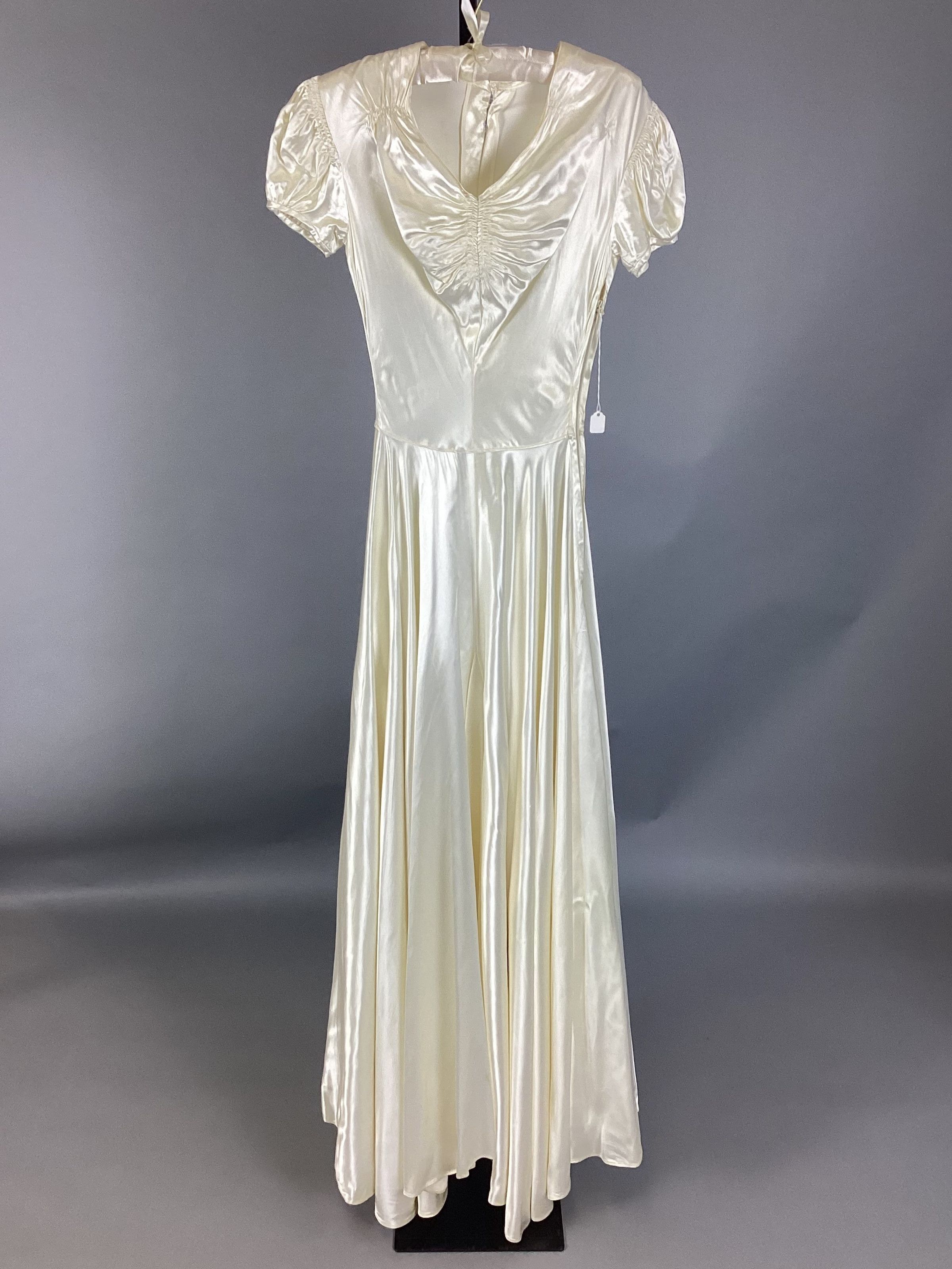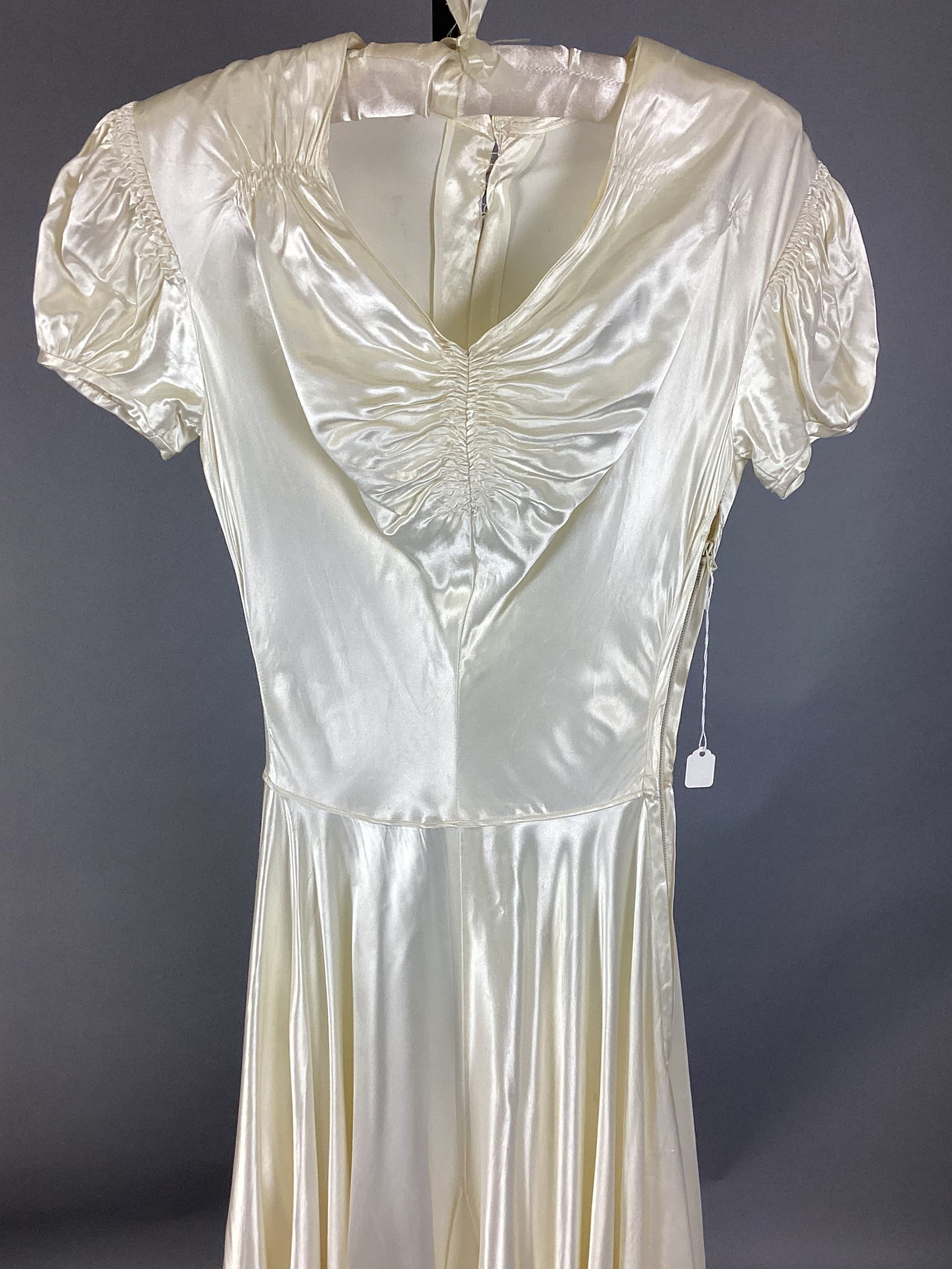 A: Ivory satin wedding dress; short, puffy sleeves, ribbon belt; 29 covered satin buttons down back, side zipper.