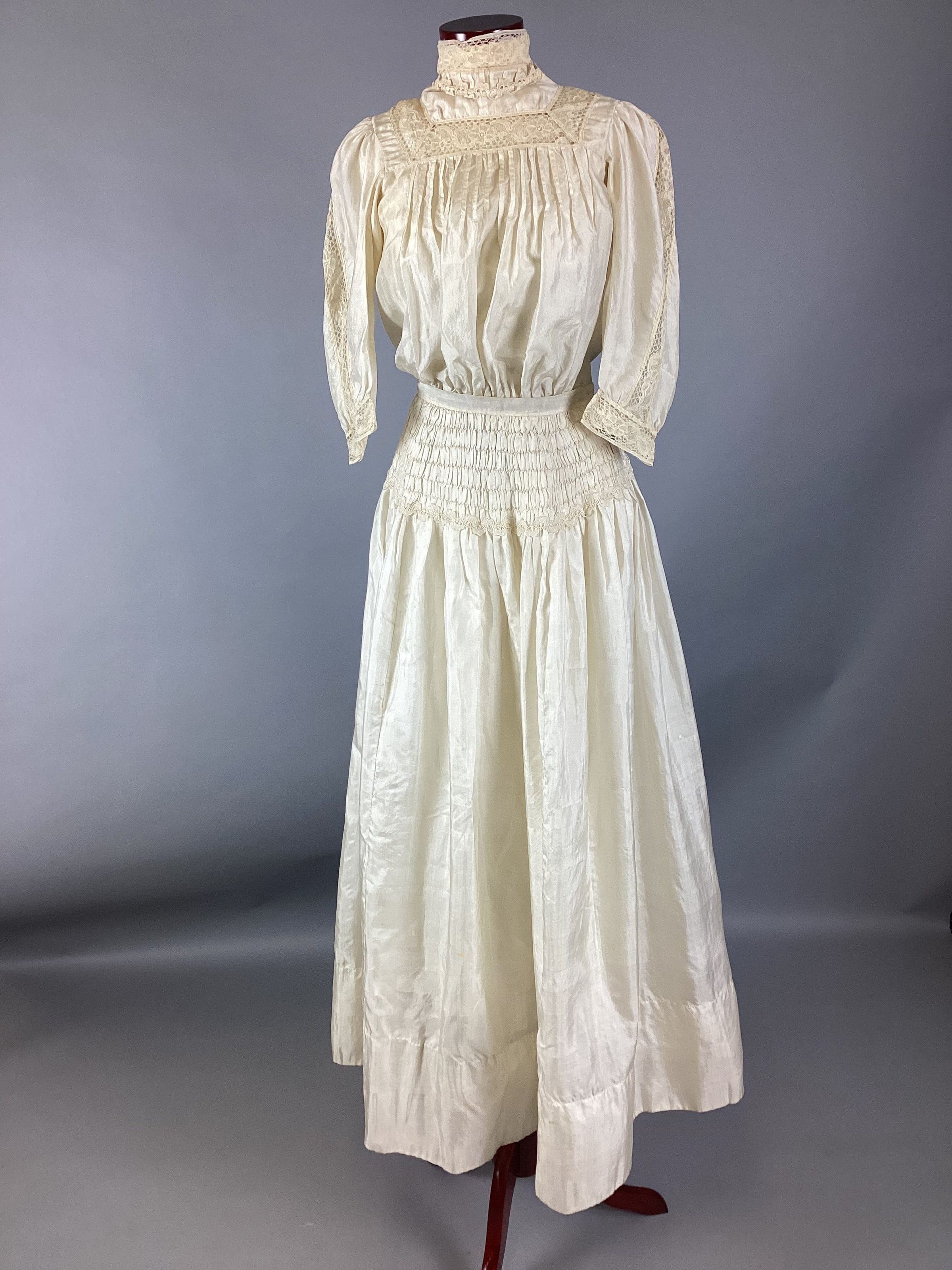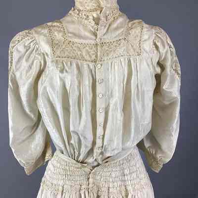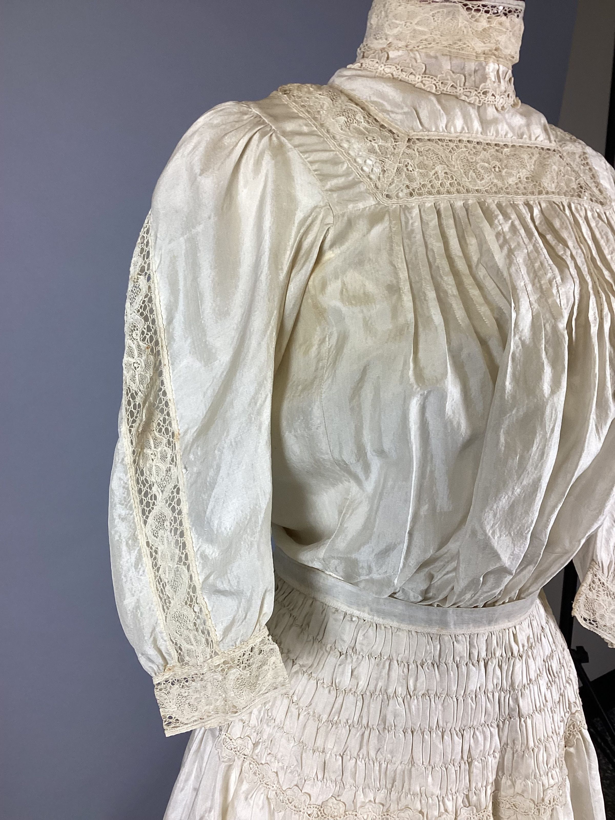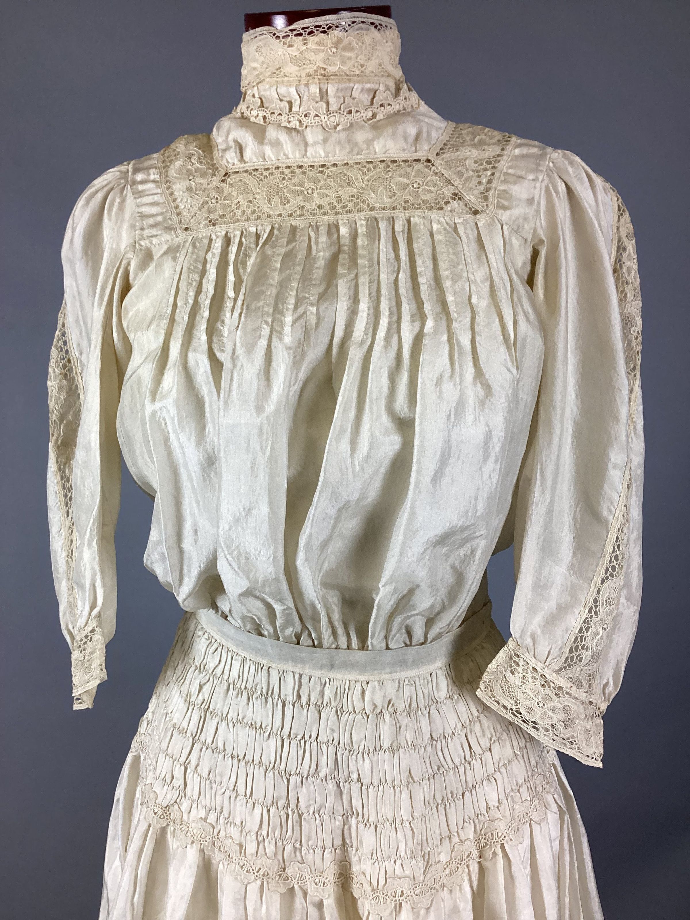 A two-piece ivory wedding dress of China silk and lace. The blouse has three-quarter-length sleeves with lace cuffs and a lace insertion down the tops of the sleeves, a high lace neckband, and a lace yoke with eighteen 1/4 in. tucks. The skirt is 40 in. long with a 6-1/2 in. hem. It is 124 in. around and gathered into a yoke at the top with seven rows of gathers, each one inch apart. The bottom row is covered in lace. Also included are two blue garter belts with crocheted insertions threaded with one inch of blue satin ribbon, two ivory silk garters, and two satin bows. Sub-numbered A-C.Use