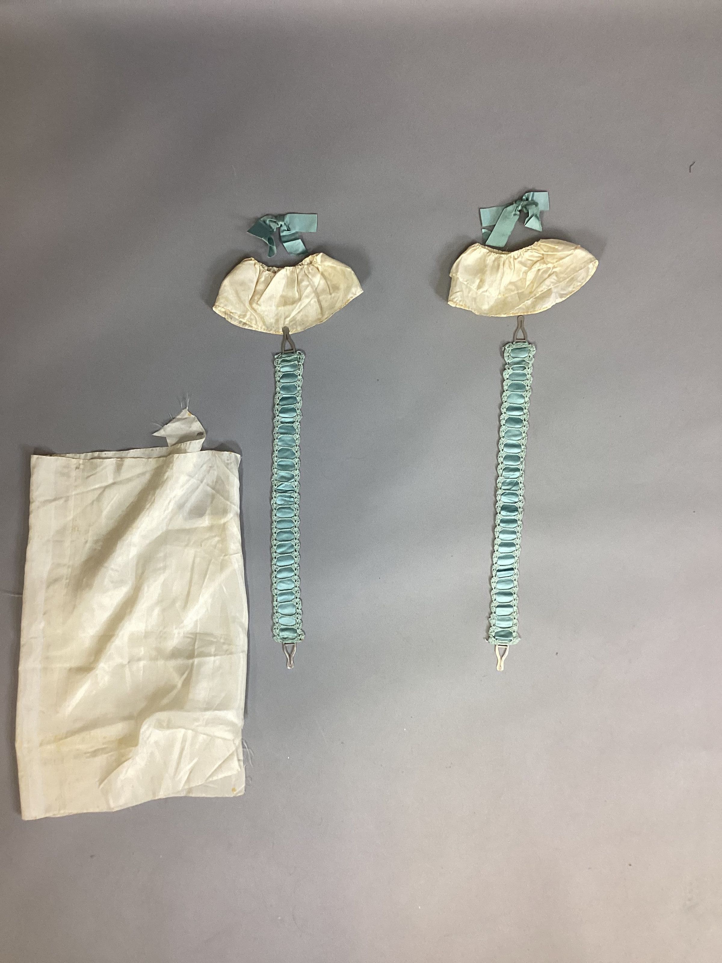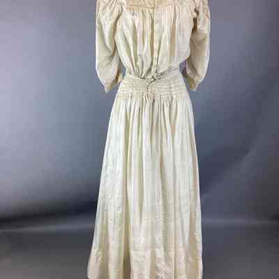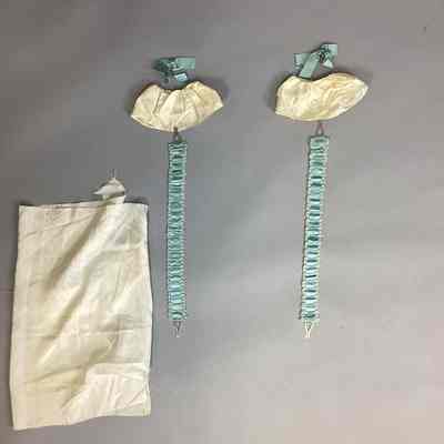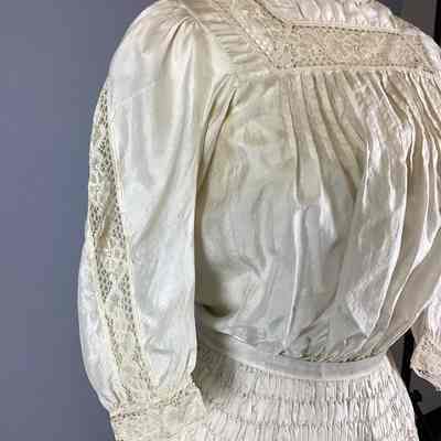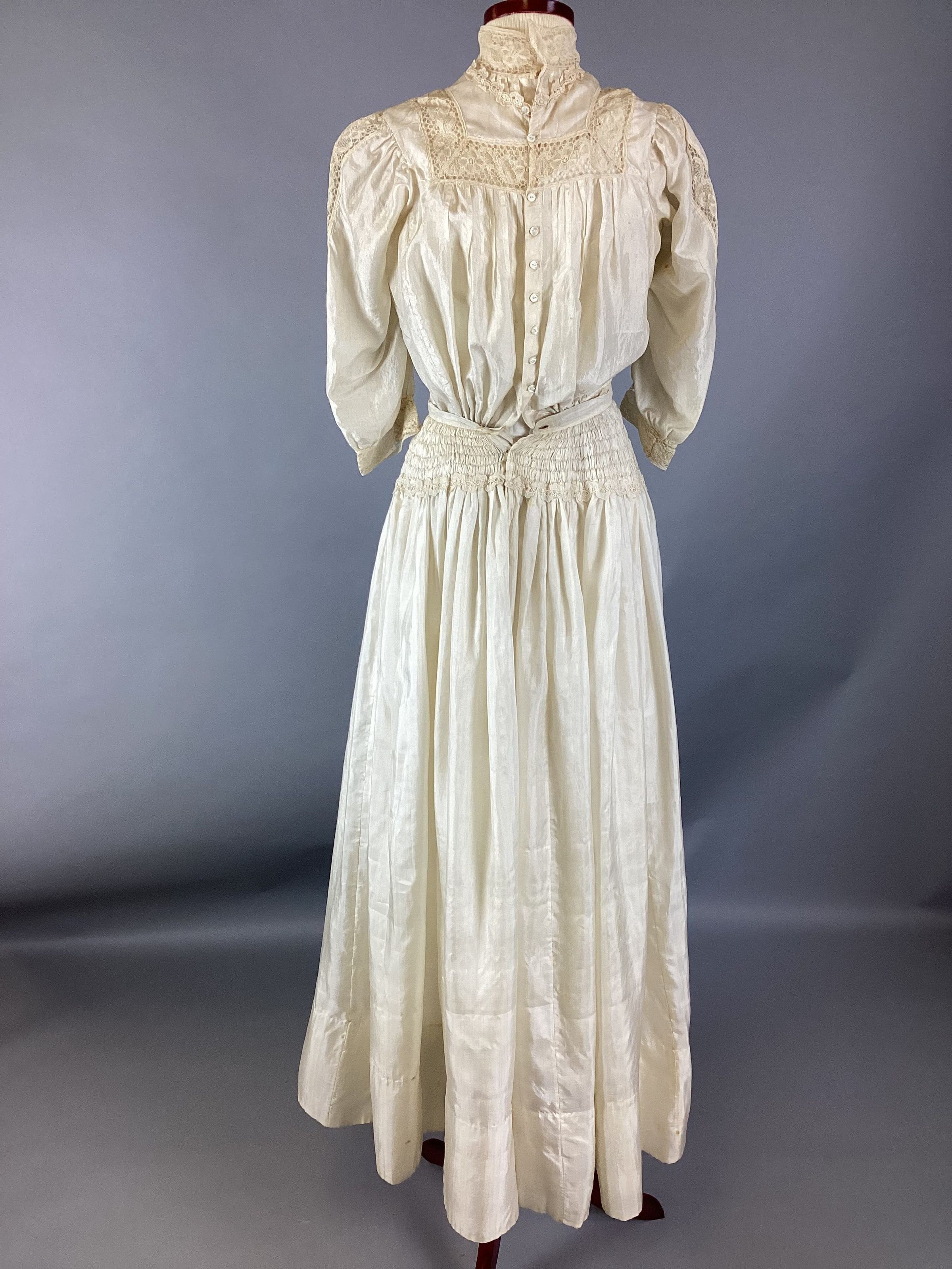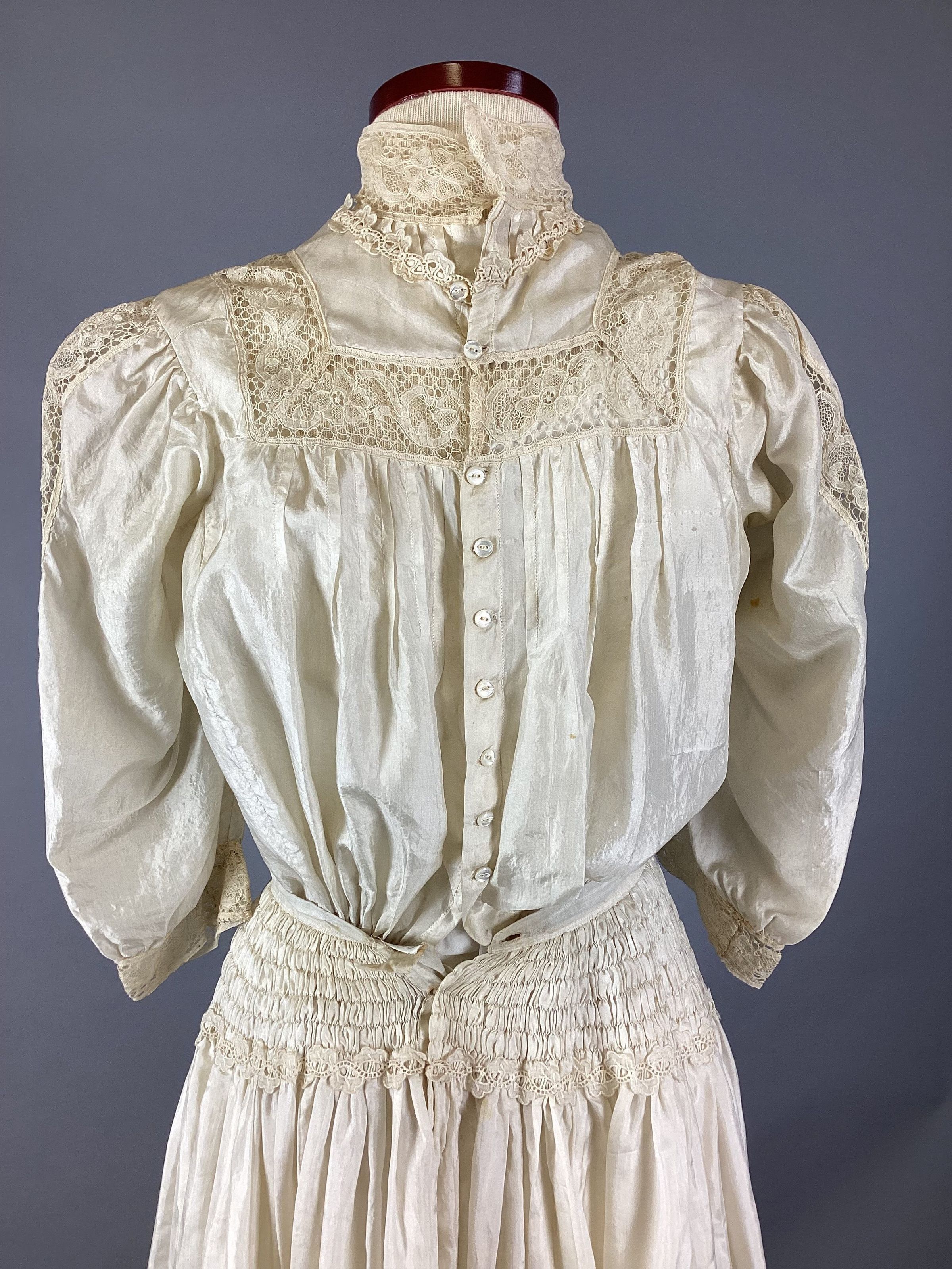 A two-piece ivory wedding dress of China silk and lace. The blouse has three-quarter-length sleeves with lace cuffs and a lace insertion down the tops of the sleeves, a high lace neckband, and a lace yoke with eighteen 1/4 in. tucks. The skirt is 40 in. long with a 6-1/2 in. hem. It is 124 in. around and gathered into a yoke at the top with seven rows of gathers, each one inch apart. The bottom row is covered in lace. Also included are two blue garter belts with crocheted insertions threaded with one inch of blue satin ribbon, two ivory silk garters, and two satin bows. Sub-numbered A-C.Use
