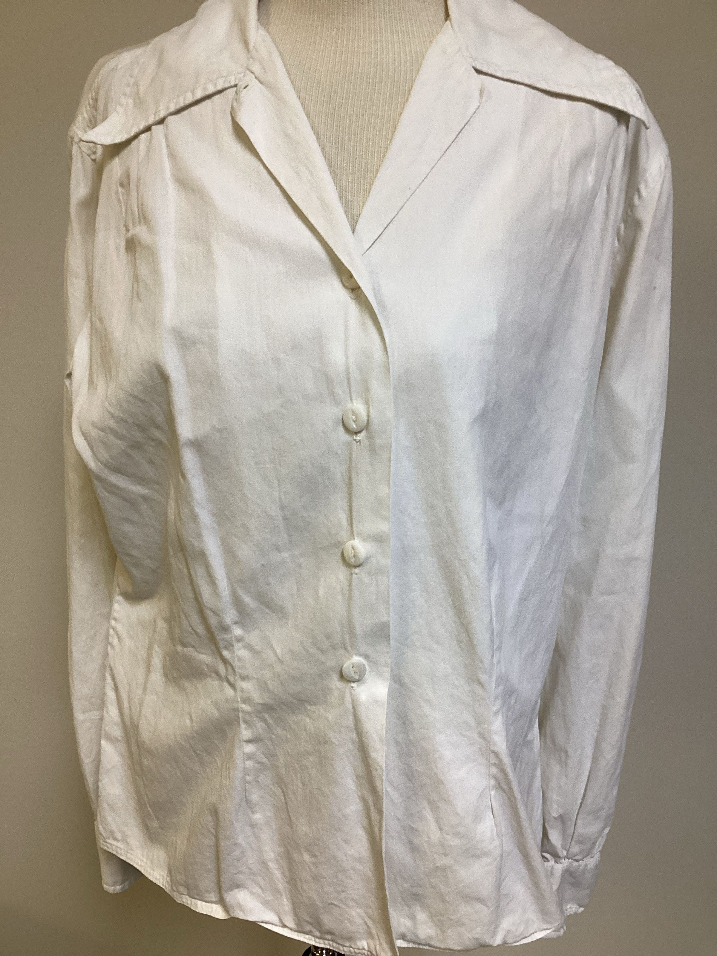 White cotton woman’s military shirt, log sleeved with 4 white buttons in front for closure.Collection