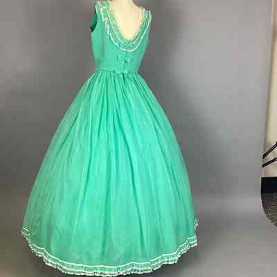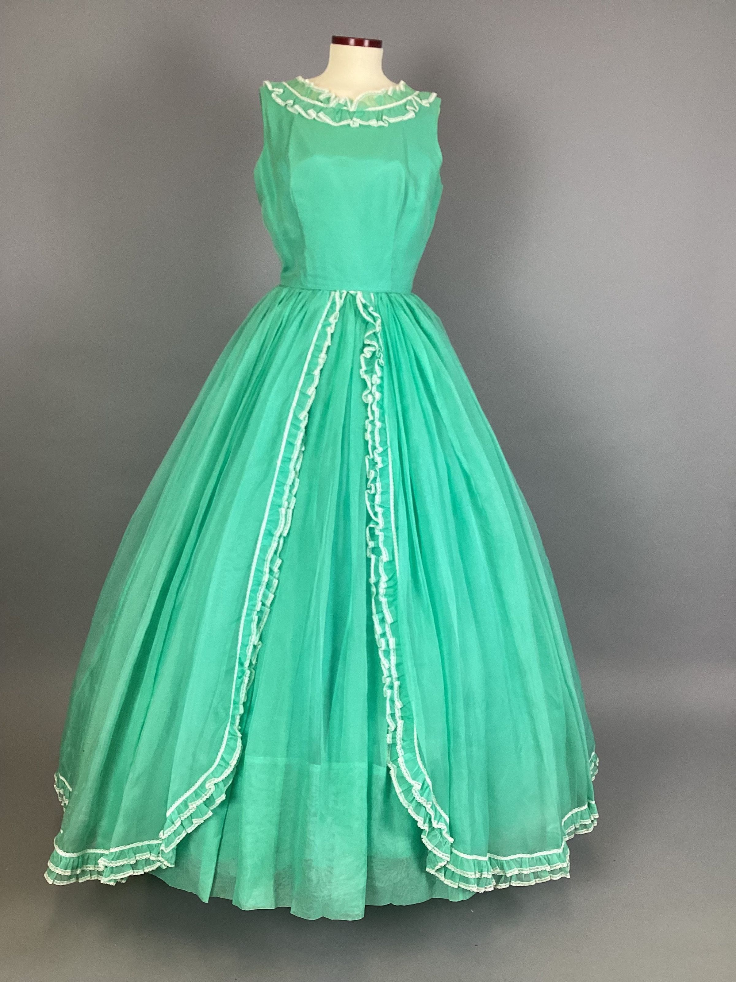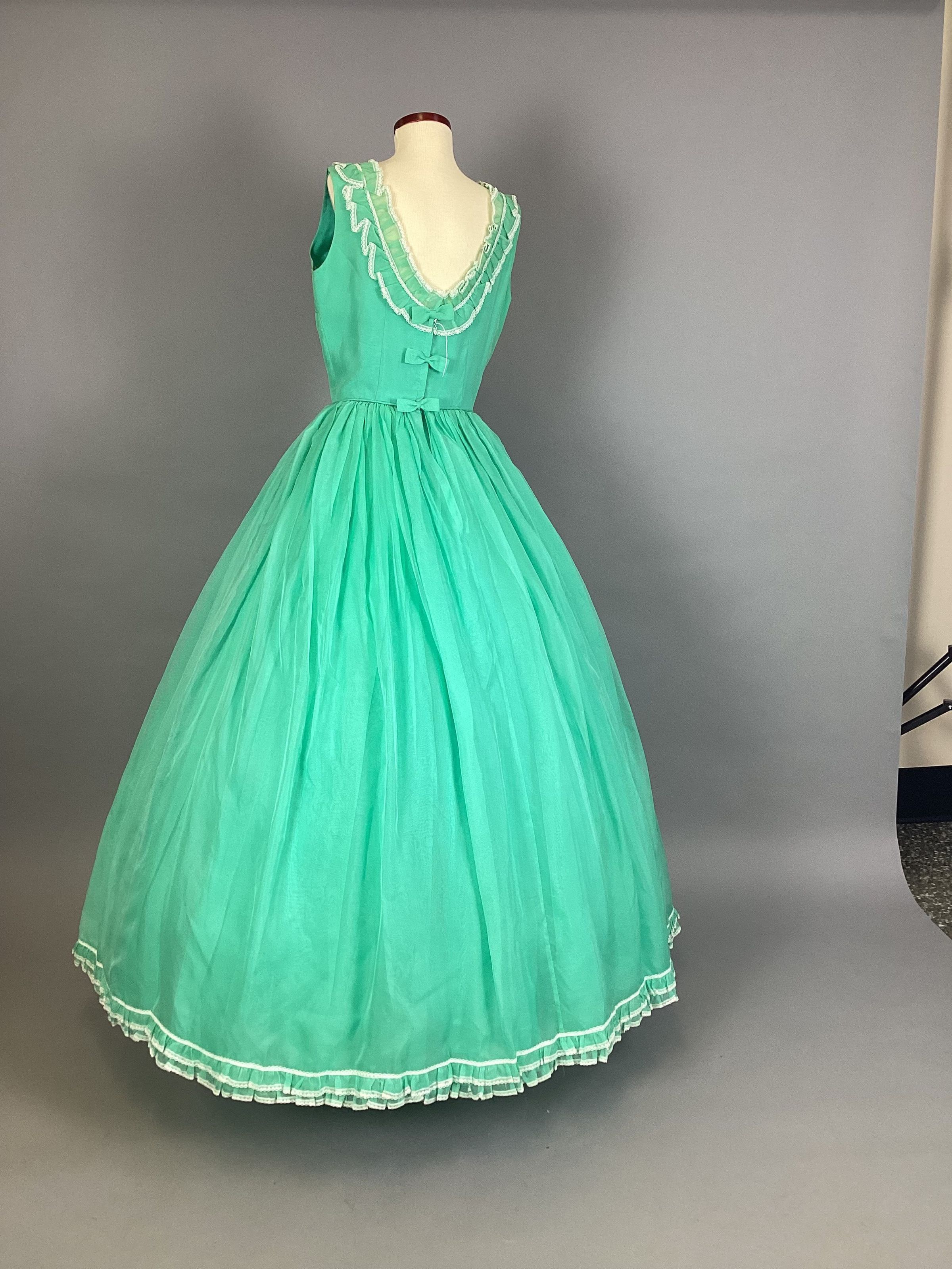 A single-shade green gown with a ruffled scoop-neck collar and no sleeves. The long skirt includes two ruffled overlays at the center. The ruffles of the collar and overlays are edged in white. Three bows disguise the dress's zipper closure at the back.Use