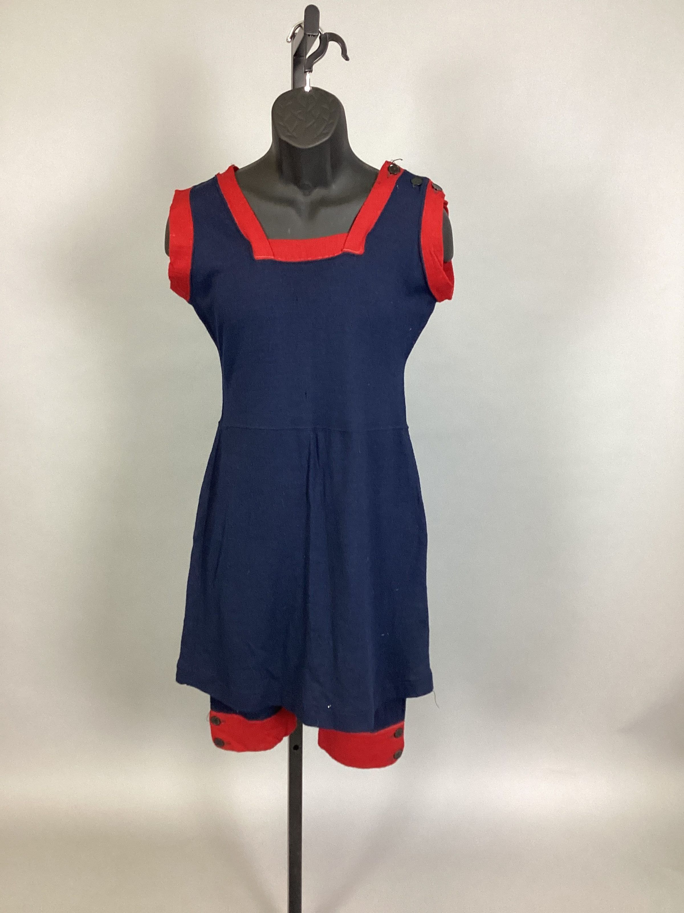 Woman's bathing suit; black trimmed with 1" red binding around neck, and sleeve openings; has a black overskirt and below the knee length legs; bottom of legs are bound with a 3" red band; cuffs of legs are buttoned with 2 black buttons and one shoulder buttons with 3/4" black buttons; garment is machine sewed.Use
