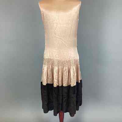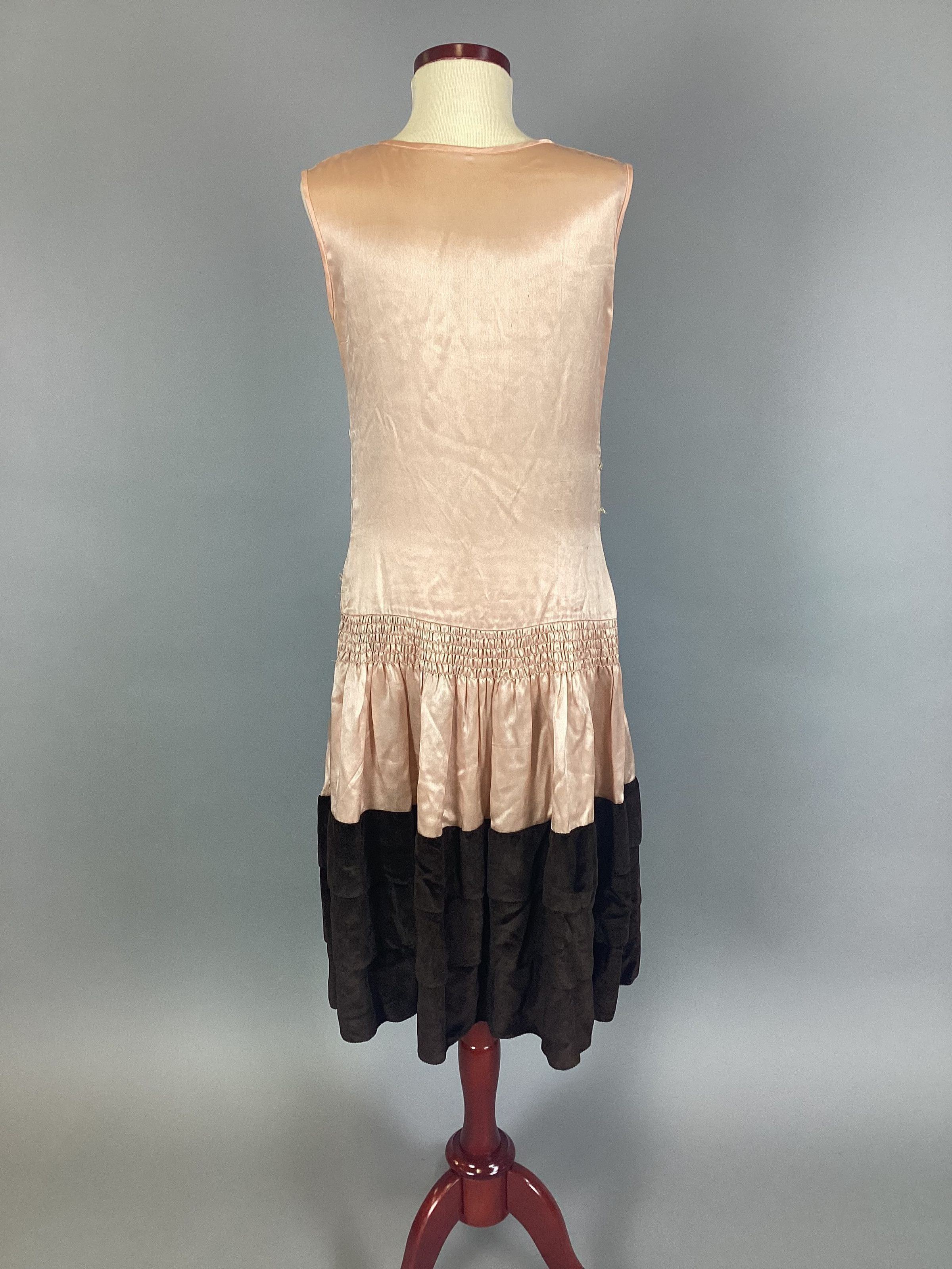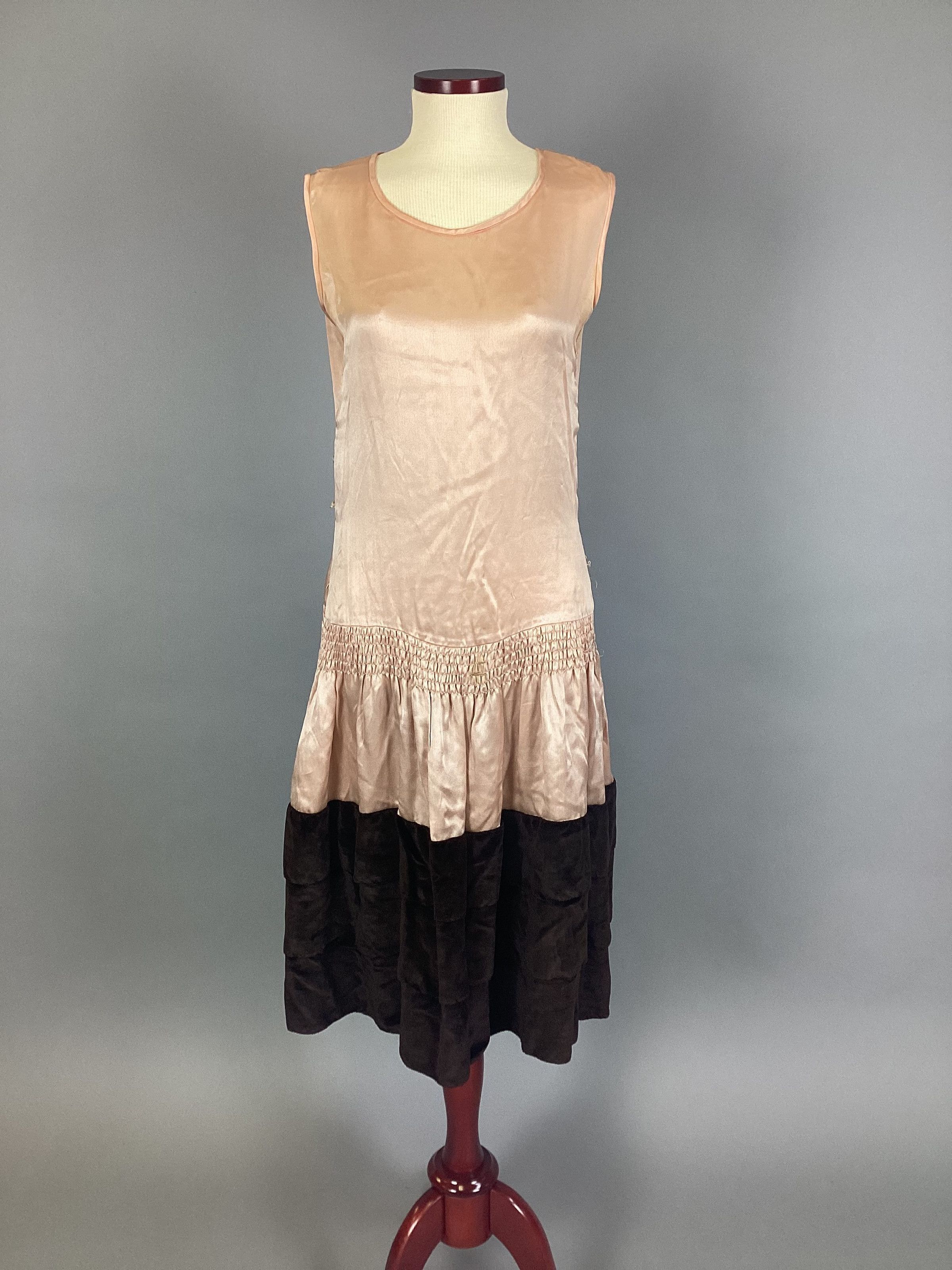 A sleevless, drop-waist dress with a peach satin top and a brown velvet tiered skirt.Use